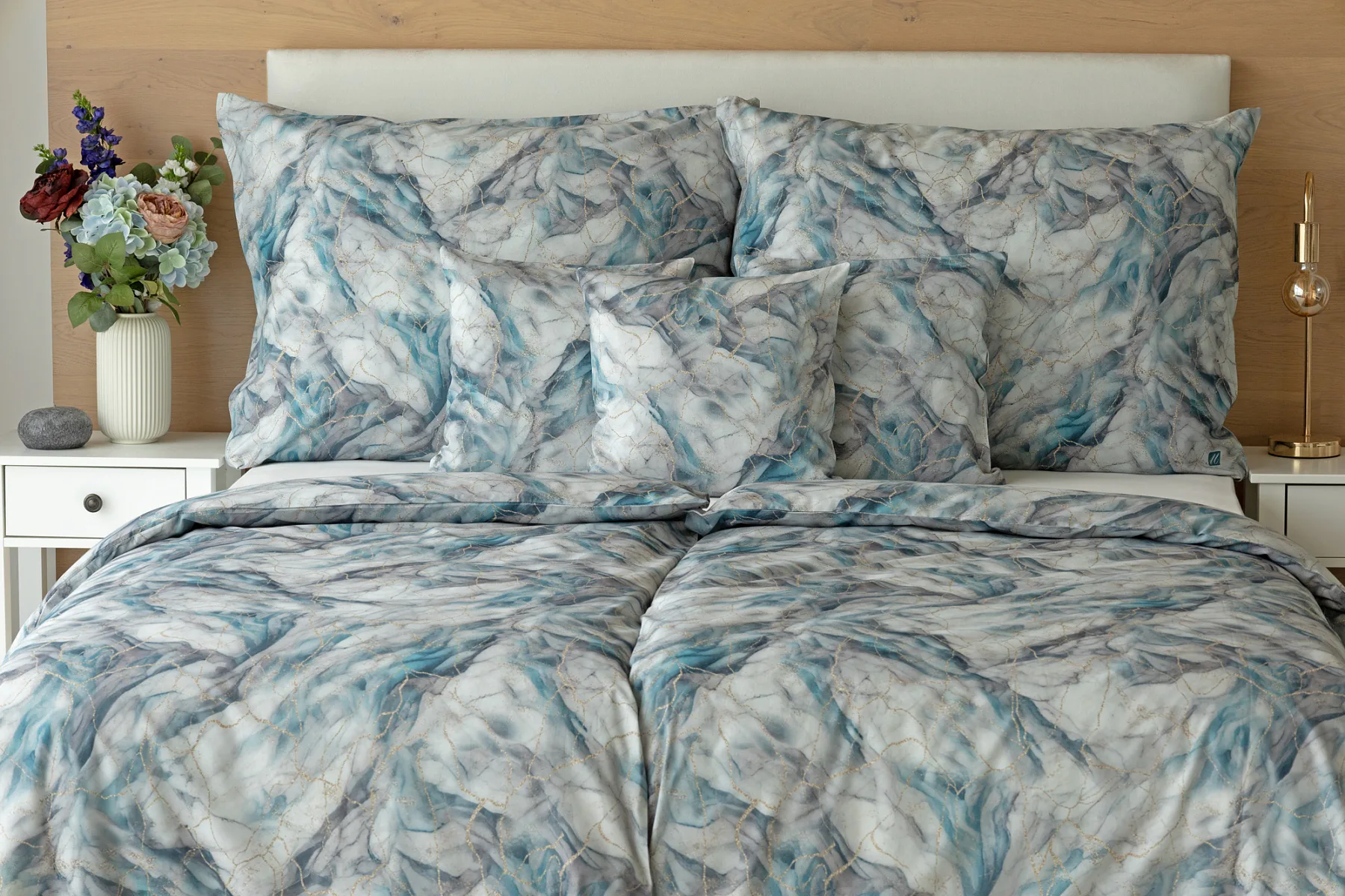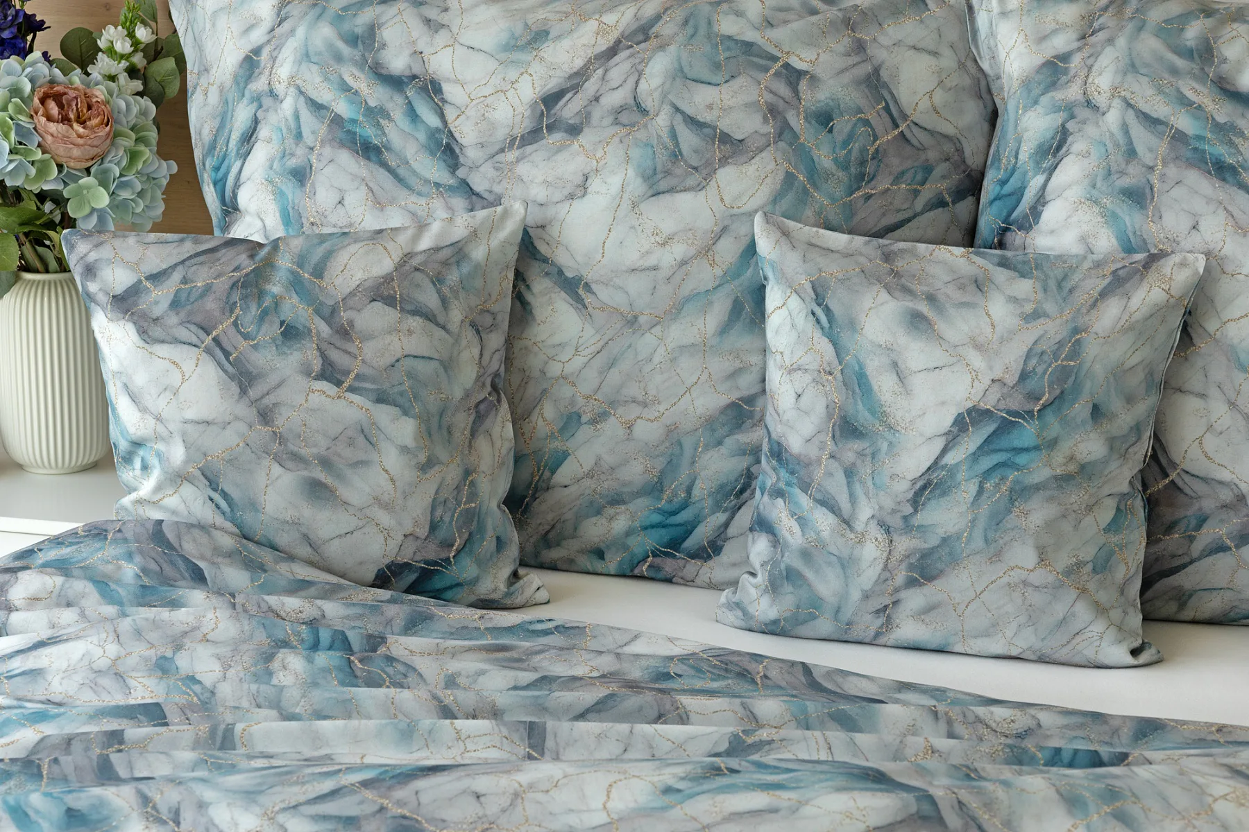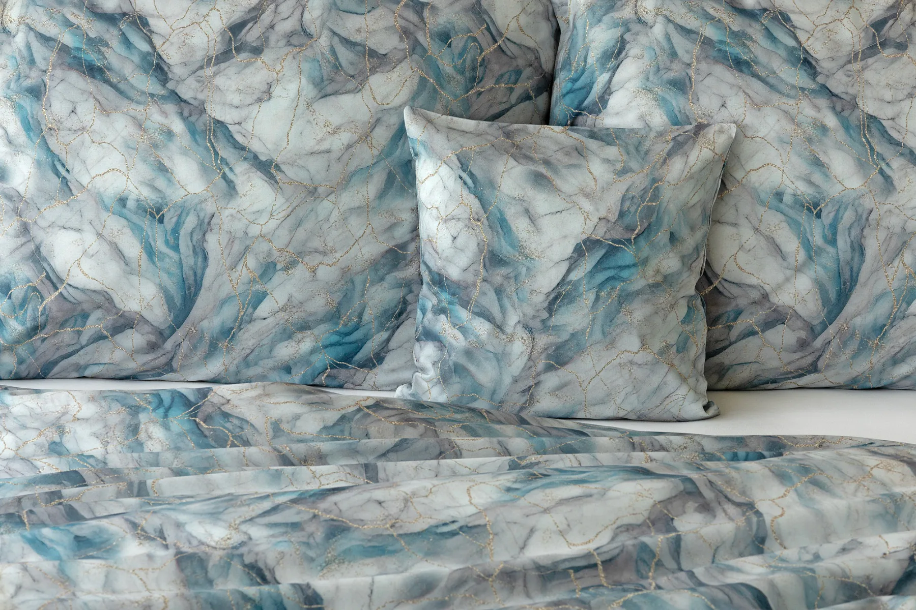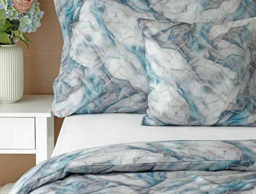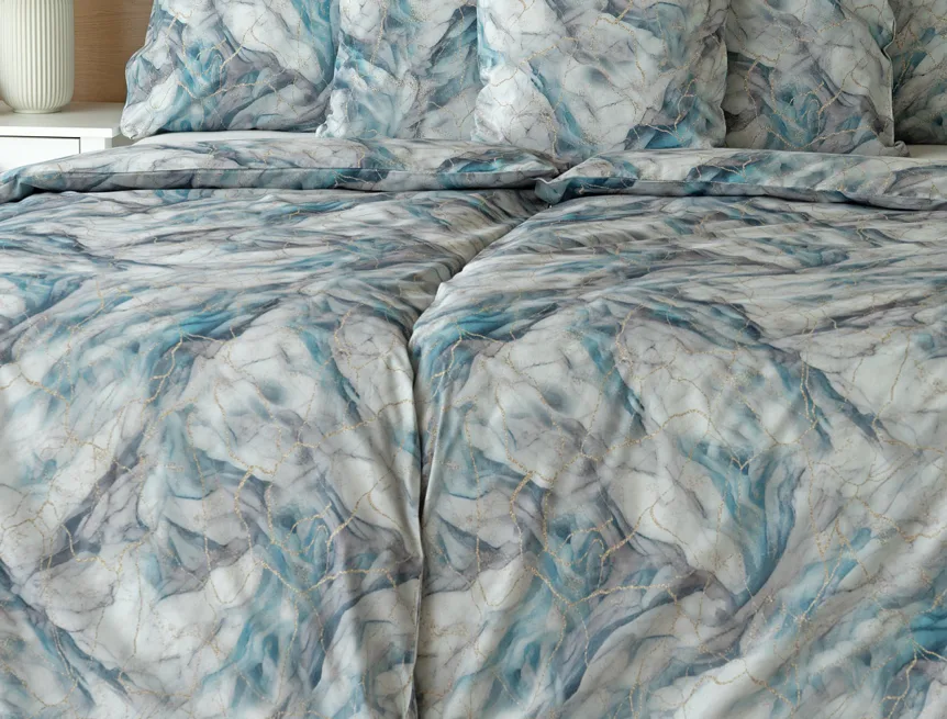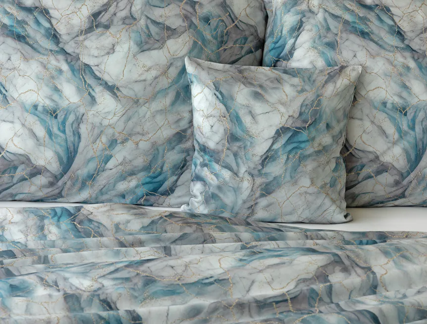 Pokud nejste vyznavačem květin a motýlů, probuďte svou ložnici s magickým povlečením Azaro. Poutavý mramorový design v paletě šedých, petrolejových a azurových tónů rozzáří každou ložnici. Atraktivitu vzoru podtrhuje zlatavá linka, která protíná motiv po celé ploše. Díky nejmodernějšímu digitálním tisku vyniká vzor v precizním detailu.