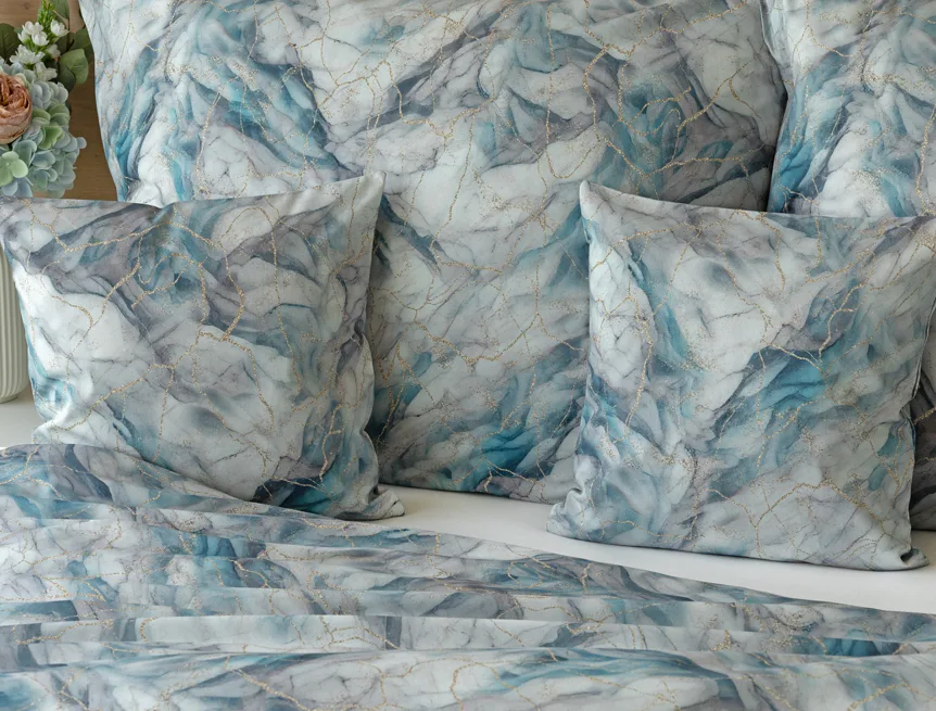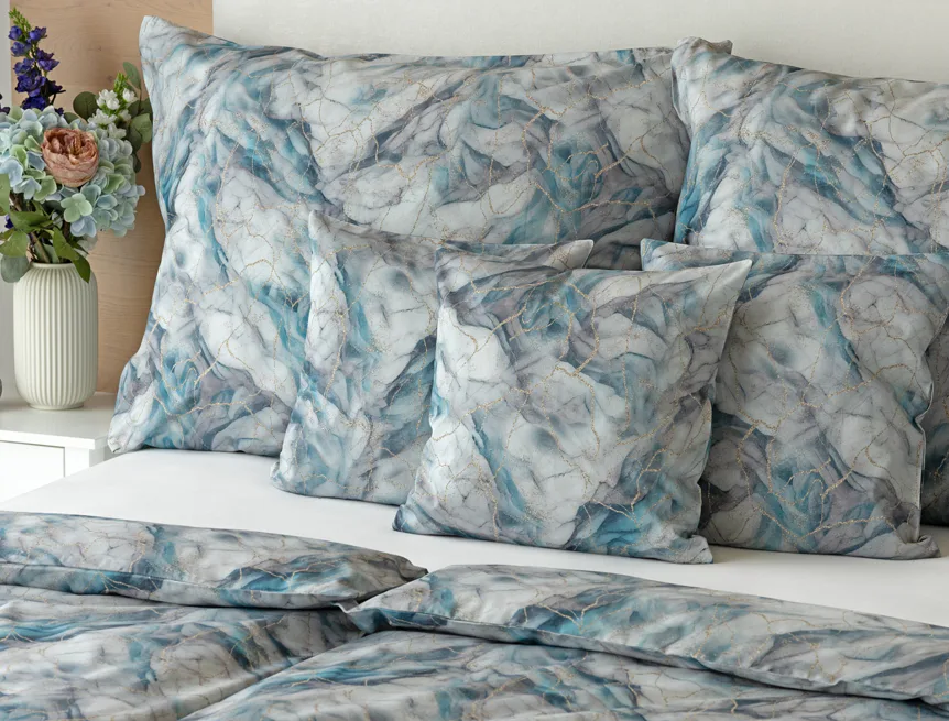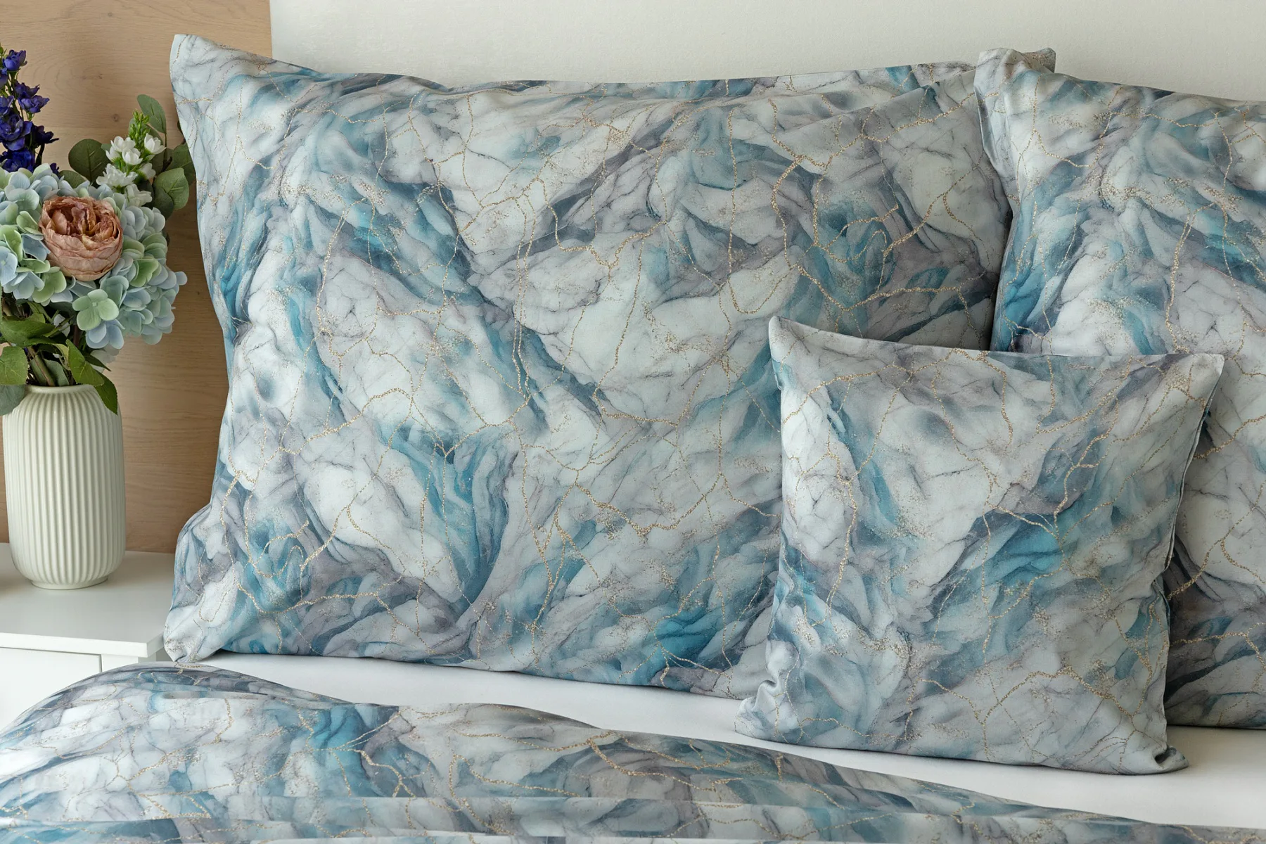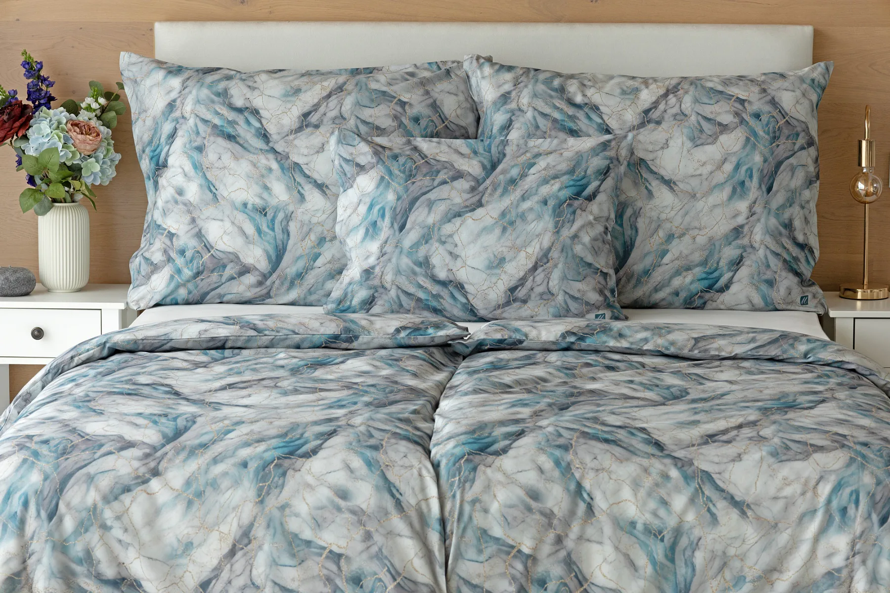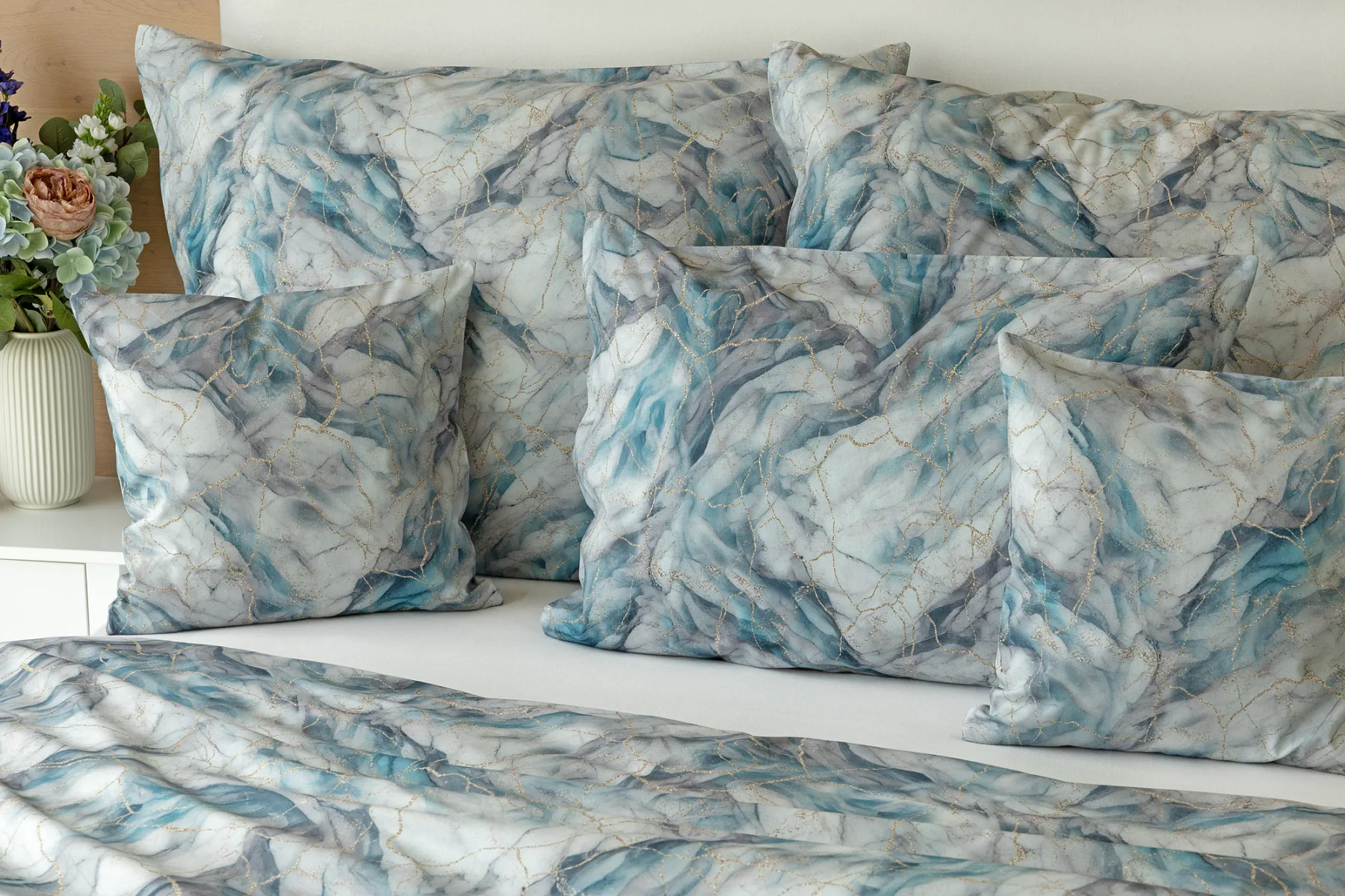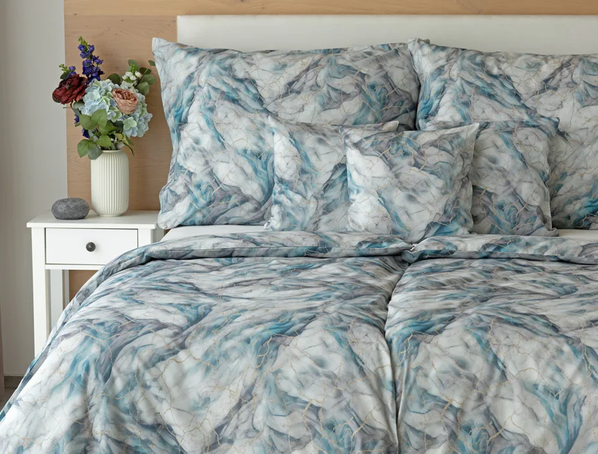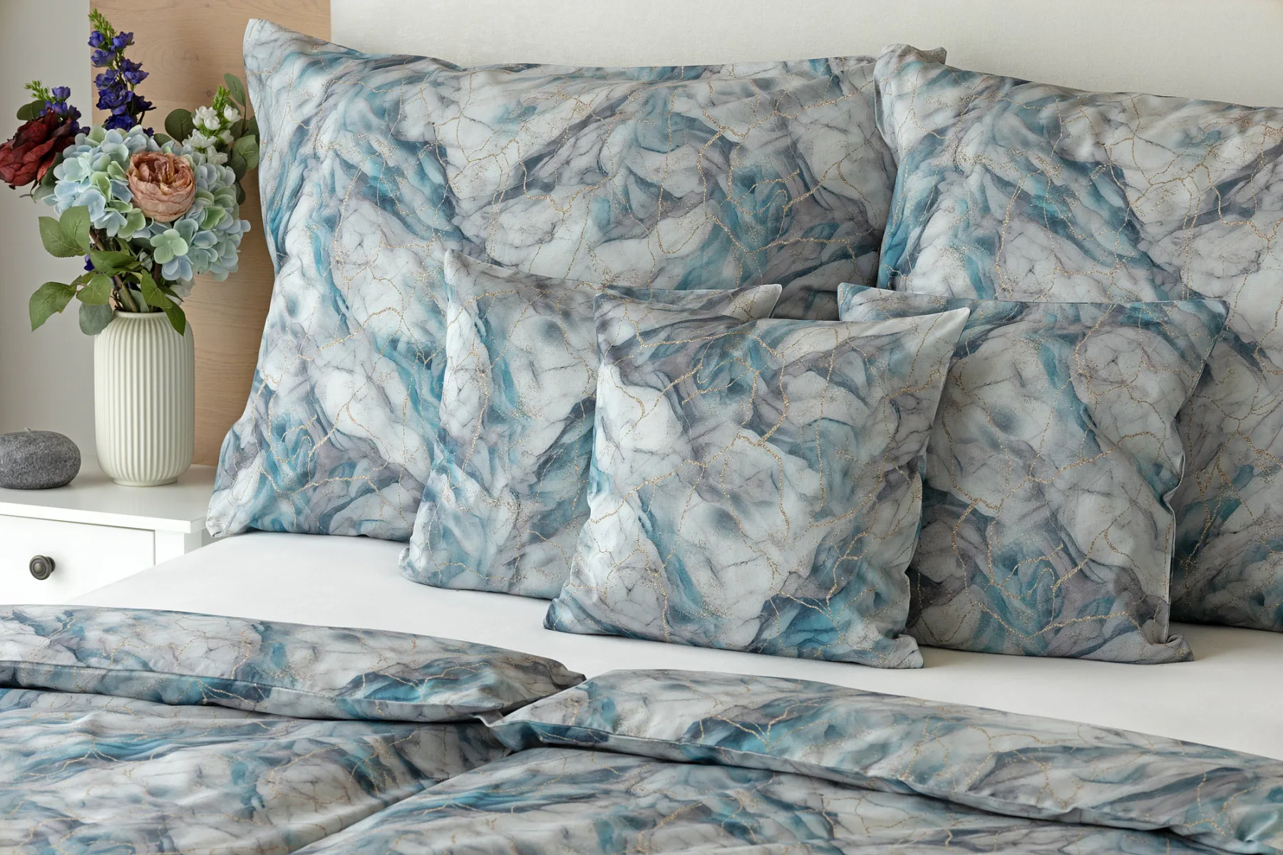 Pokud nejste vyznavačem květin a motýlů, probuďte svou ložnici s magickým povlečením Azaro. Poutavý mramorový design v paletě šedých, petrolejových a azurových tónů rozzáří každou ložnici. Atraktivitu vzoru podtrhuje zlatavá linka, která protíná motiv po celé ploše. Díky nejmodernějšímu digitálním tisku vyniká vzor v precizním detailu.