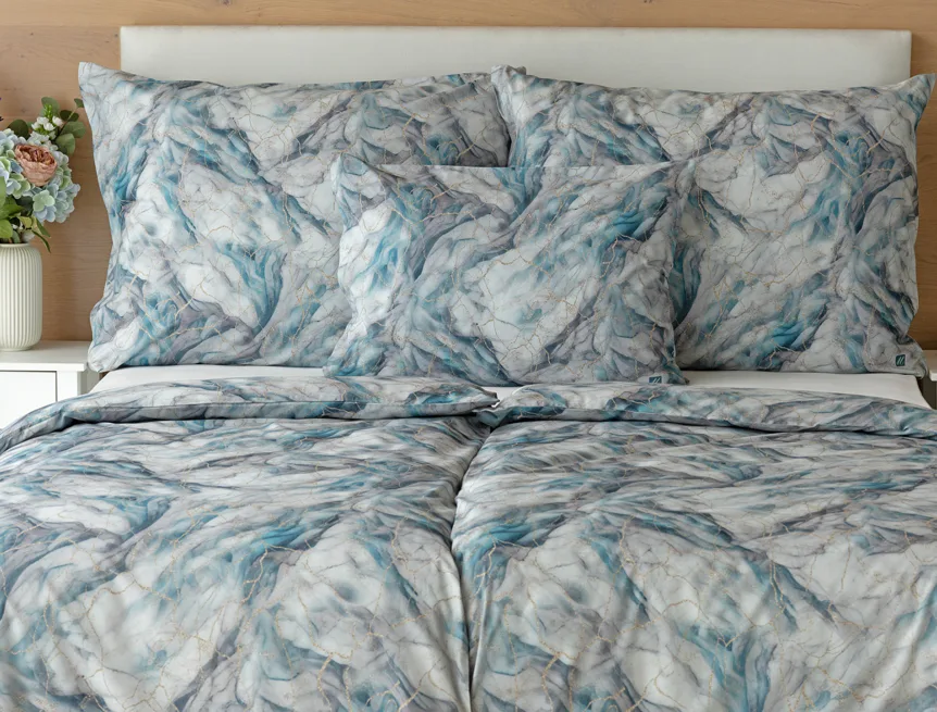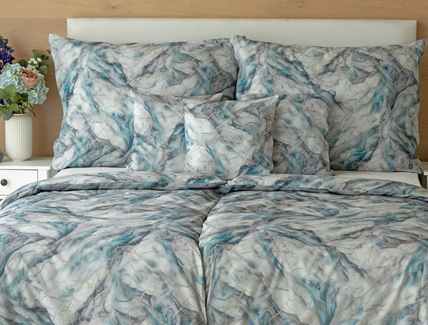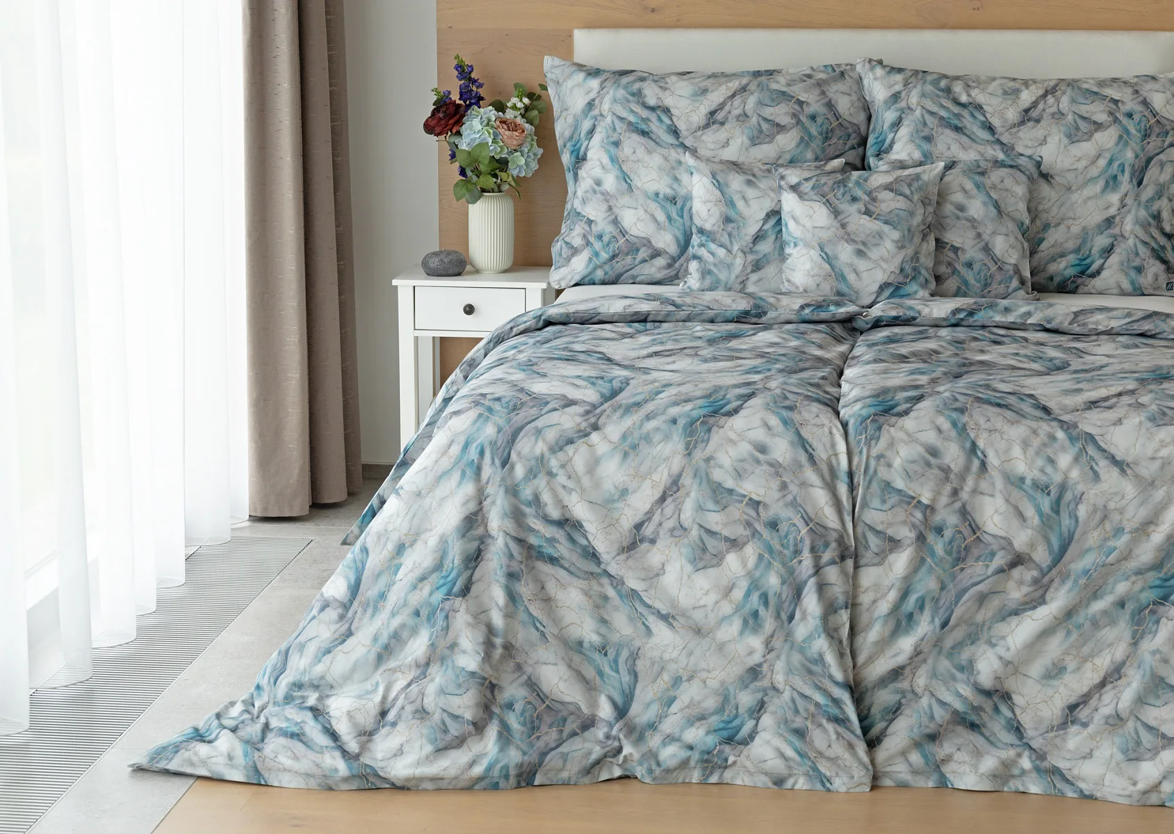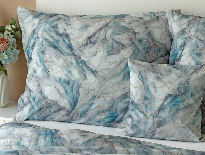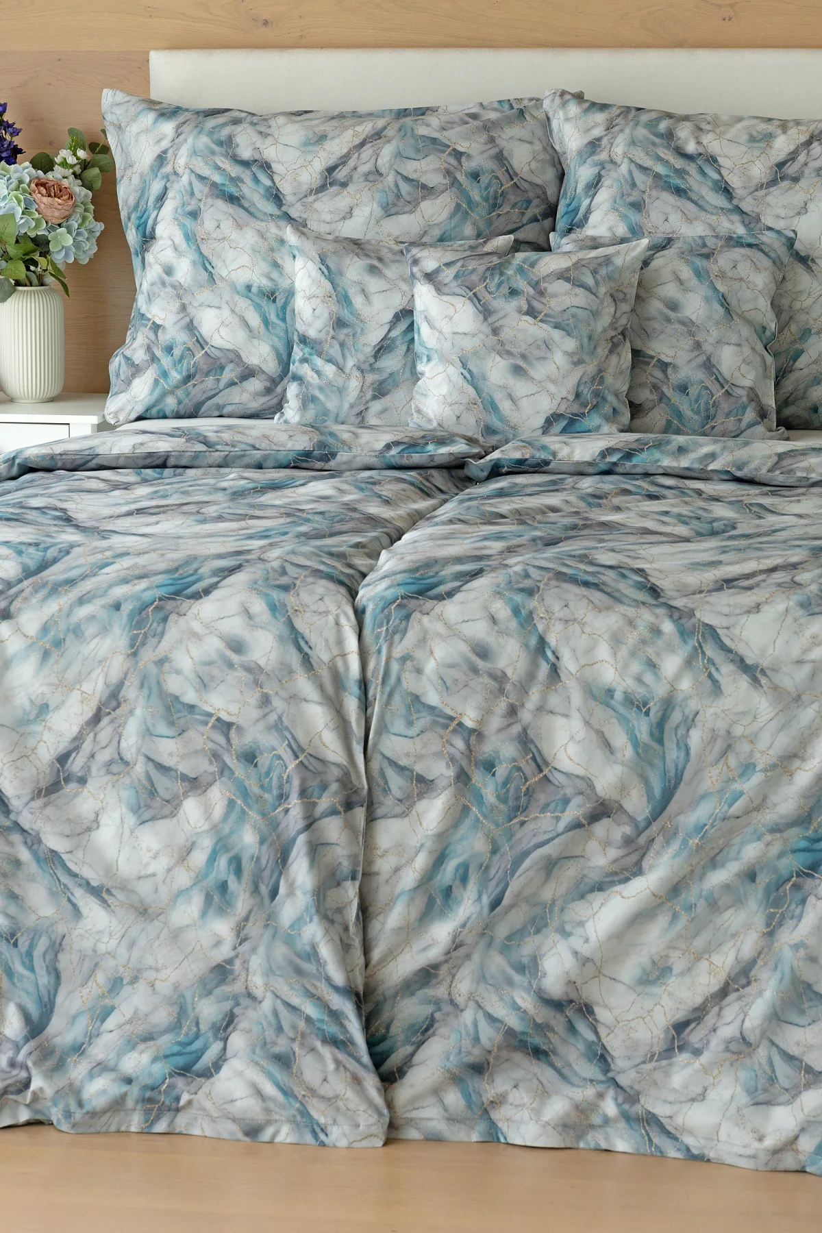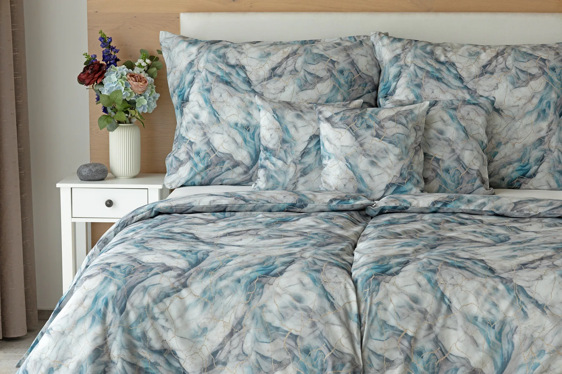 Pokud nejste vyznavačem květin a motýlů, probuďte svou ložnici s magickým povlečením Azaro. Poutavý mramorový design v paletě šedých, petrolejových a azurových tónů rozzáří každou ložnici. Atraktivitu vzoru podtrhuje zlatavá linka, která protíná motiv po celé ploše. Díky nejmodernějšímu digitálním tisku vyniká vzor v precizním detailu.