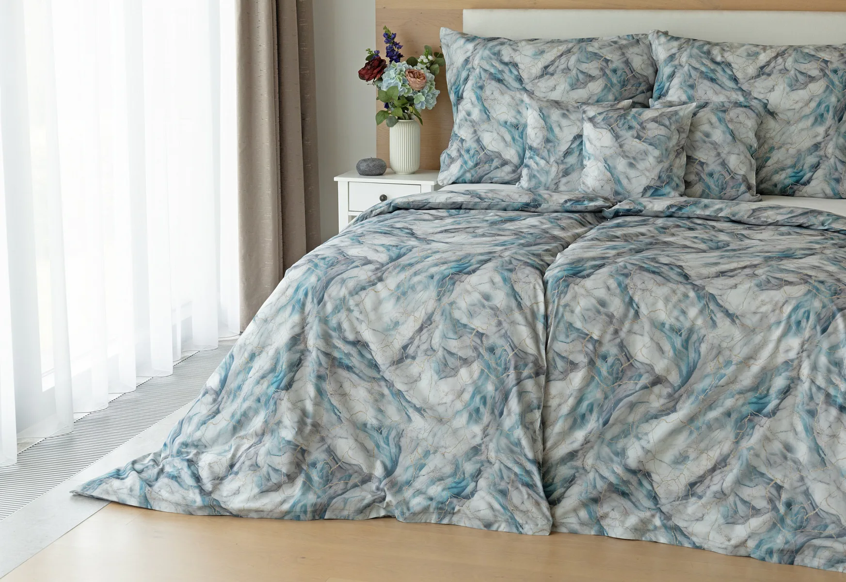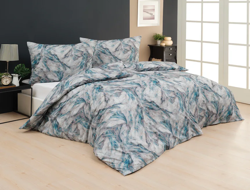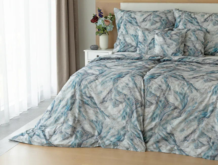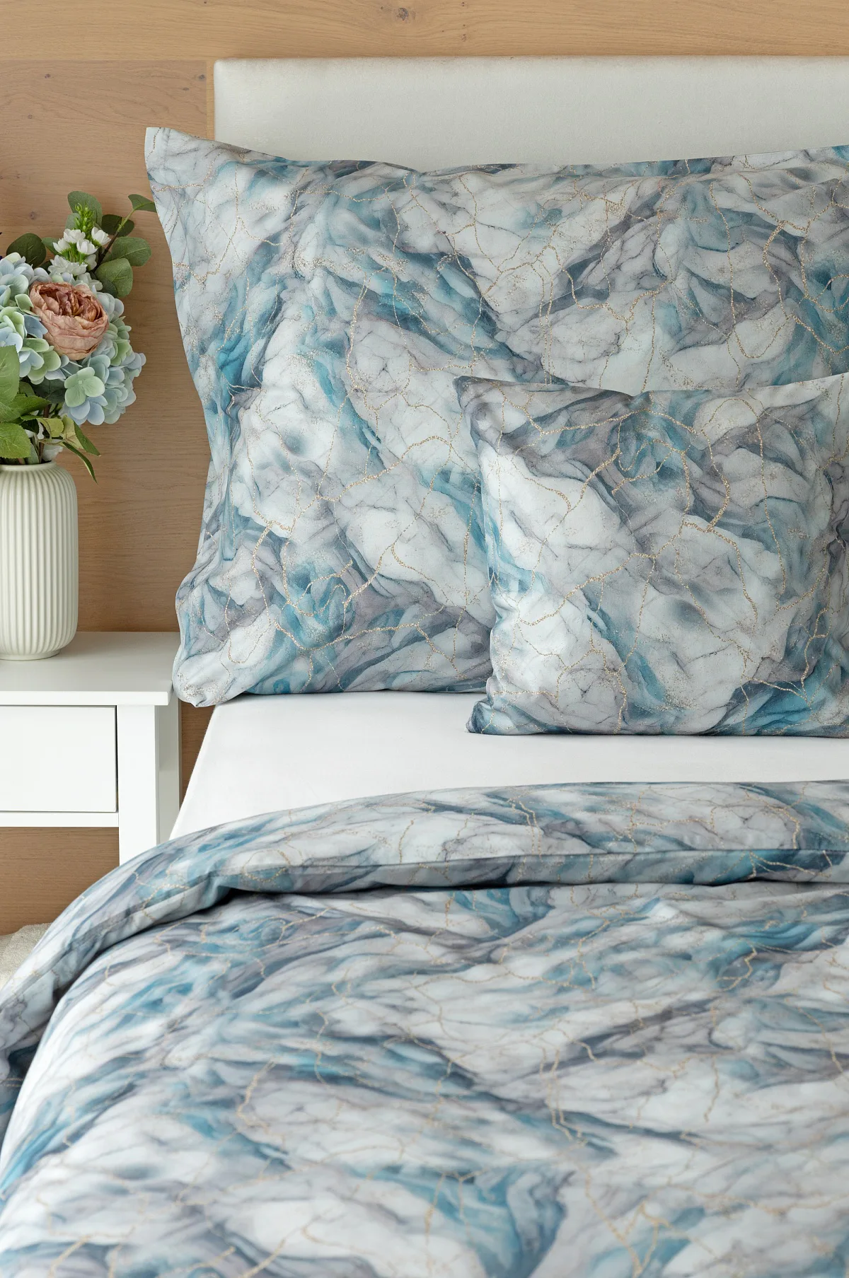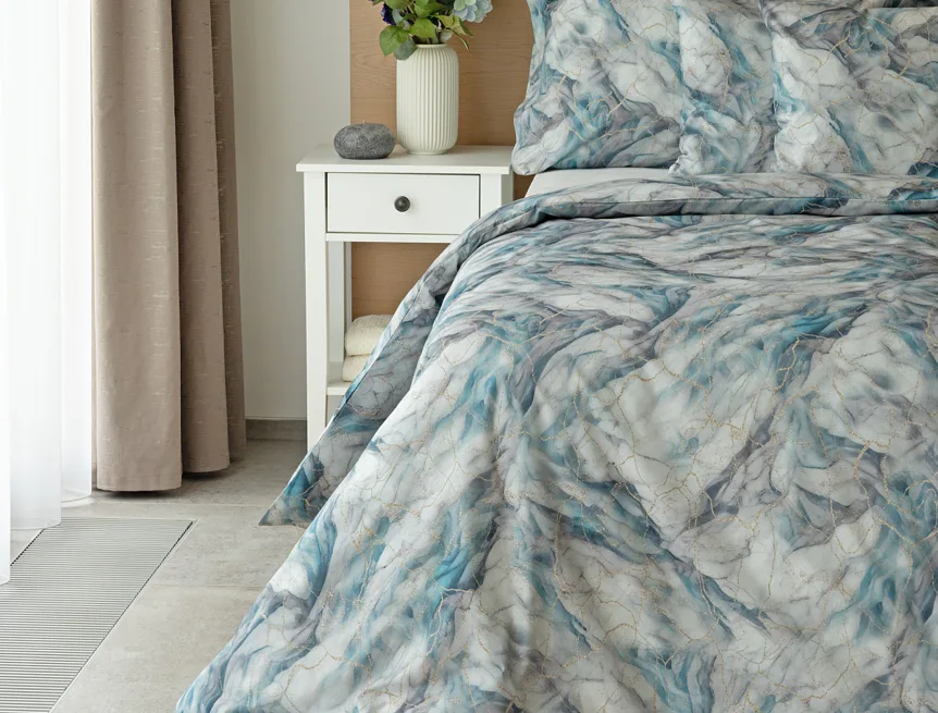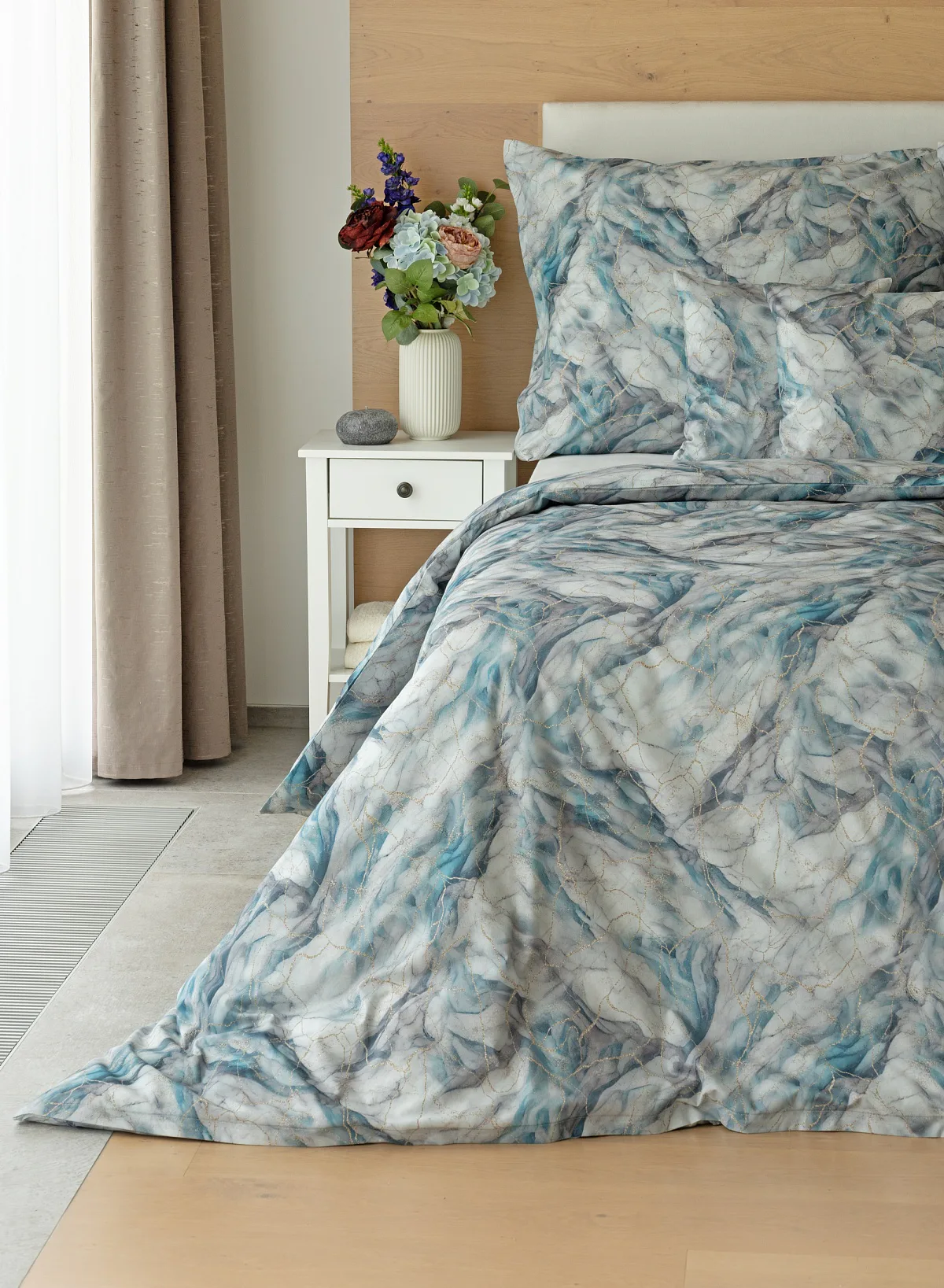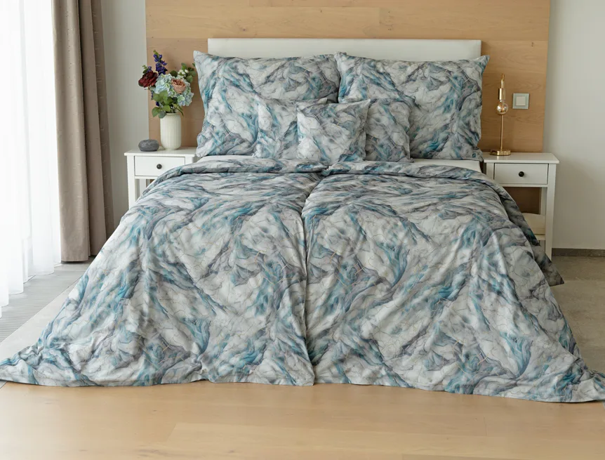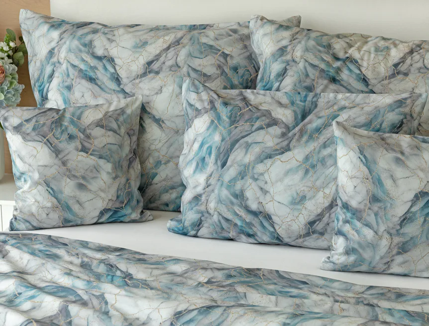 Pokud nejste vyznavačem květin a motýlů, probuďte svou ložnici s magickým povlečením Azaro. Poutavý mramorový design v paletě šedých, petrolejových a azurových tónů rozzáří každou ložnici. Atraktivitu vzoru podtrhuje zlatavá linka, která protíná motiv po celé ploše. Díky nejmodernějšímu digitálním tisku vyniká vzor v precizním detailu.