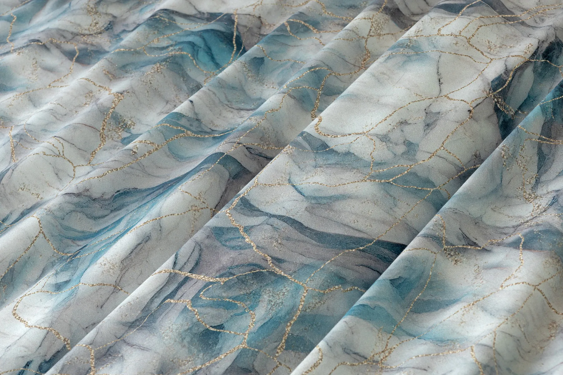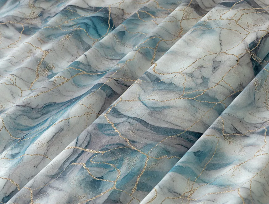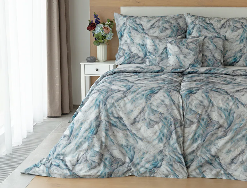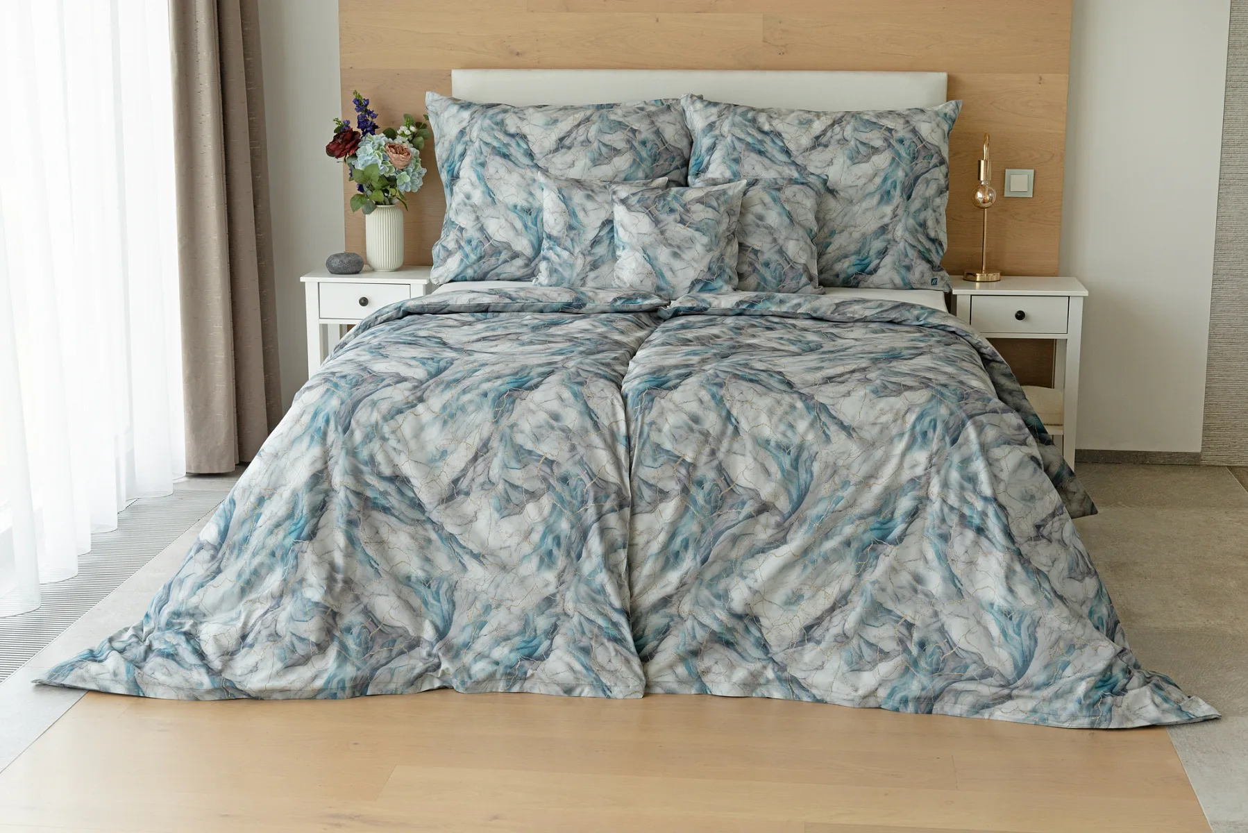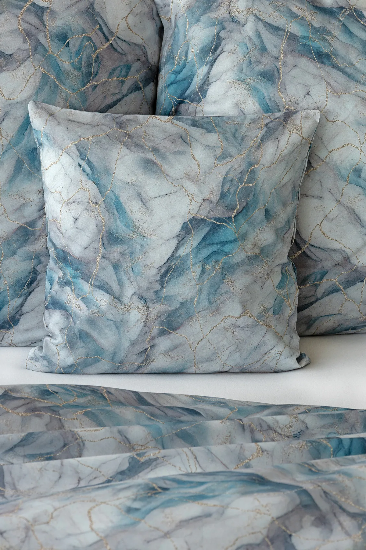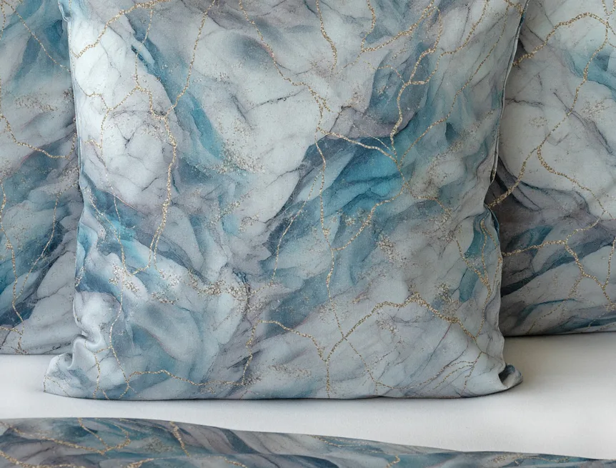 Pokud nejste vyznavačem květin a motýlů, probuďte svou ložnici s magickým povlečením Azaro. Poutavý mramorový design v paletě šedých, petrolejových a azurových tónů rozzáří každou ložnici. Atraktivitu vzoru podtrhuje zlatavá linka, která protíná motiv po celé ploše. Díky nejmodernějšímu digitálním tisku vyniká vzor v precizním detailu.