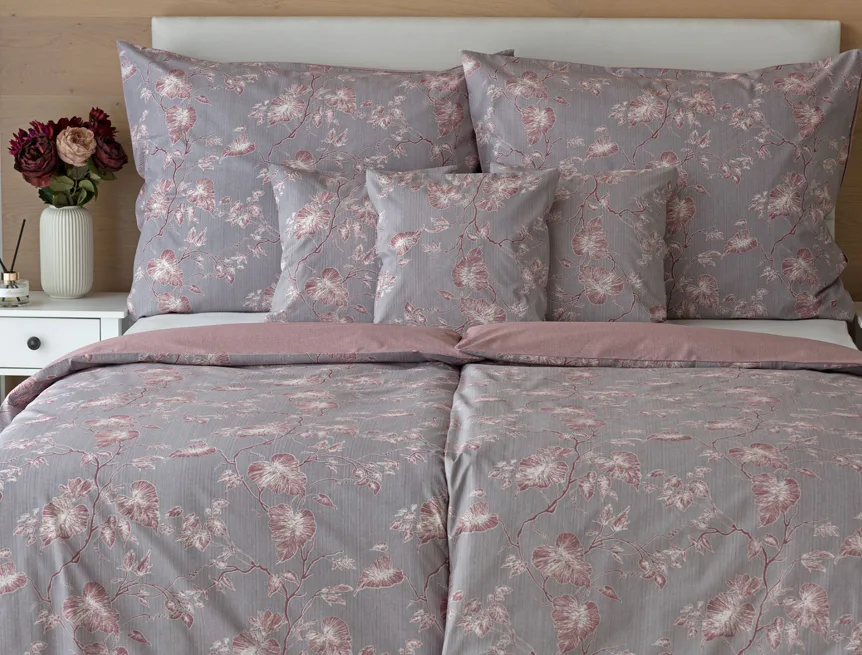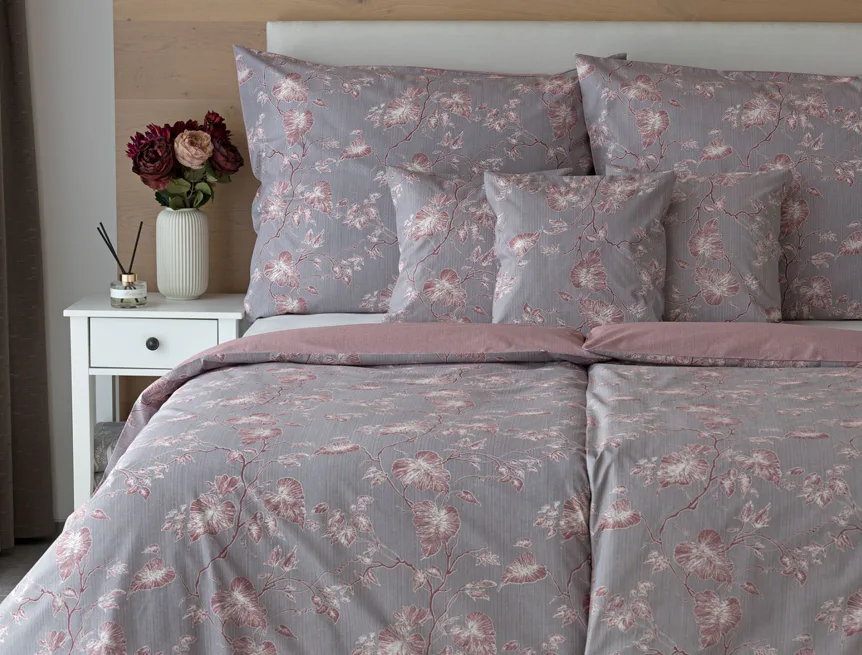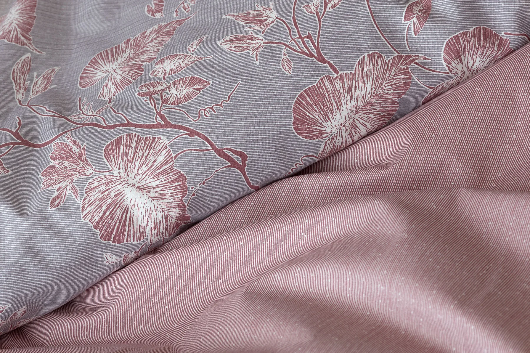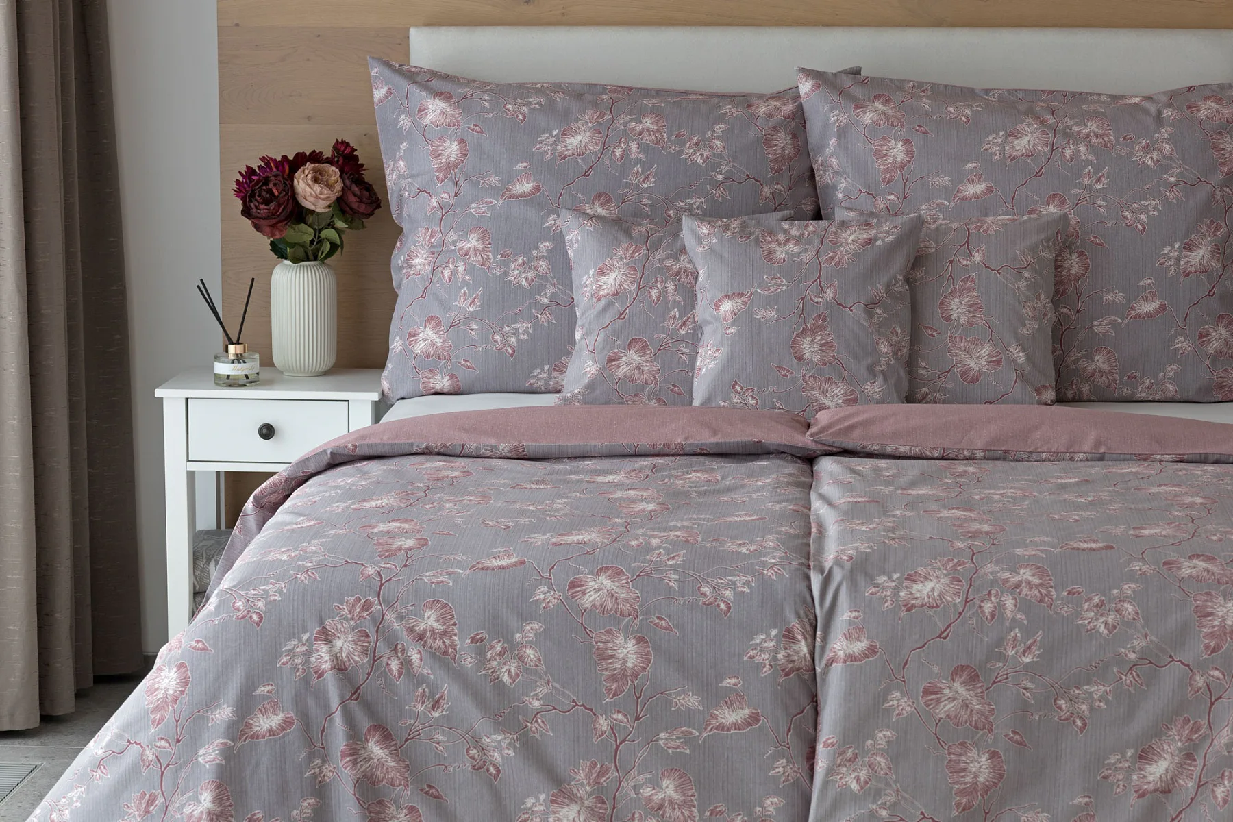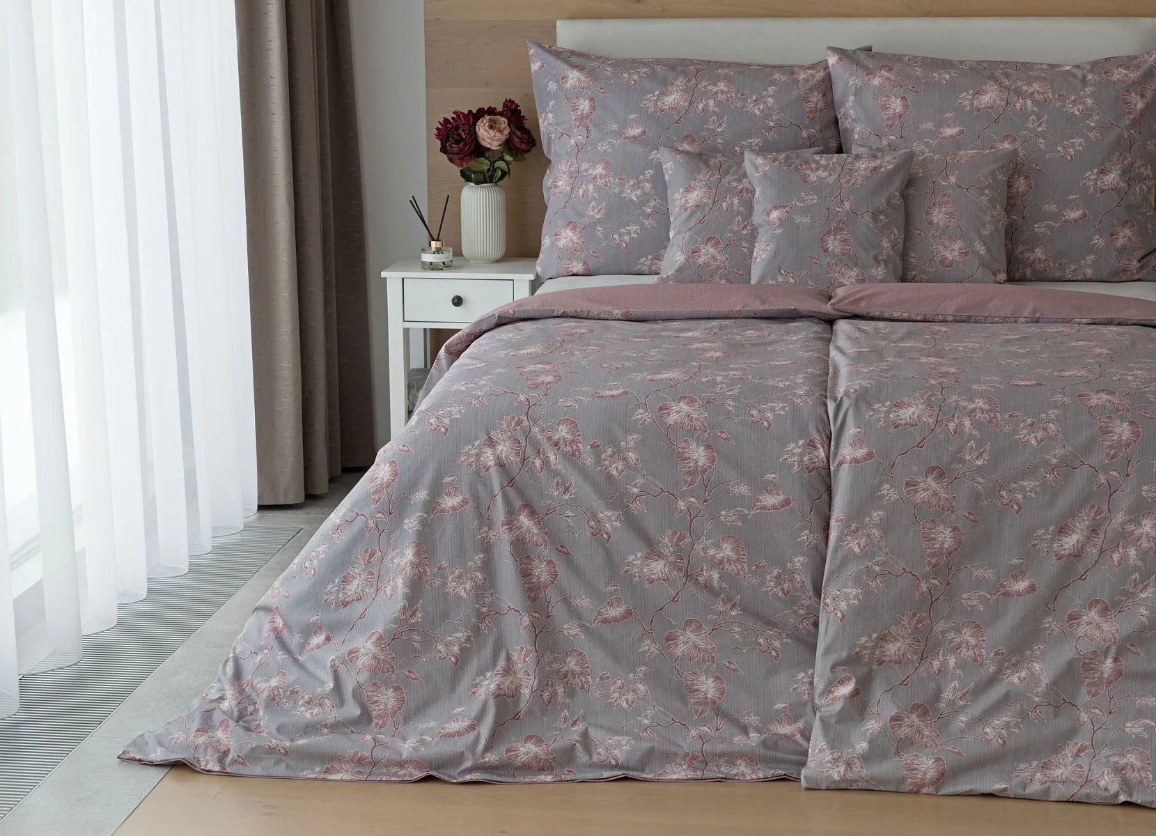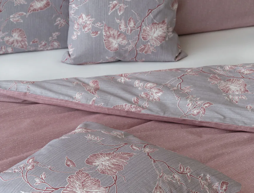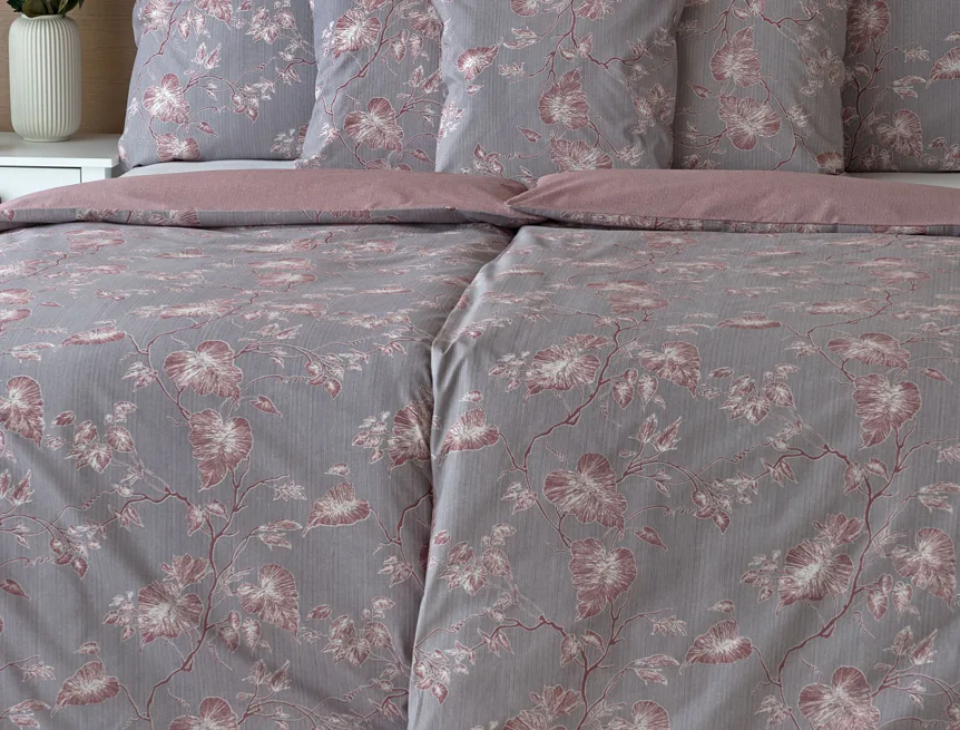 Bavlněné povlečení Bella se stane ozdobou moderní i rustikální ložnice díky něžné kombinaci barev a napáditému vzoru. Motiv jemných lístků v paletě starorůžových a šedých tónů na jedné straně se snoubí s jednobarevným starorůžovým podkladem, který zdobí zadní stranu povlečení. Podklad povlečení z obou stran je ozvláštěn jemnou proužkovanou stukturou.