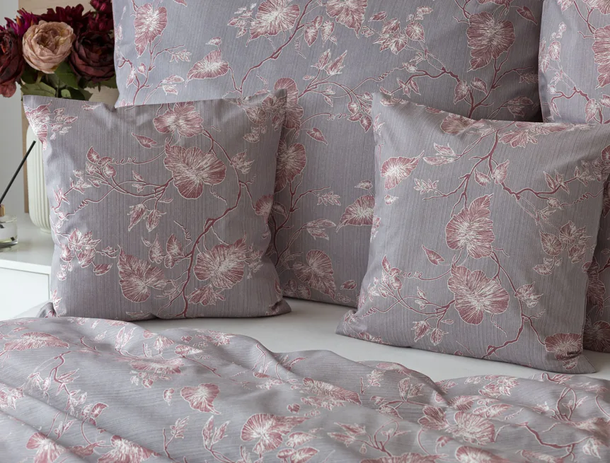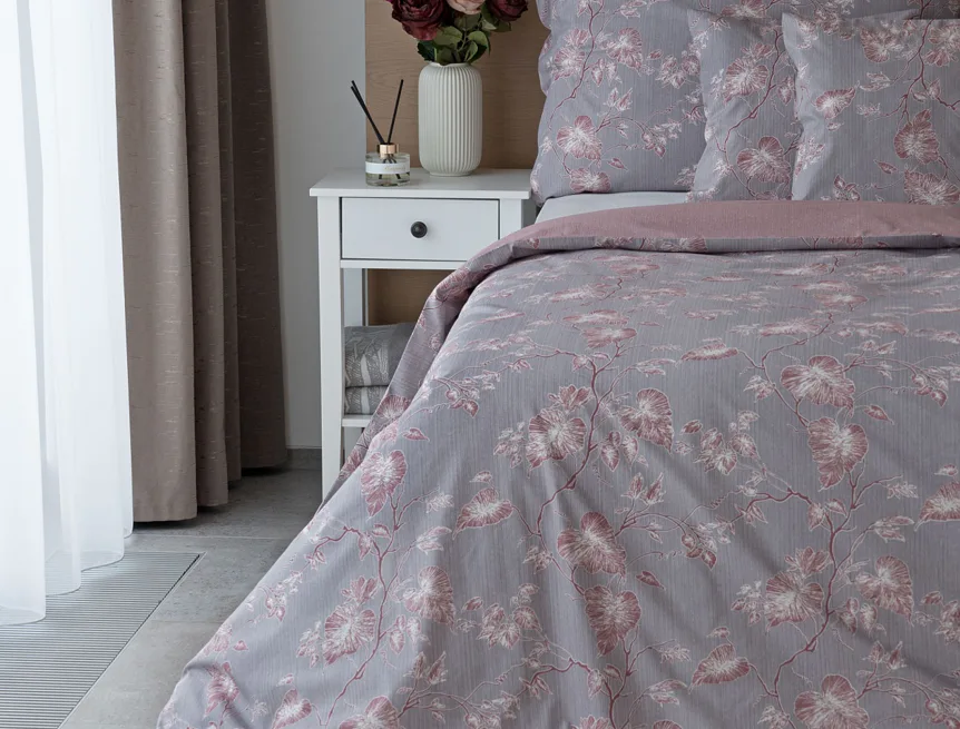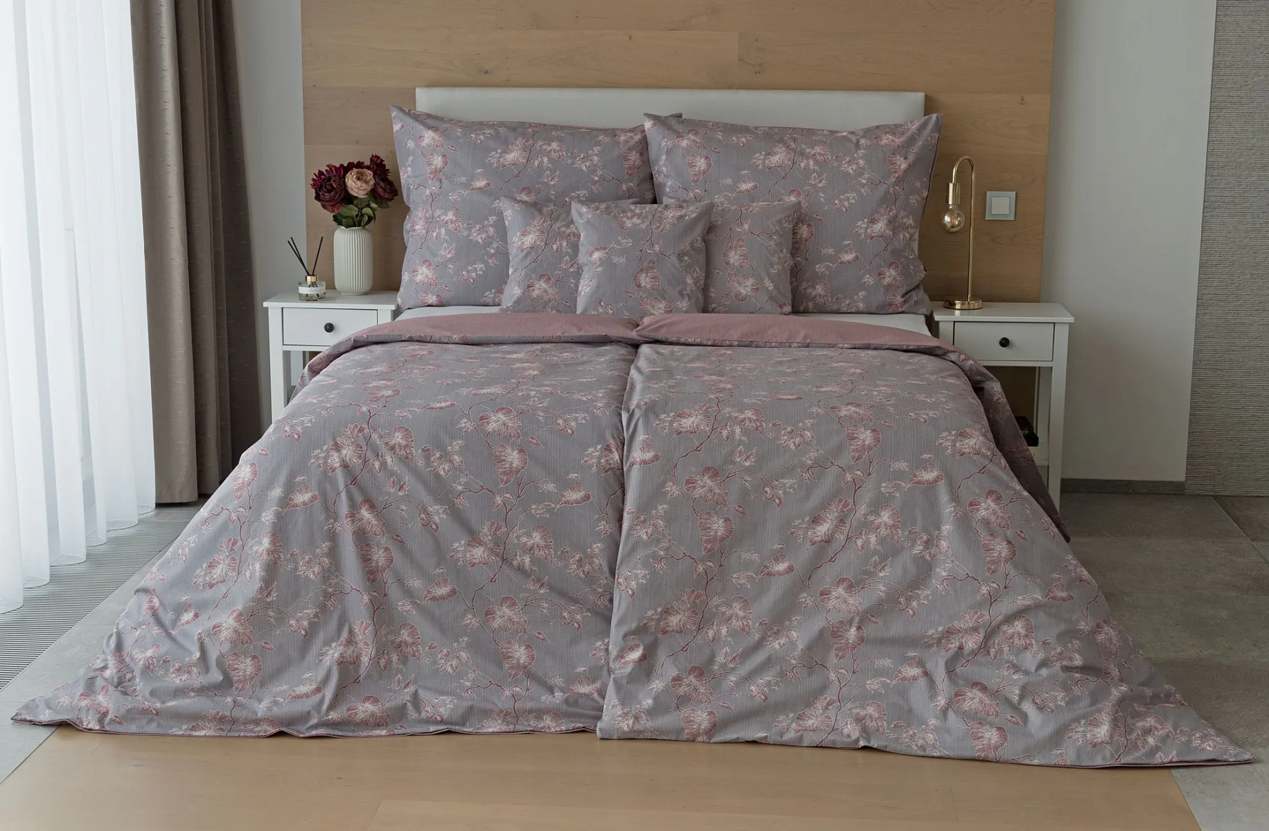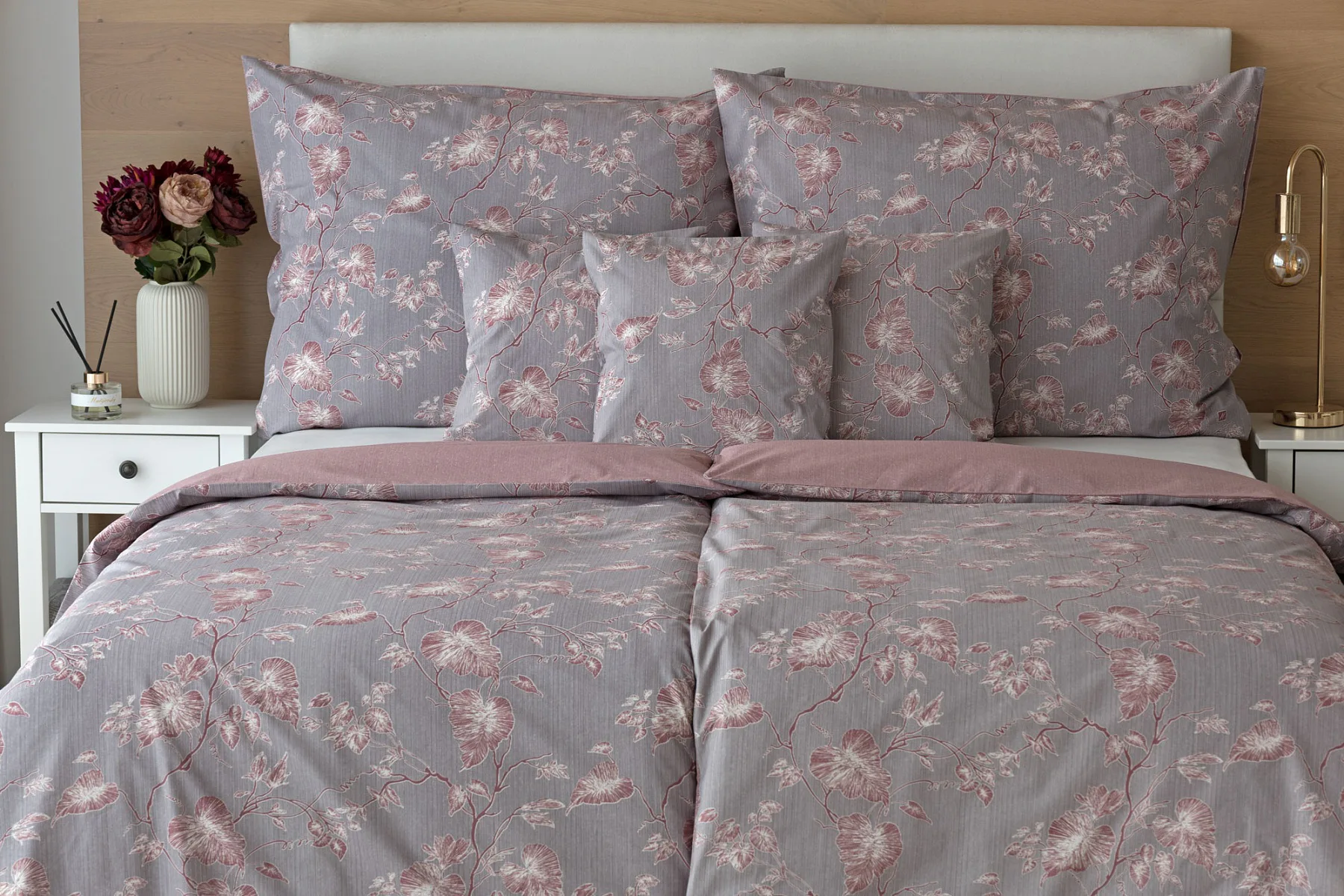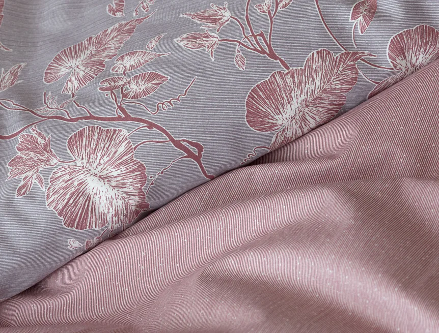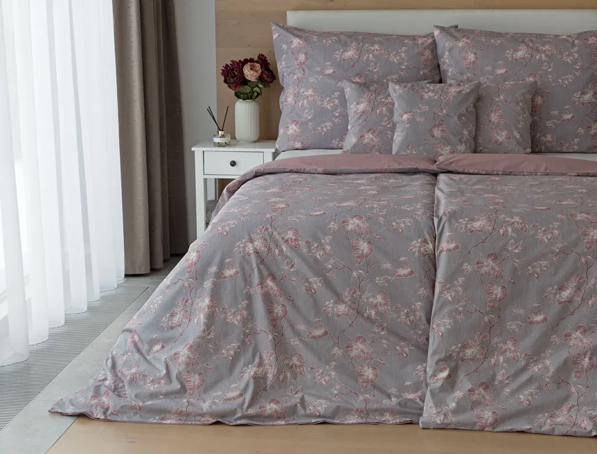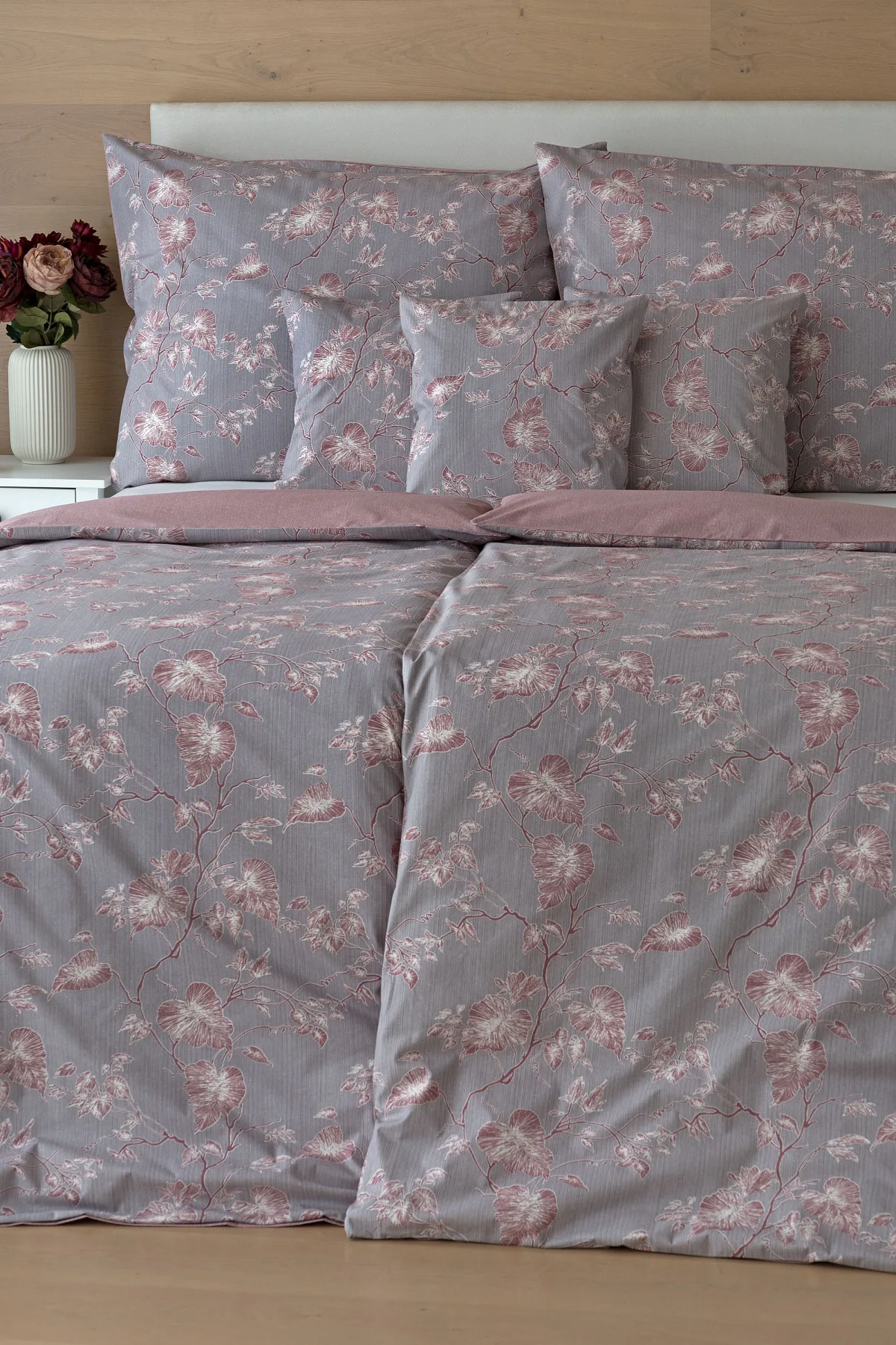 Bavlněné povlečení Bella se stane ozdobou moderní i rustikální ložnice díky něžné kombinaci barev a napáditému vzoru. Motiv jemných lístků v paletě starorůžových a šedých tónů na jedné straně se snoubí s jednobarevným starorůžovým podkladem, který zdobí zadní stranu povlečení. Podklad povlečení z obou stran je ozvláštěn jemnou proužkovanou stukturou.