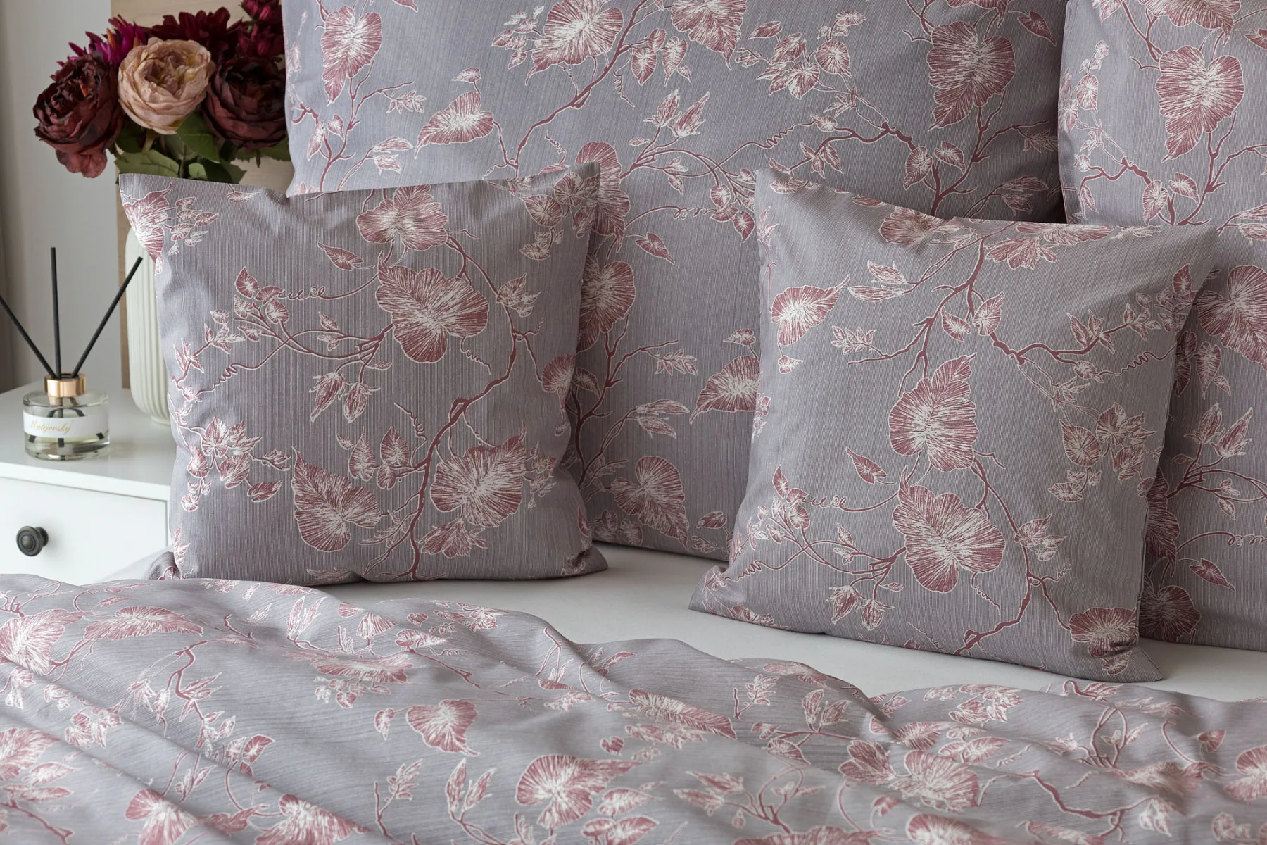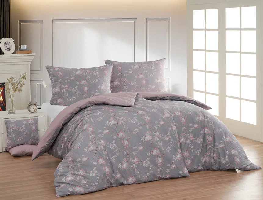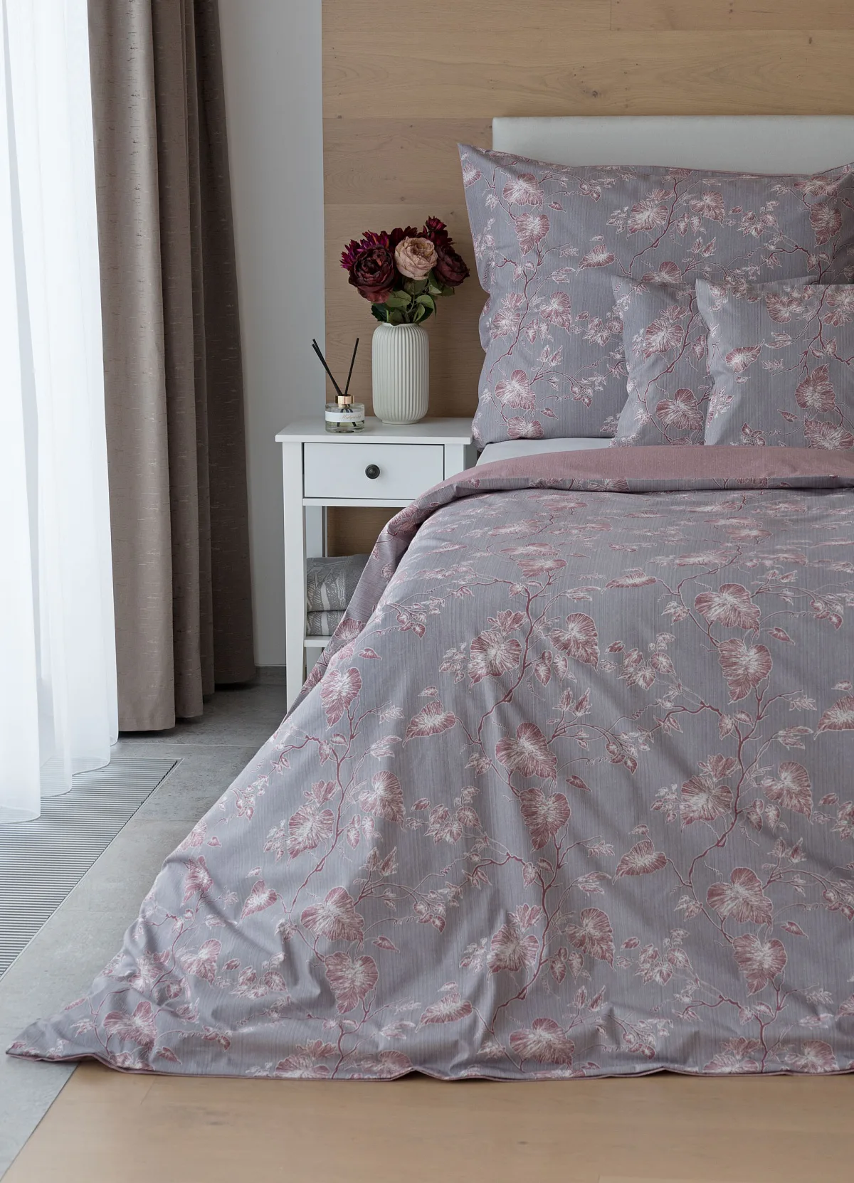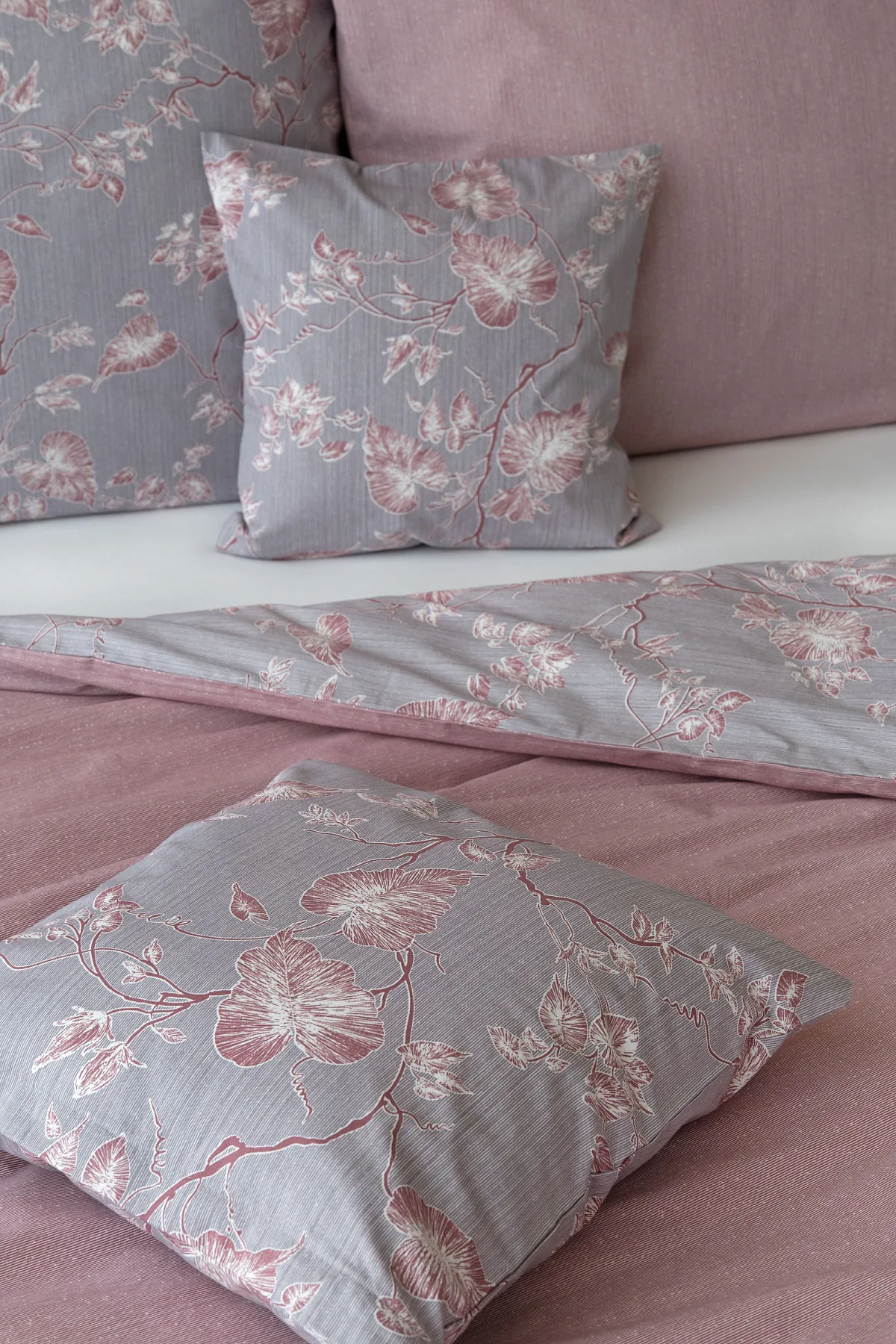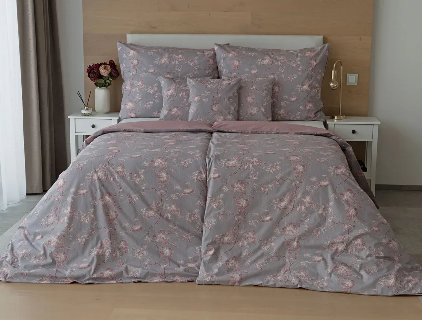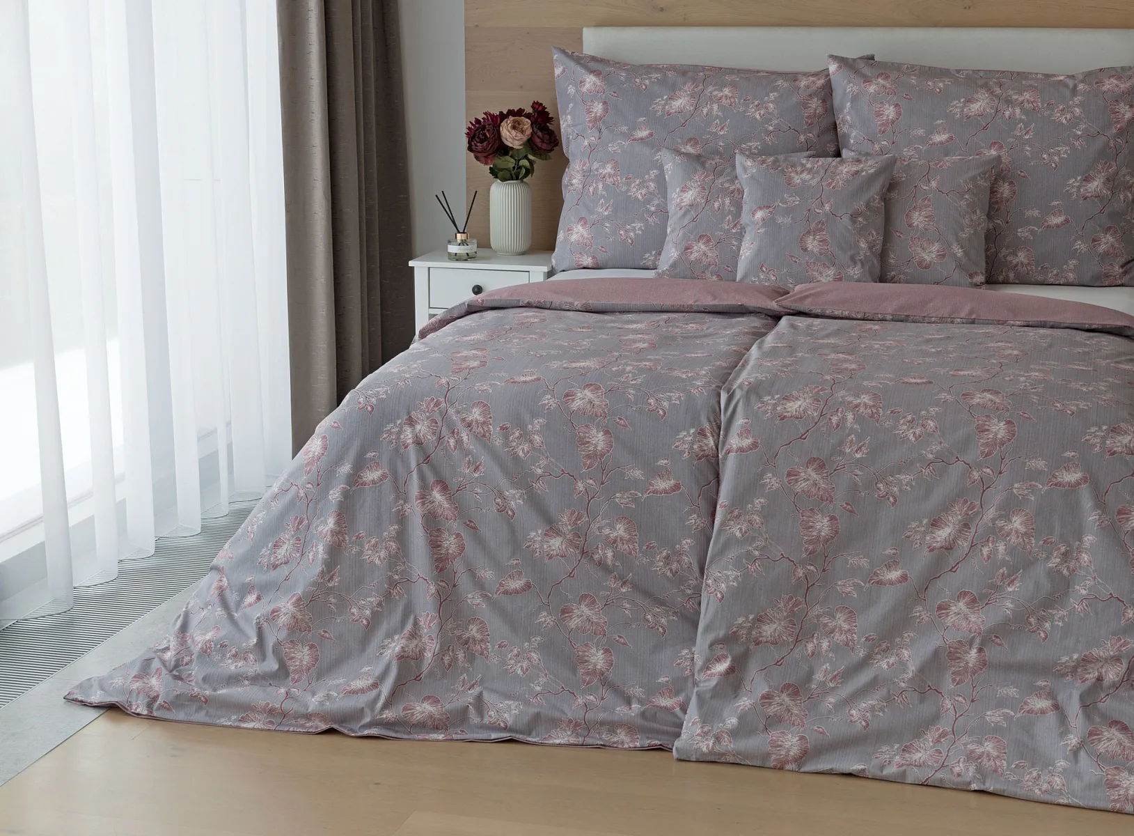Bavlněné povlečení Bella se stane ozdobou moderní i rustikální ložnice díky něžné kombinaci barev a napáditému vzoru. Motiv jemných lístků v paletě starorůžových a šedých tónů na jedné straně se snoubí s jednobarevným starorůžovým podkladem, který zdobí zadní stranu povlečení. Podklad povlečení z obou stran je ozvláštěn jemnou proužkovanou stukturou.