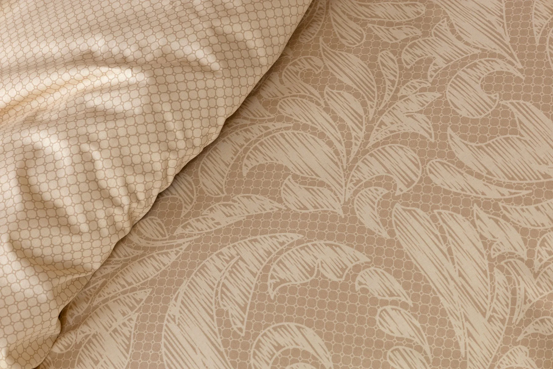 Povlak na přikrývku je z obou stran stejný, povlak na polštář zachycuje z každé strany jinou část vzoru z metráže pro cíchu. Povlečení je opatřeno komfortním zipovým uzávěrem