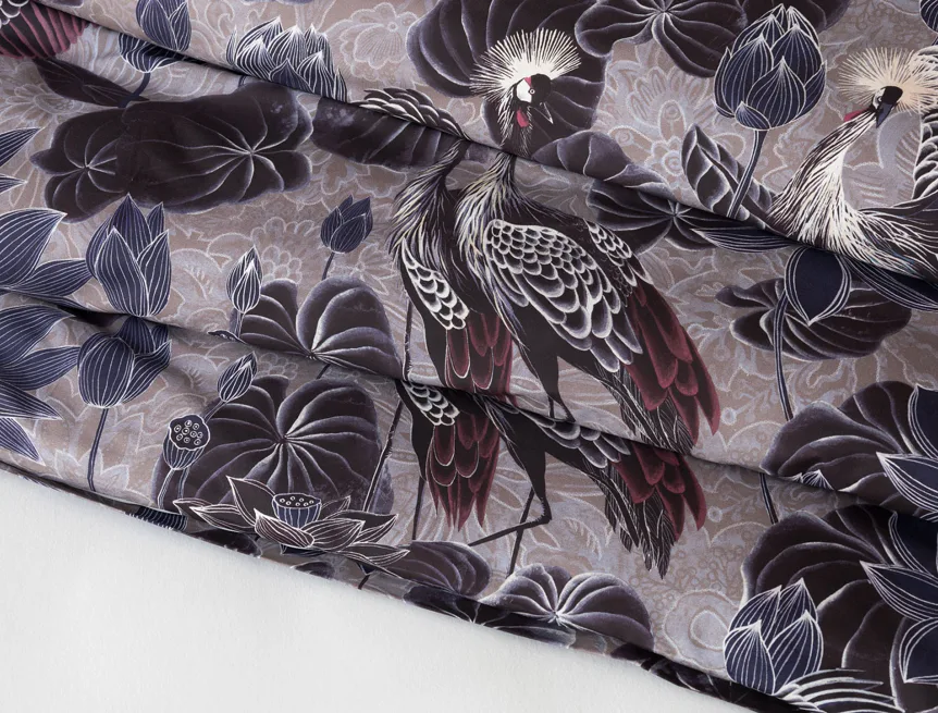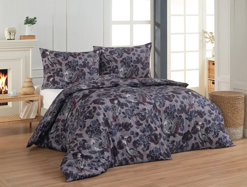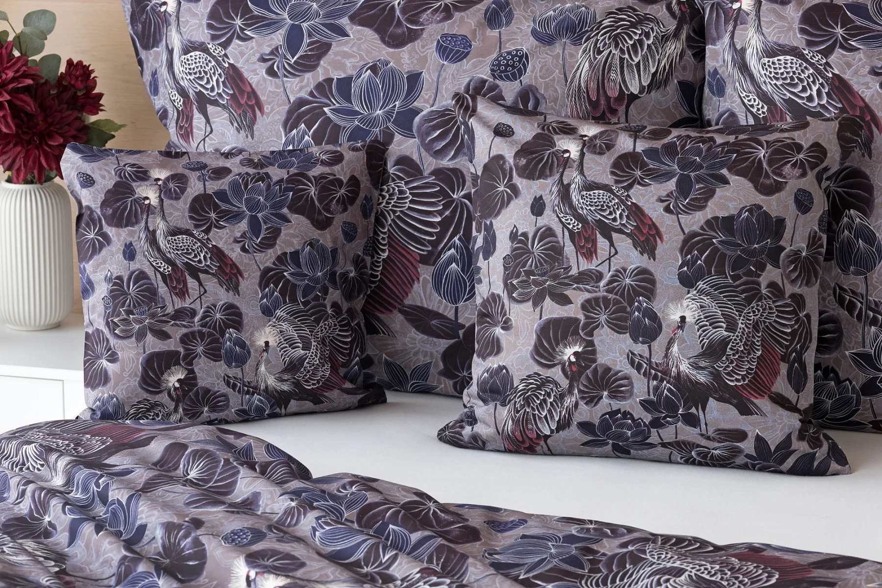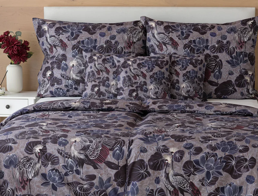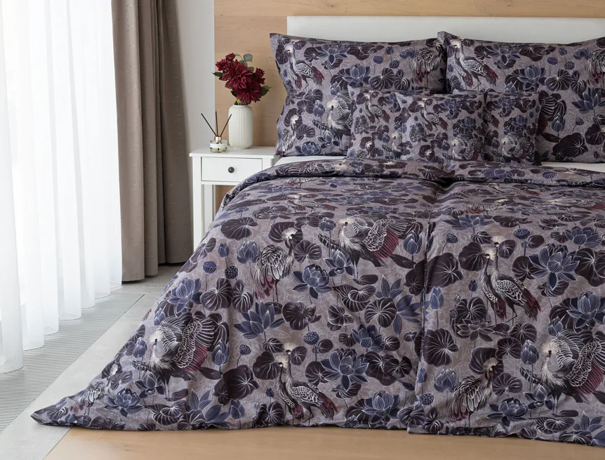 Nechte se okouzlit originálním vzhledem bavlněného povlečení Birdie. Motiv Jeřába královského je v dokonalé harmonii s florálními prvky. Magický nádech vzoru podtrhuje barevné provedení v paletě fialových, vínových a modrošedých tónů. Díky nejmodernější digitální tiskové technologii vyniká vzor v precizním detailu.