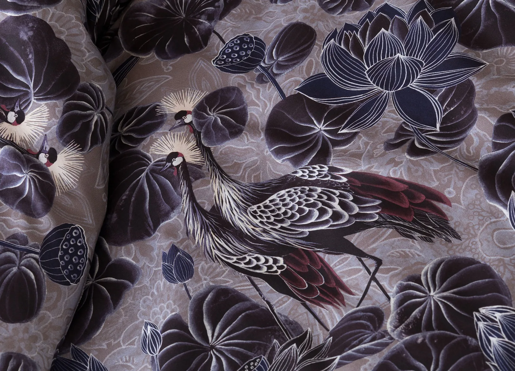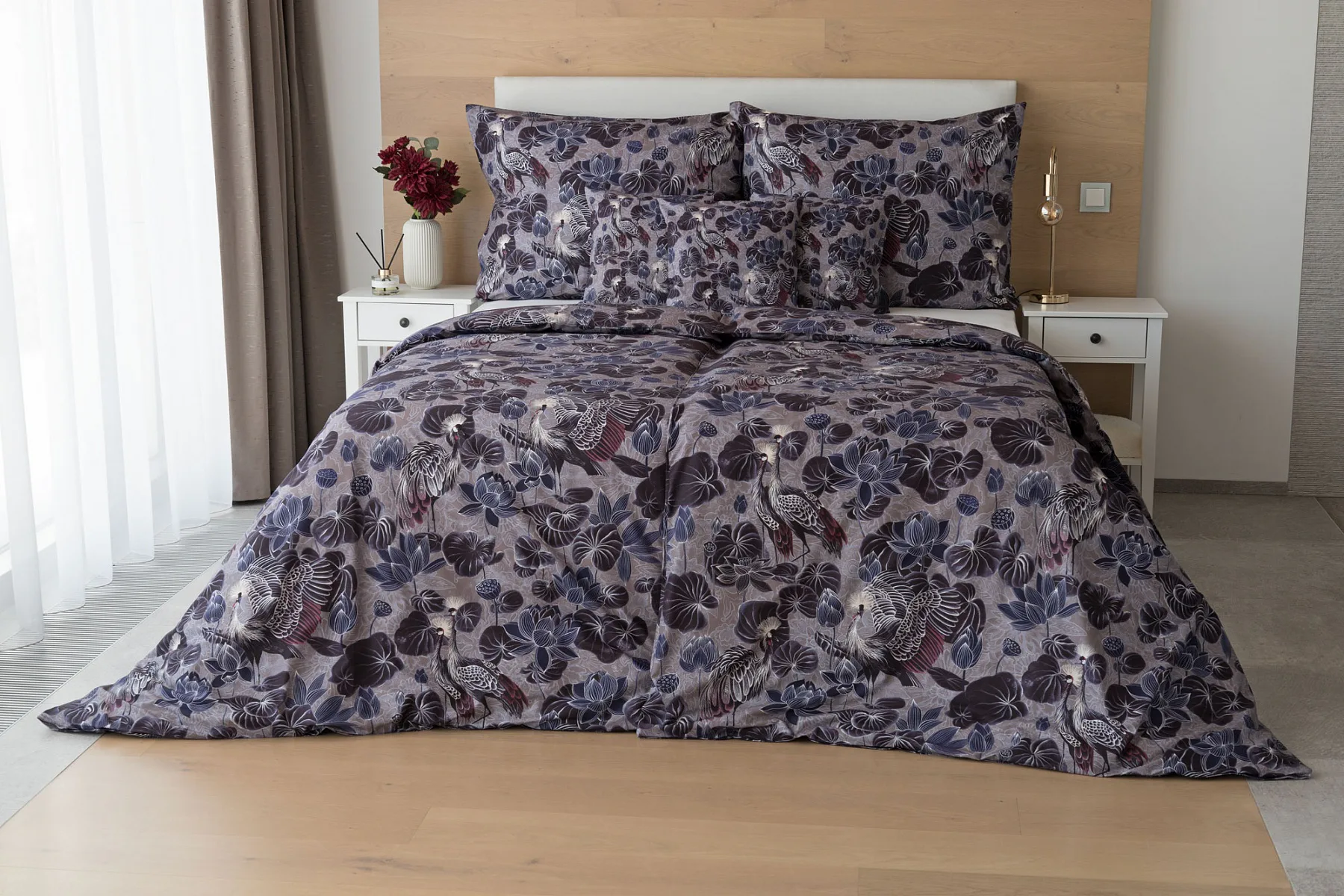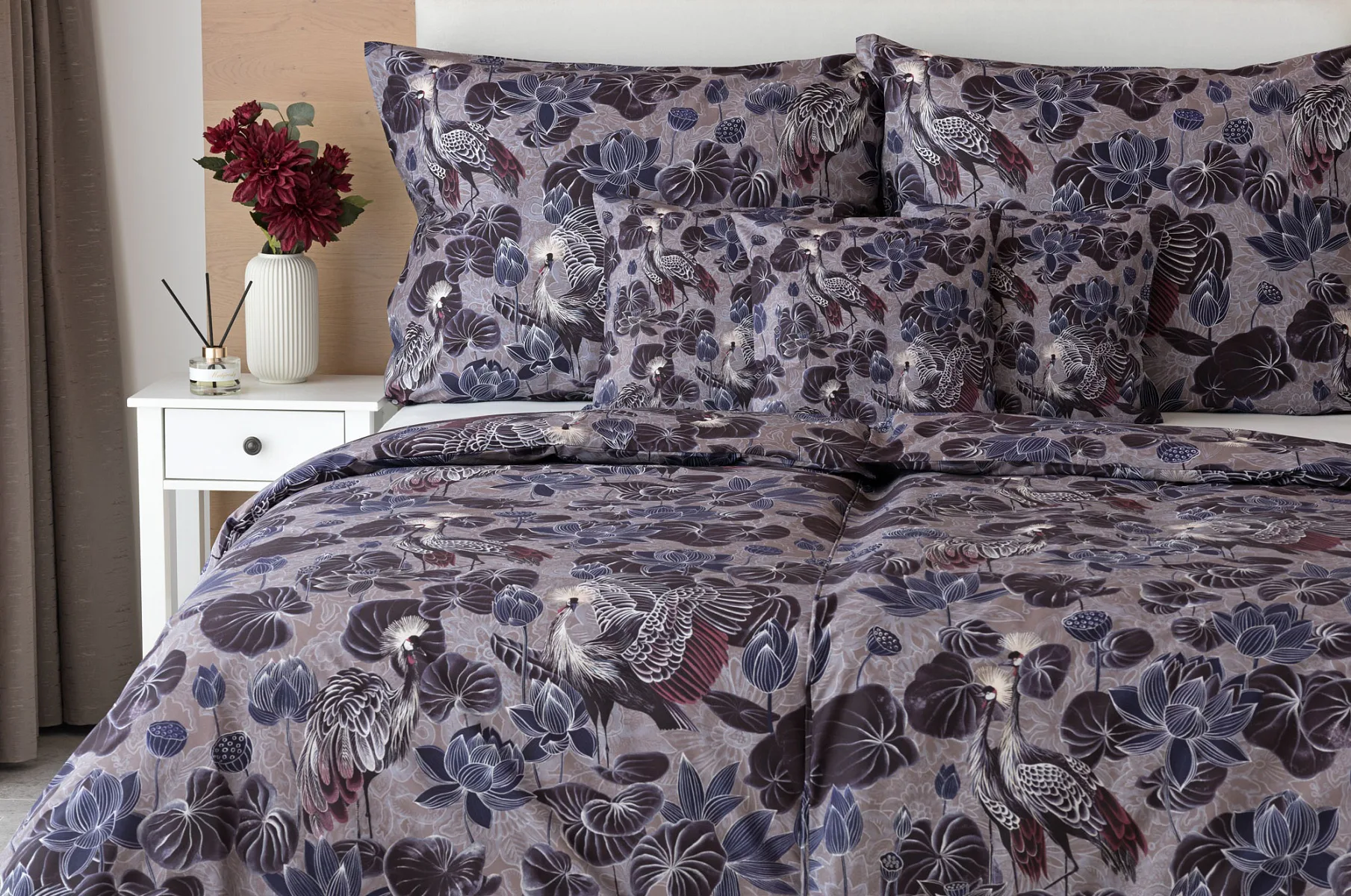 Nechte se okouzlit originálním vzhledem bavlněného povlečení Birdie. Motiv Jeřába královského je v dokonalé harmonii s florálními prvky. Magický nádech vzoru podtrhuje barevné provedení v paletě fialových, vínových a modrošedých tónů. Díky nejmodernější digitální tiskové technologii vyniká vzor v precizním detailu.