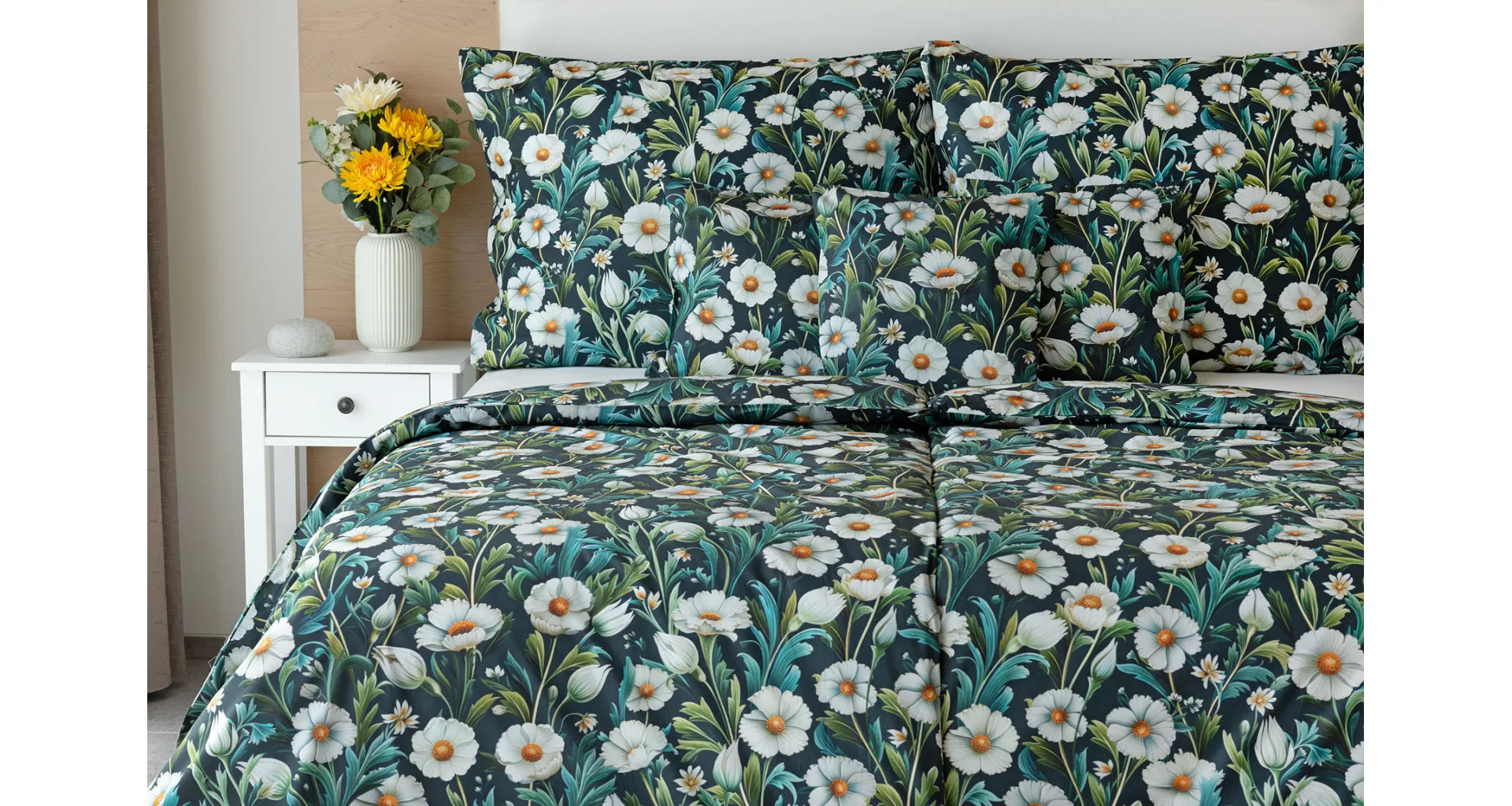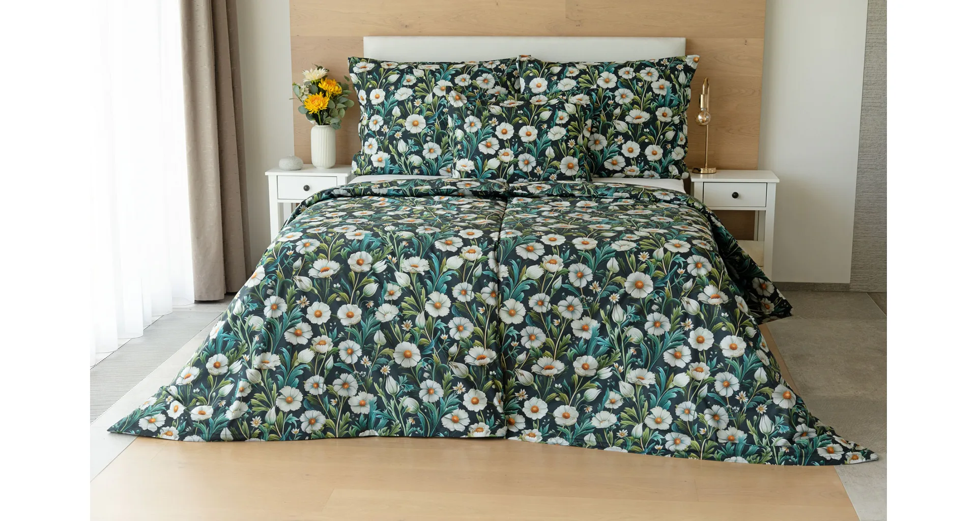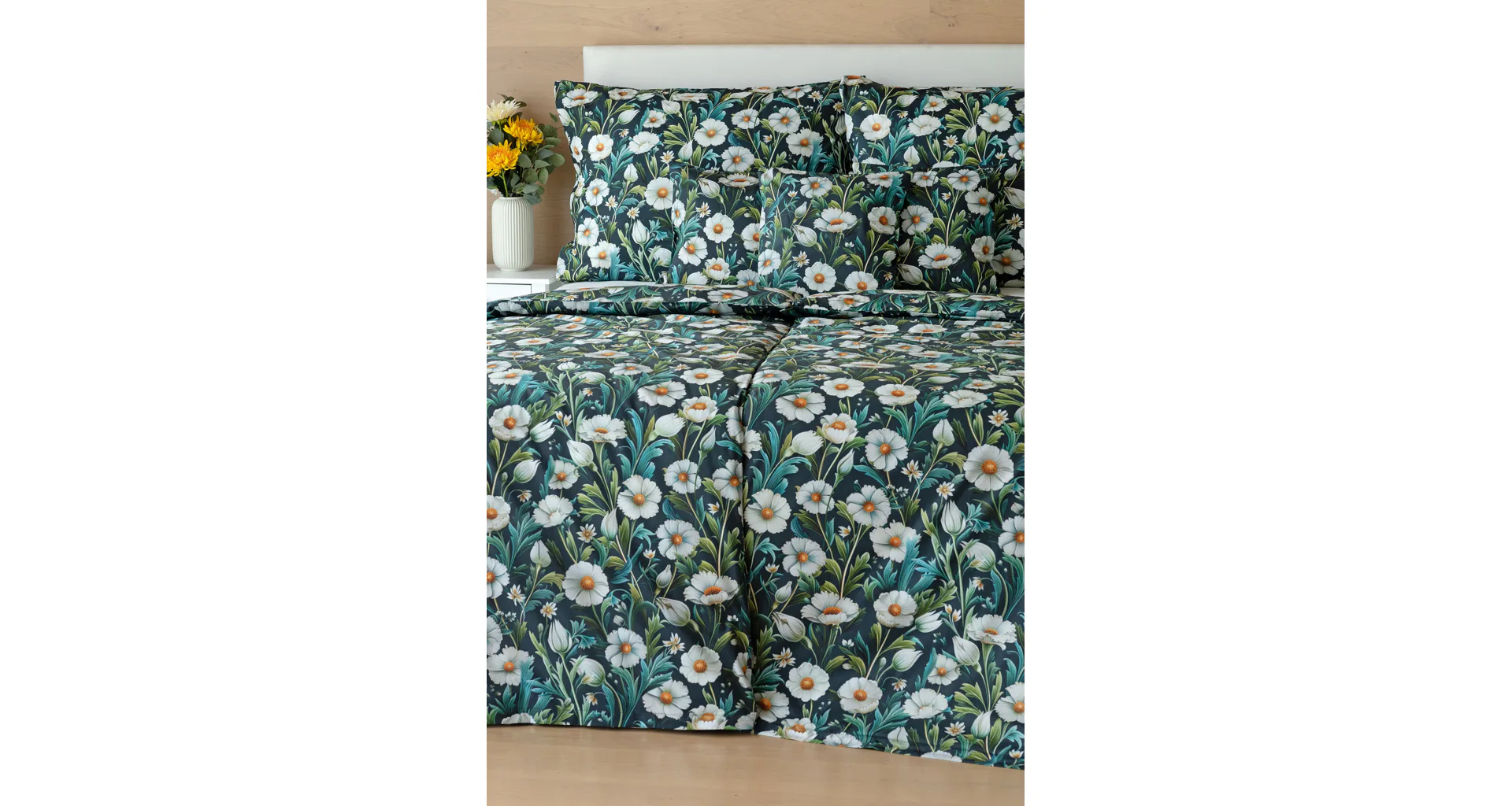 Vychutnejte si uklidňující harmonii ložního povlečení Bonnie. V okouzlujícím květinovém vzoru se snoubí pestrá paleta zelených tónů, které vynikají mezi drobnými kvítky na temně modrozeleném podkladu. Díky nejmodernější digitální tiskové technologii se povlečení pyšní precizním detailem potisku.