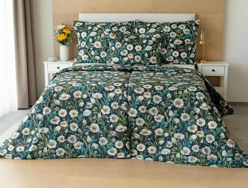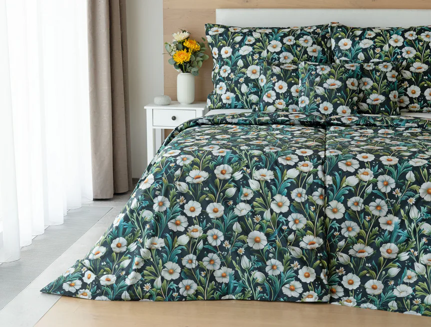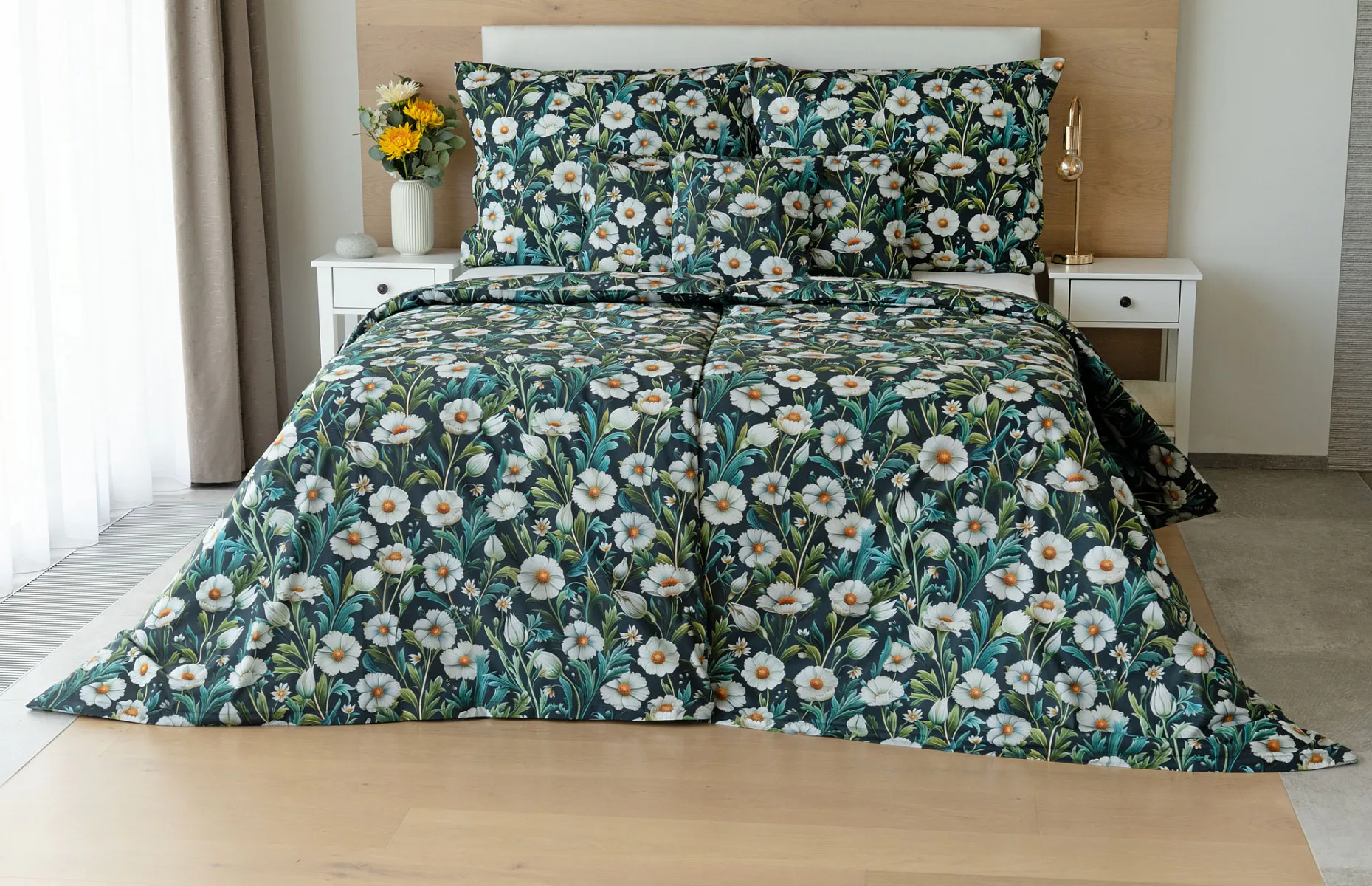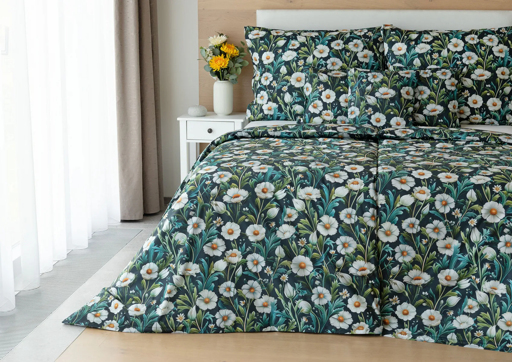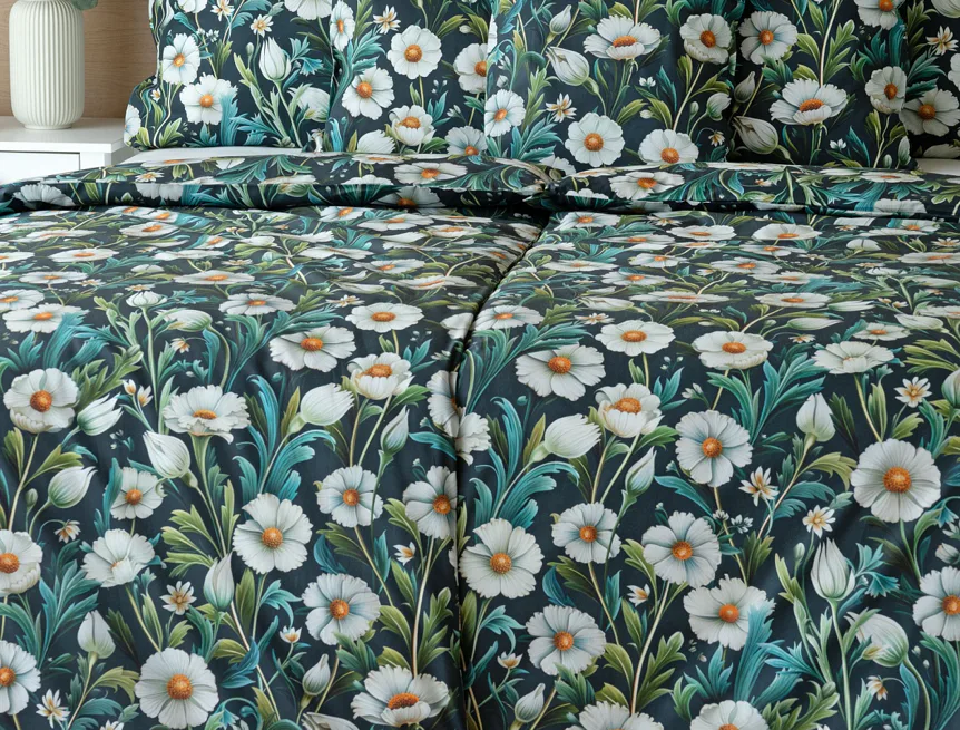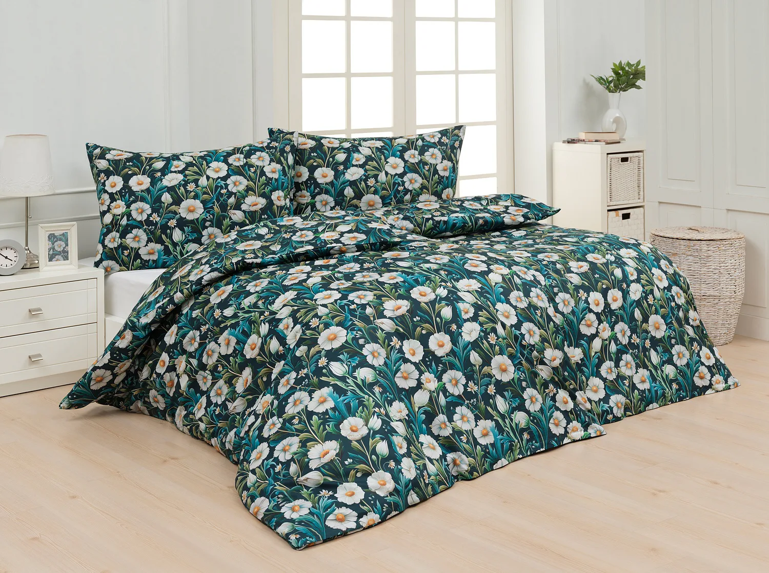 Vychutnejte si uklidňující harmonii ložního povlečení Bonnie. V okouzlujícím květinovém vzoru se snoubí pestrá paleta zelených tónů, které vynikají mezi drobnými kvítky na temně modrozeleném podkladu. Díky nejmodernější digitální tiskové technologii se povlečení pyšní precizním detailem potisku.