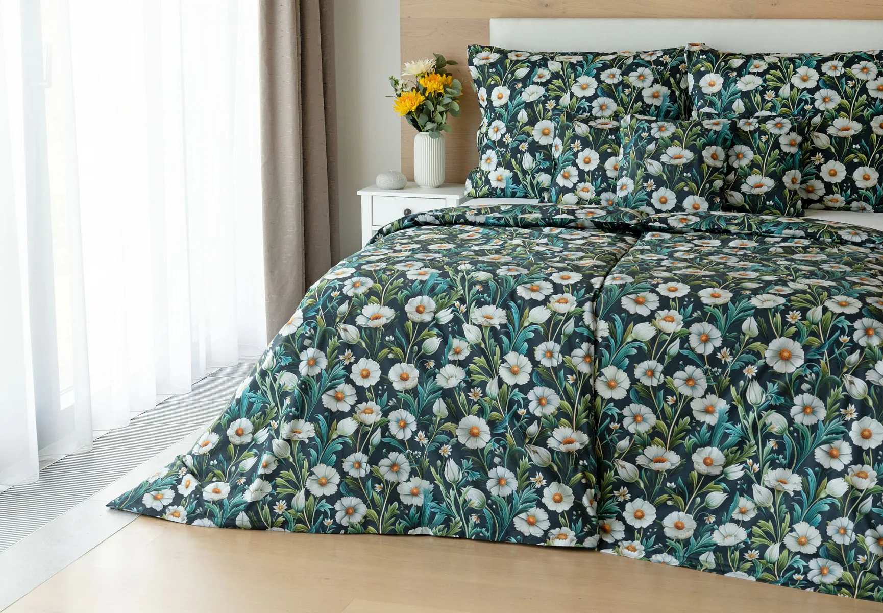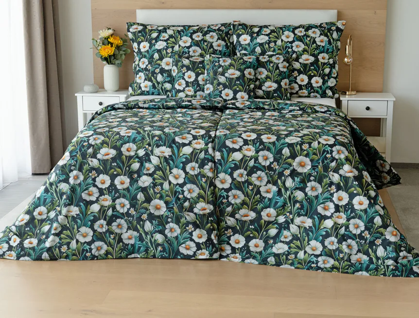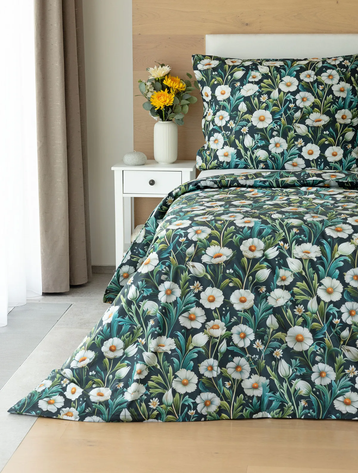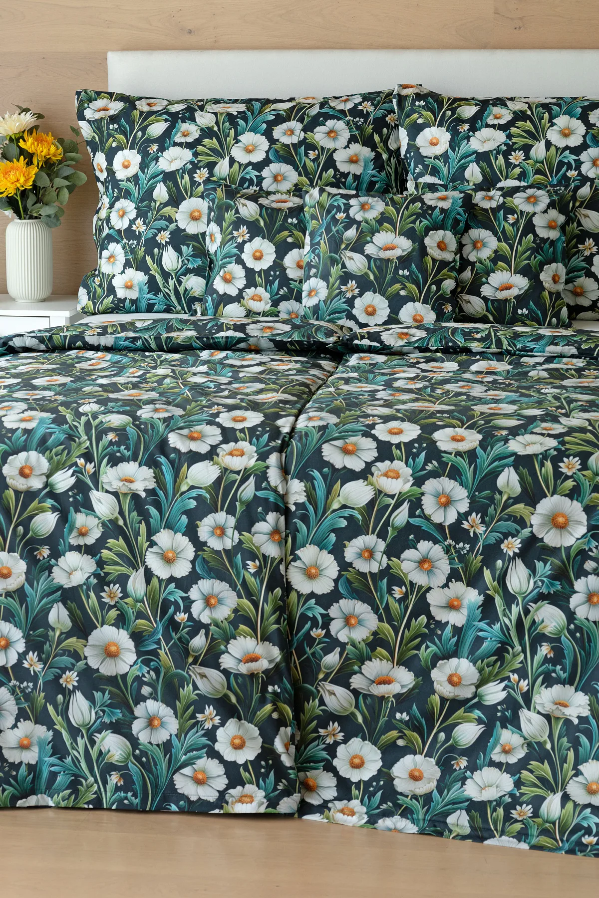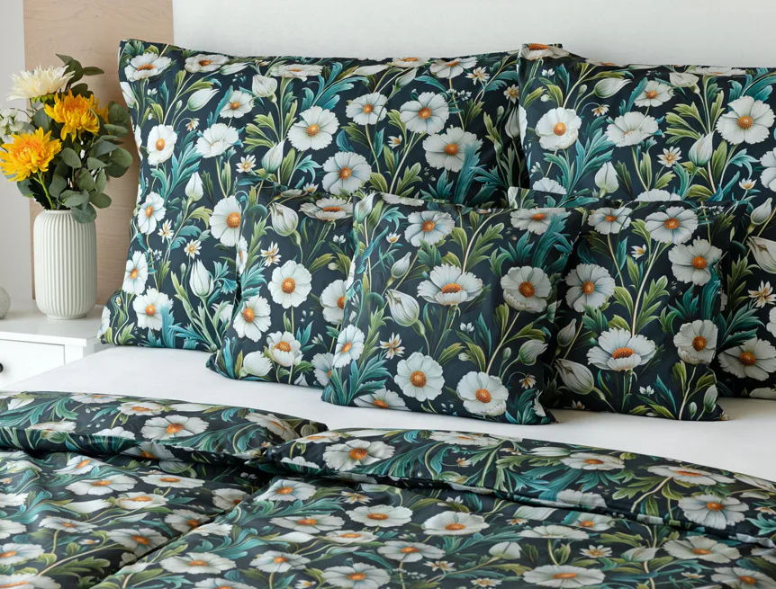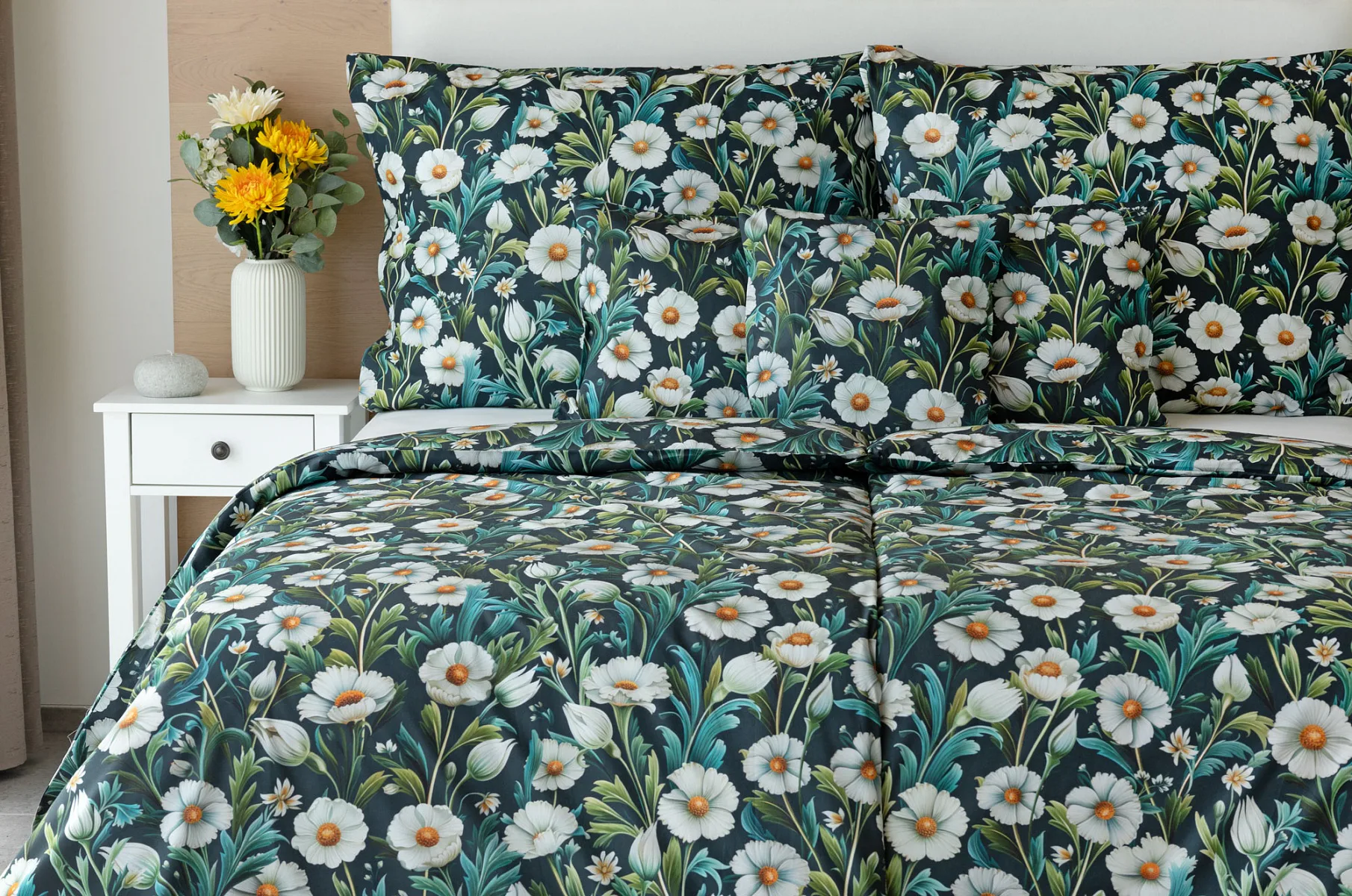 Vychutnejte si uklidňující harmonii ložního povlečení Bonnie. V okouzlujícím květinovém vzoru se snoubí pestrá paleta zelených tónů, které vynikají mezi drobnými kvítky na temně modrozeleném podkladu. Díky nejmodernější digitální tiskové technologii se povlečení pyšní precizním detailem potisku.