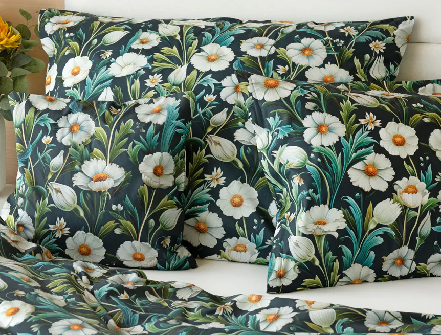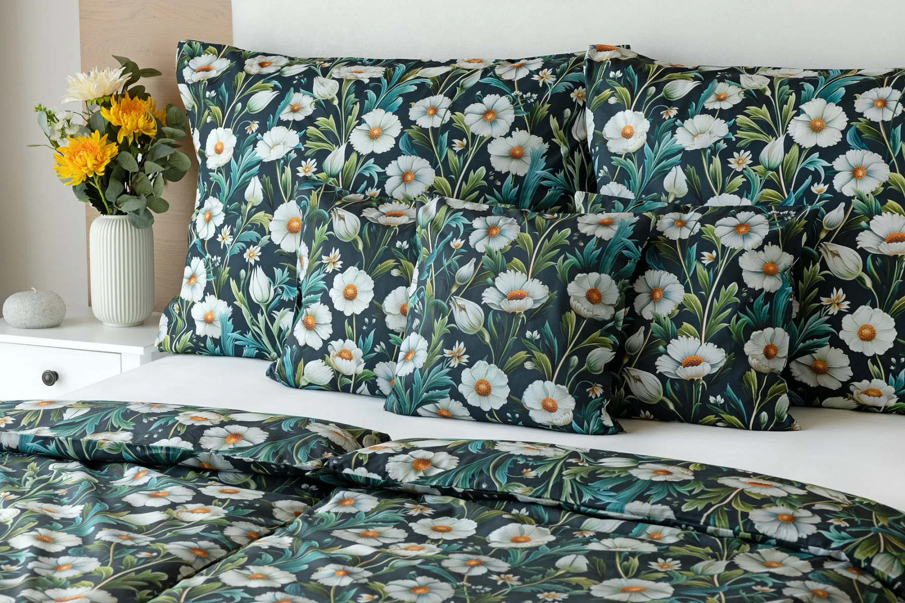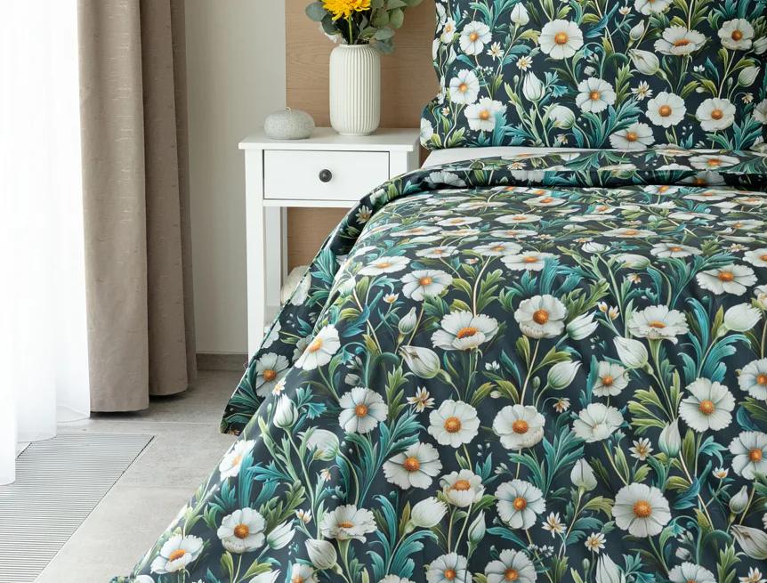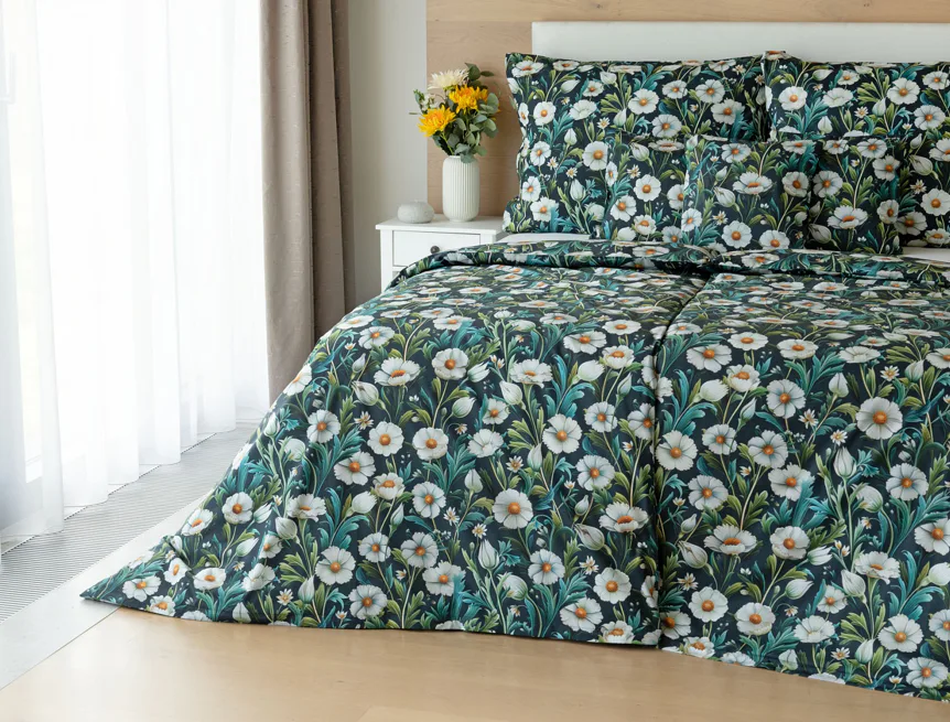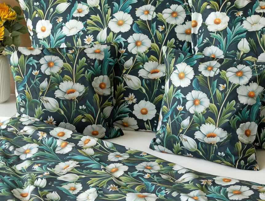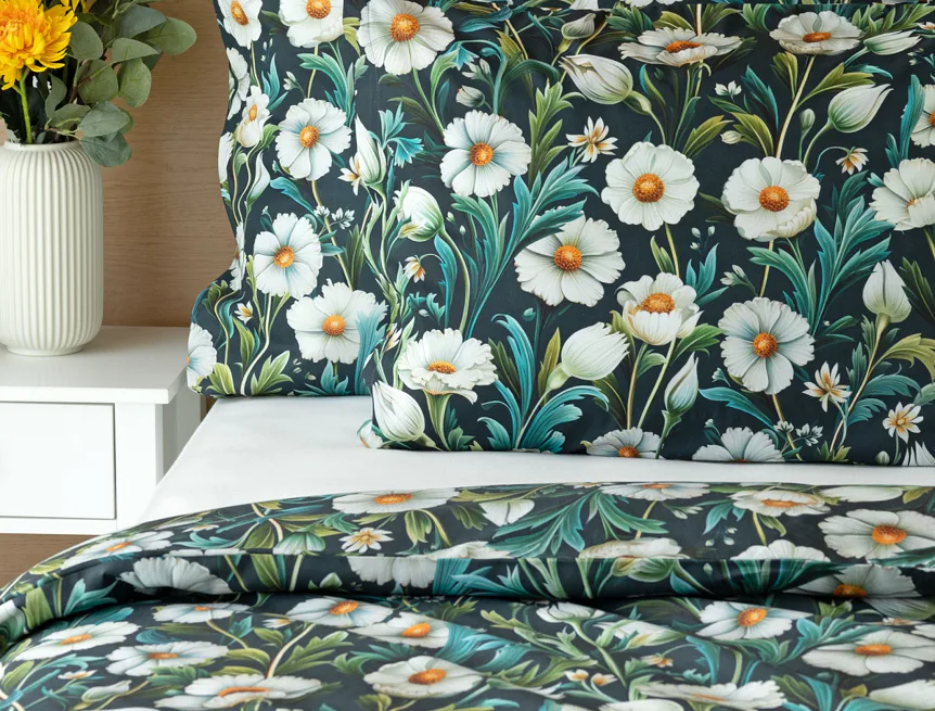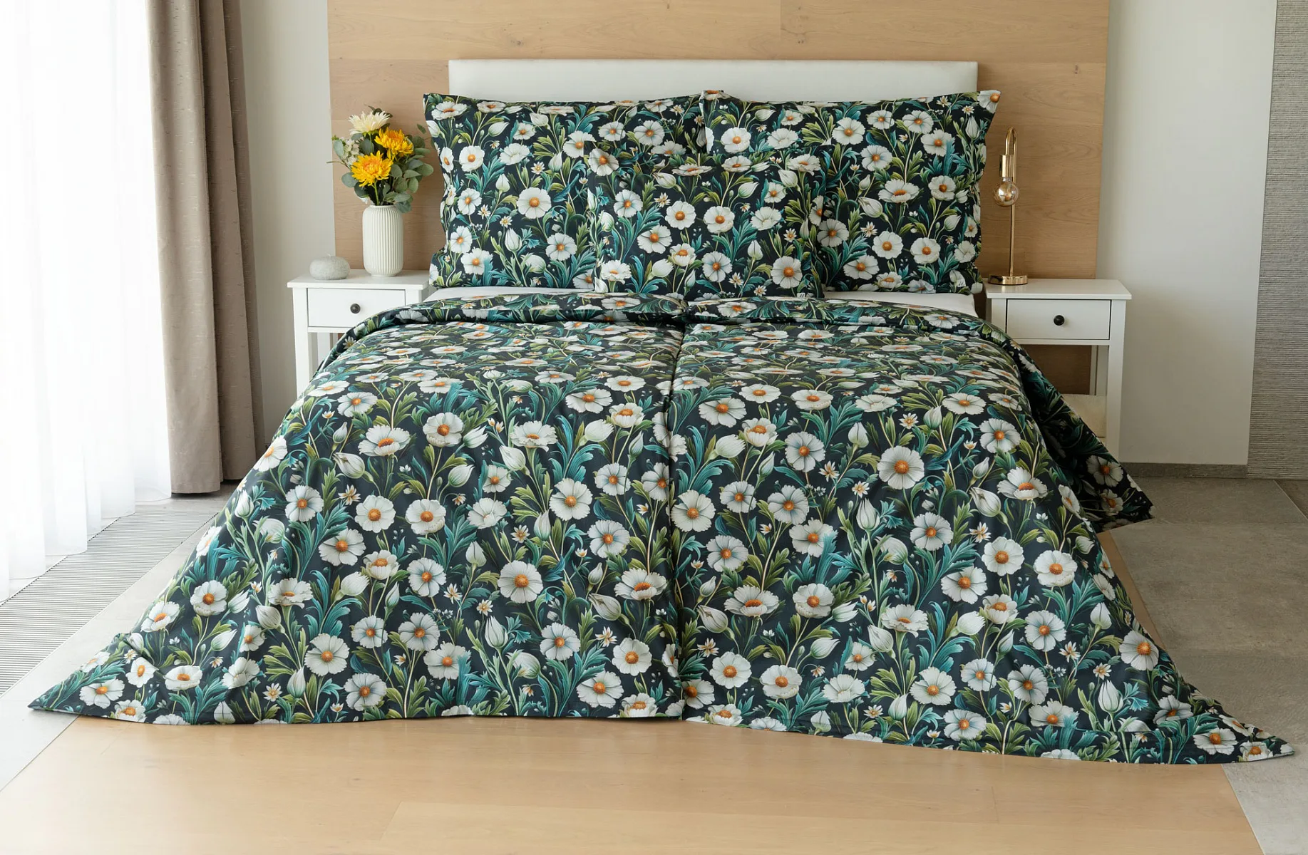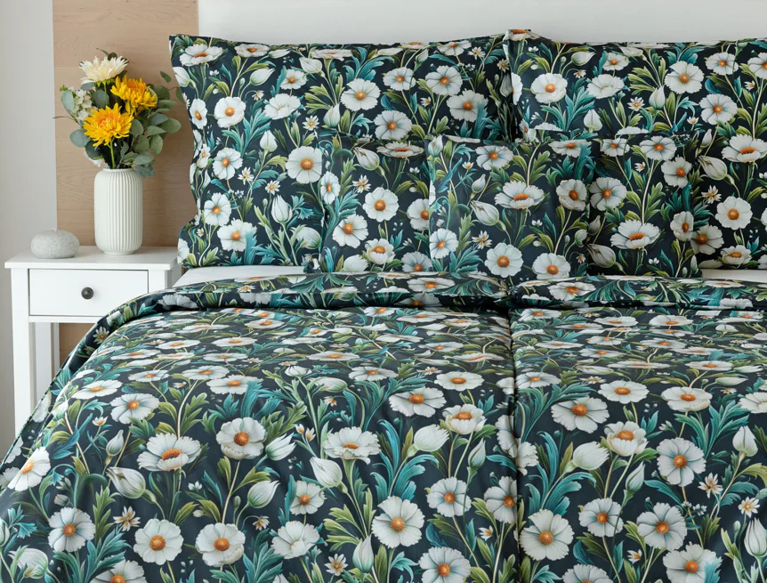 Vychutnejte si uklidňující harmonii ložního povlečení Bonnie. V okouzlujícím květinovém vzoru se snoubí pestrá paleta zelených tónů, které vynikají mezi drobnými kvítky na temně modrozeleném podkladu. Díky nejmodernější digitální tiskové technologii se povlečení pyšní precizním detailem potisku.