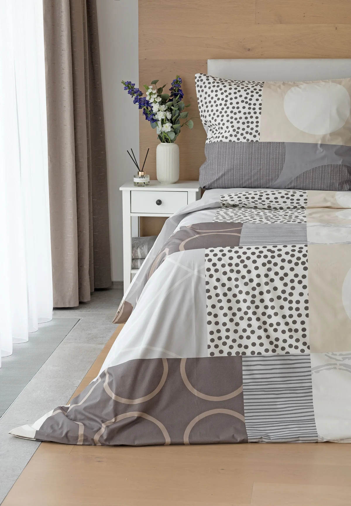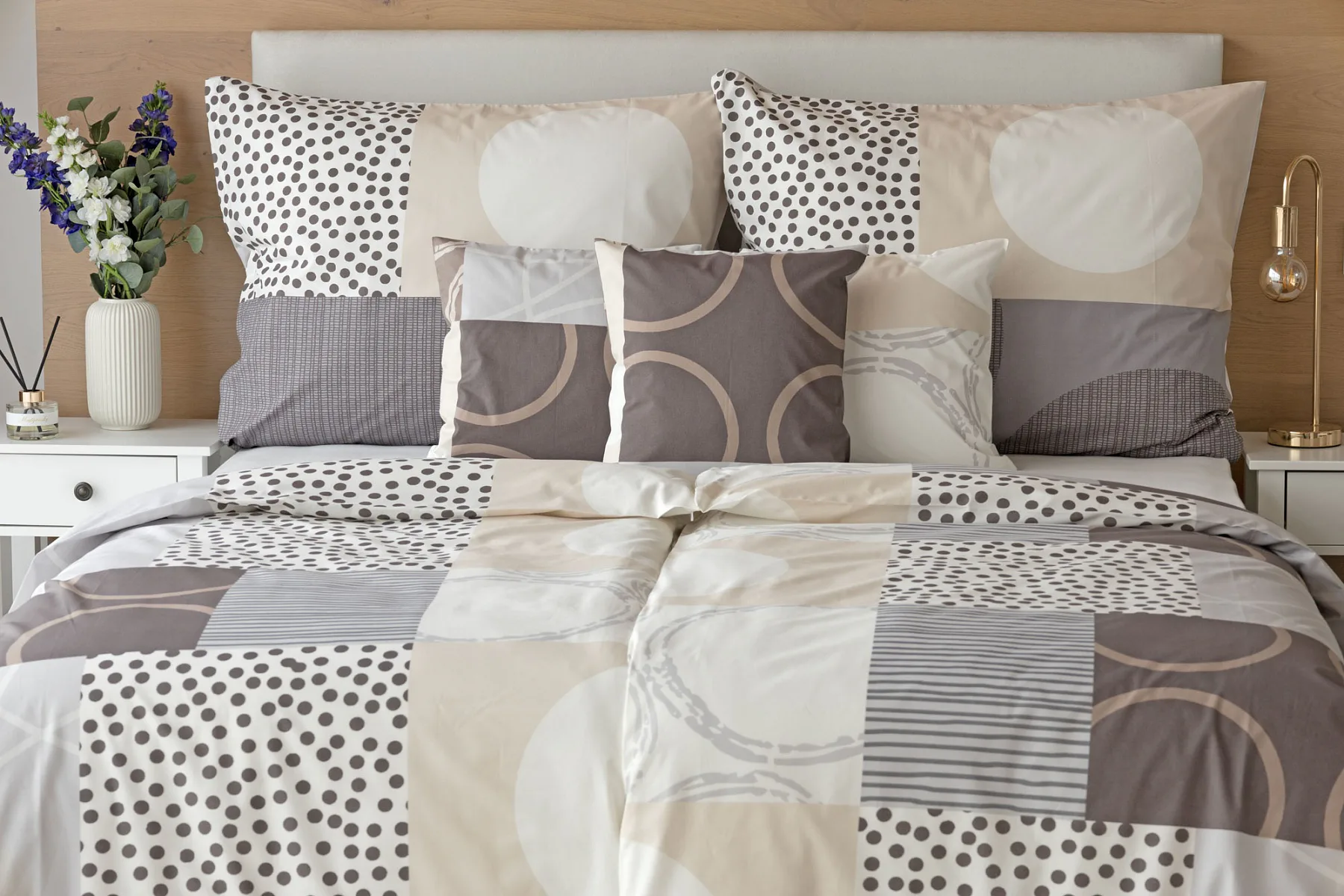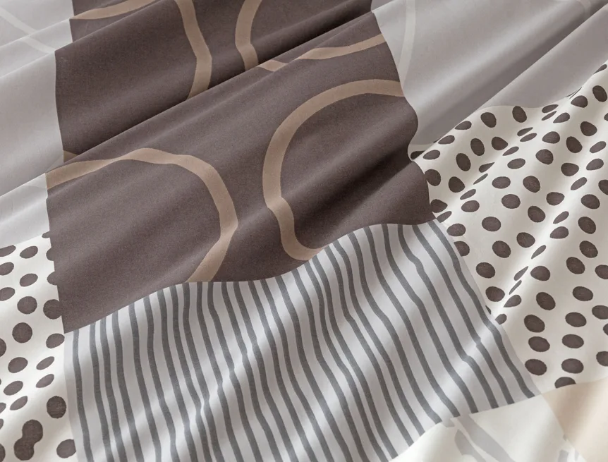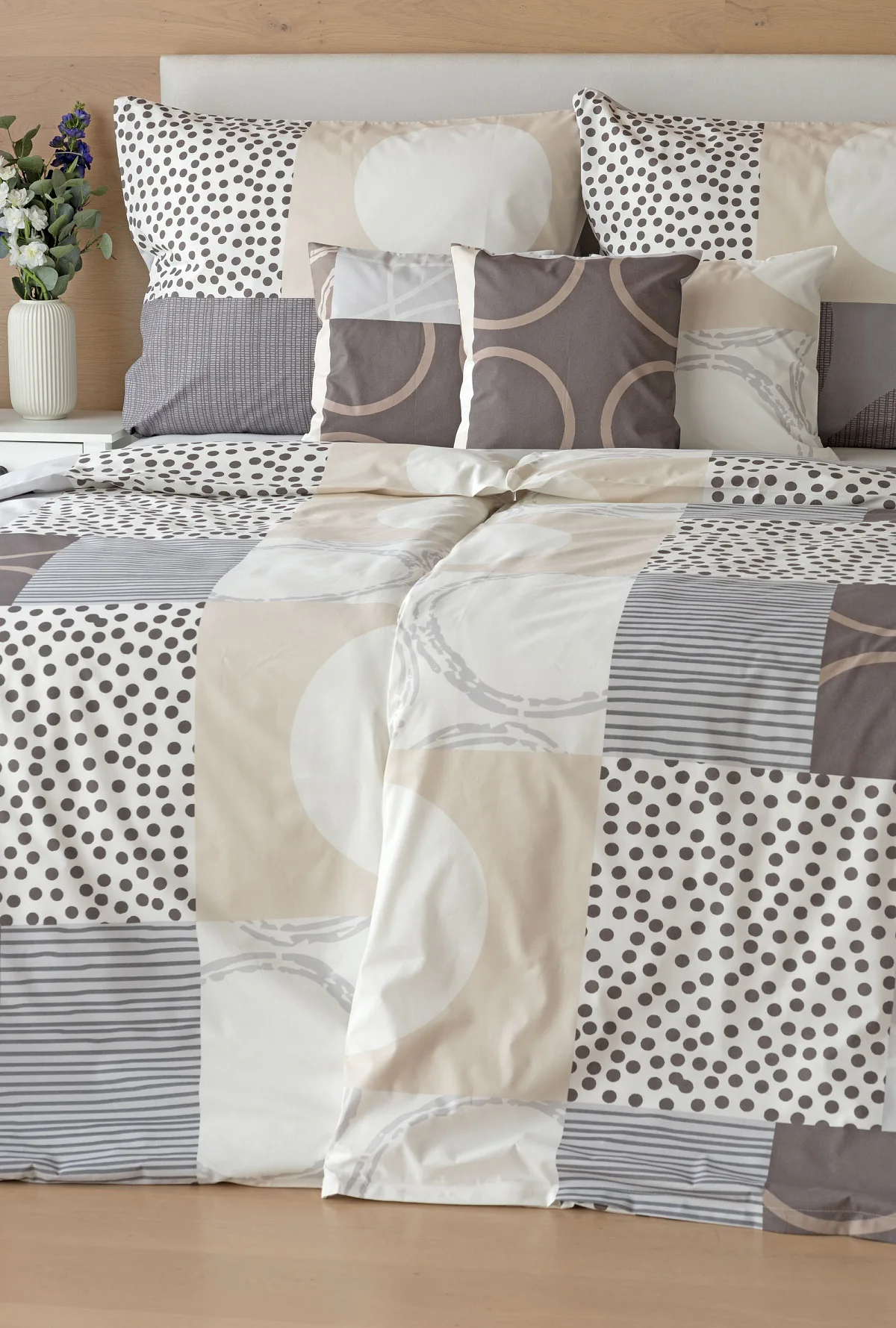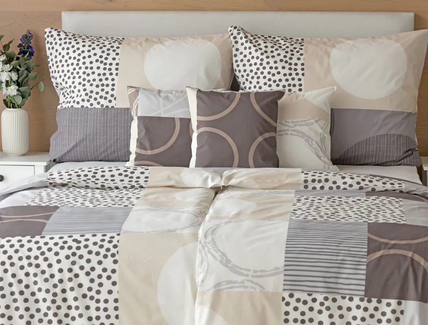 Moderní geometrický vzor povlečení Brenton kombinuje jemné odstíny hnědé, béžové a šedé na krémově bílém podkladu.
