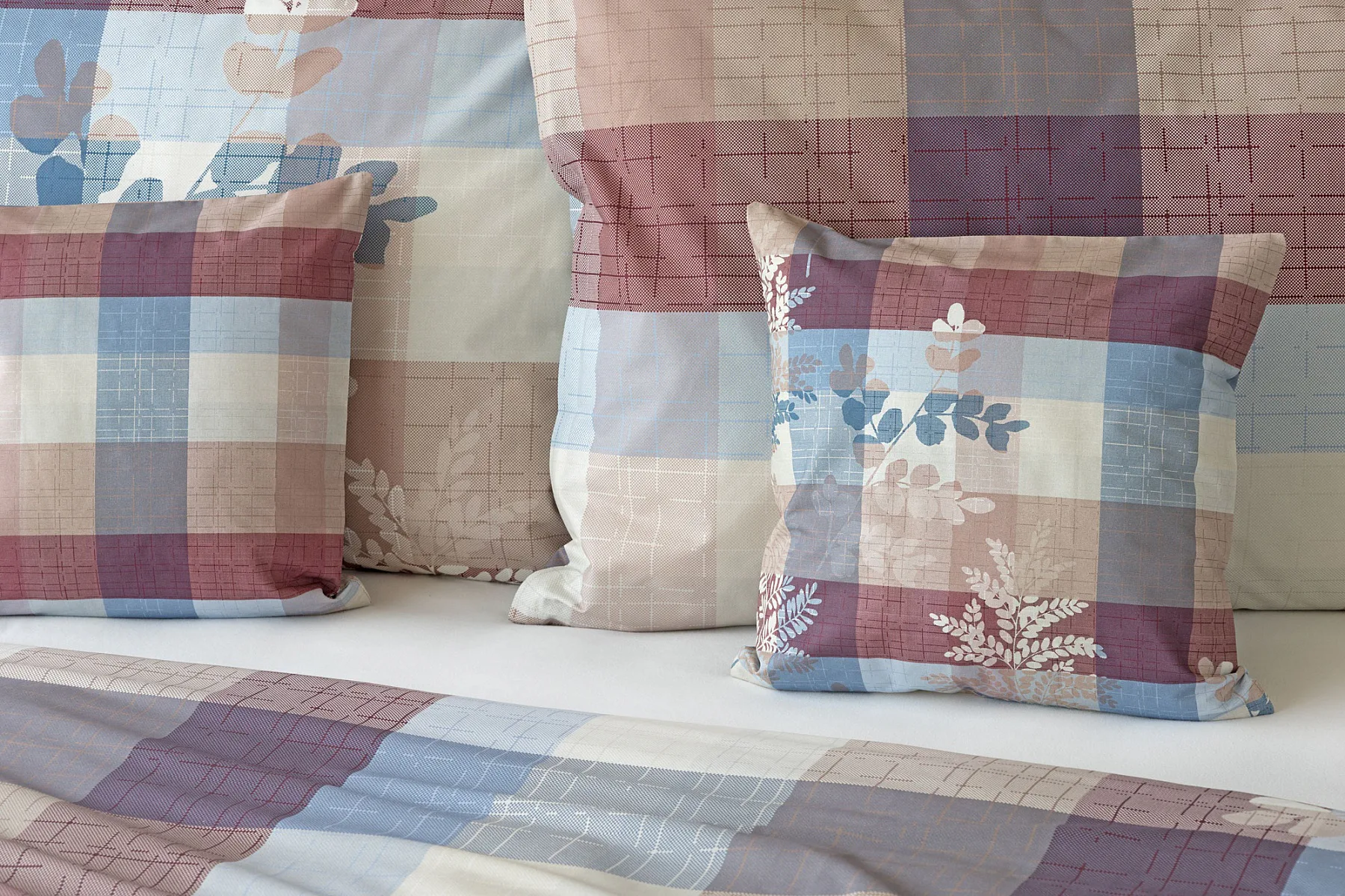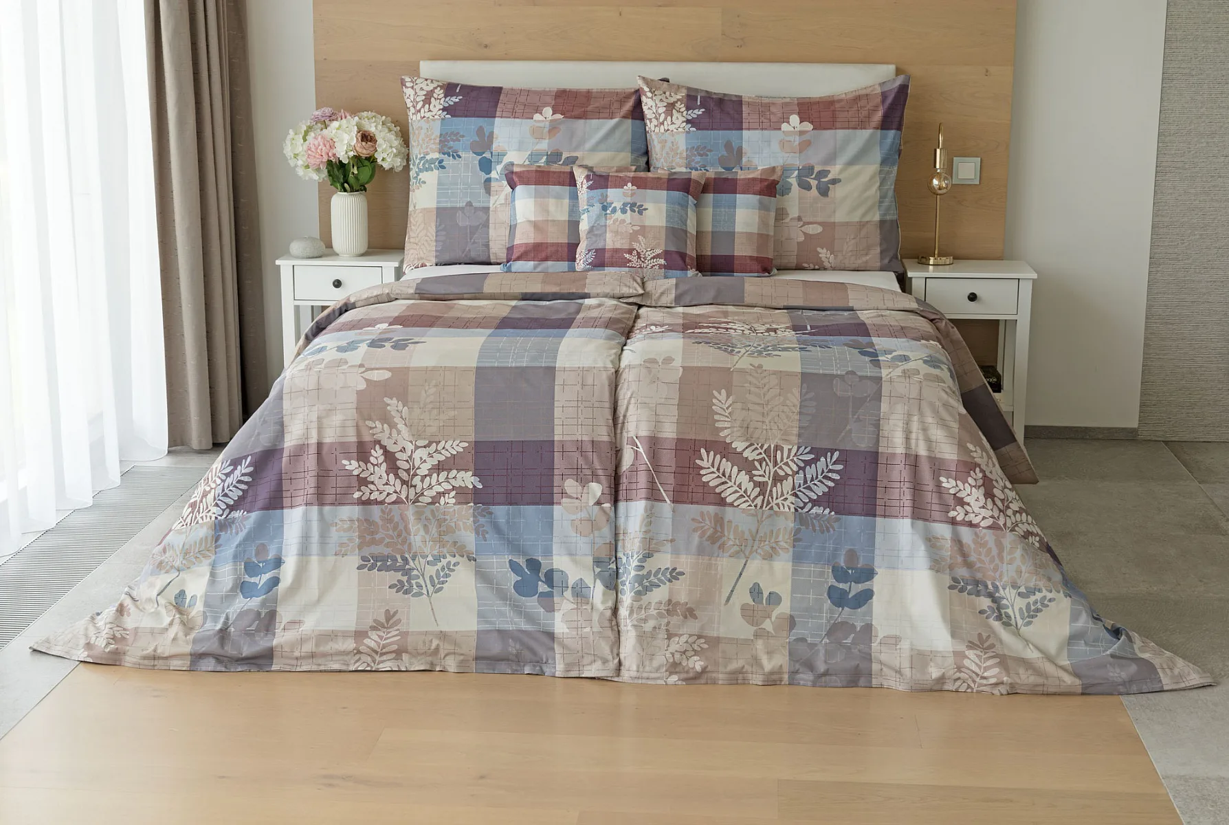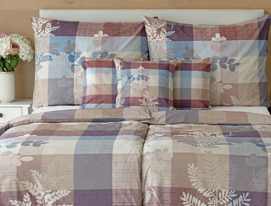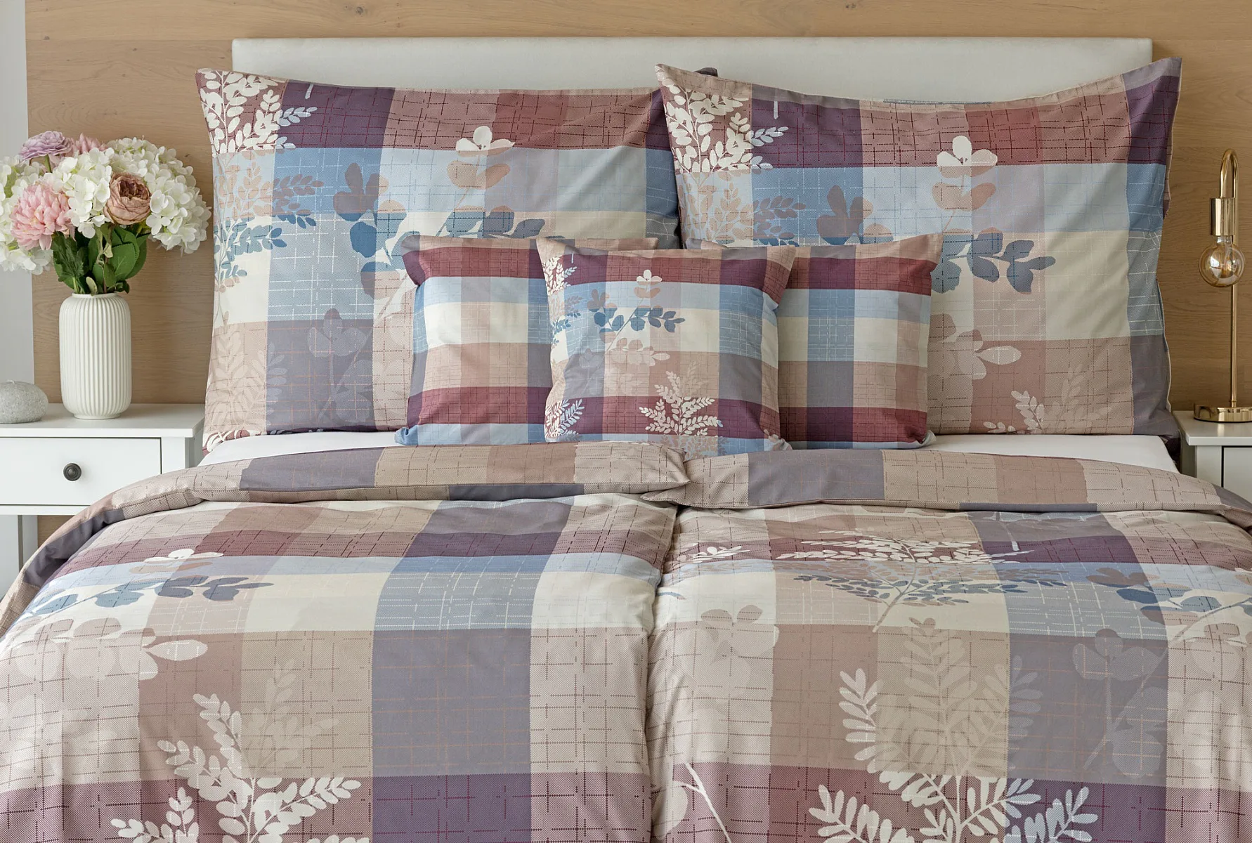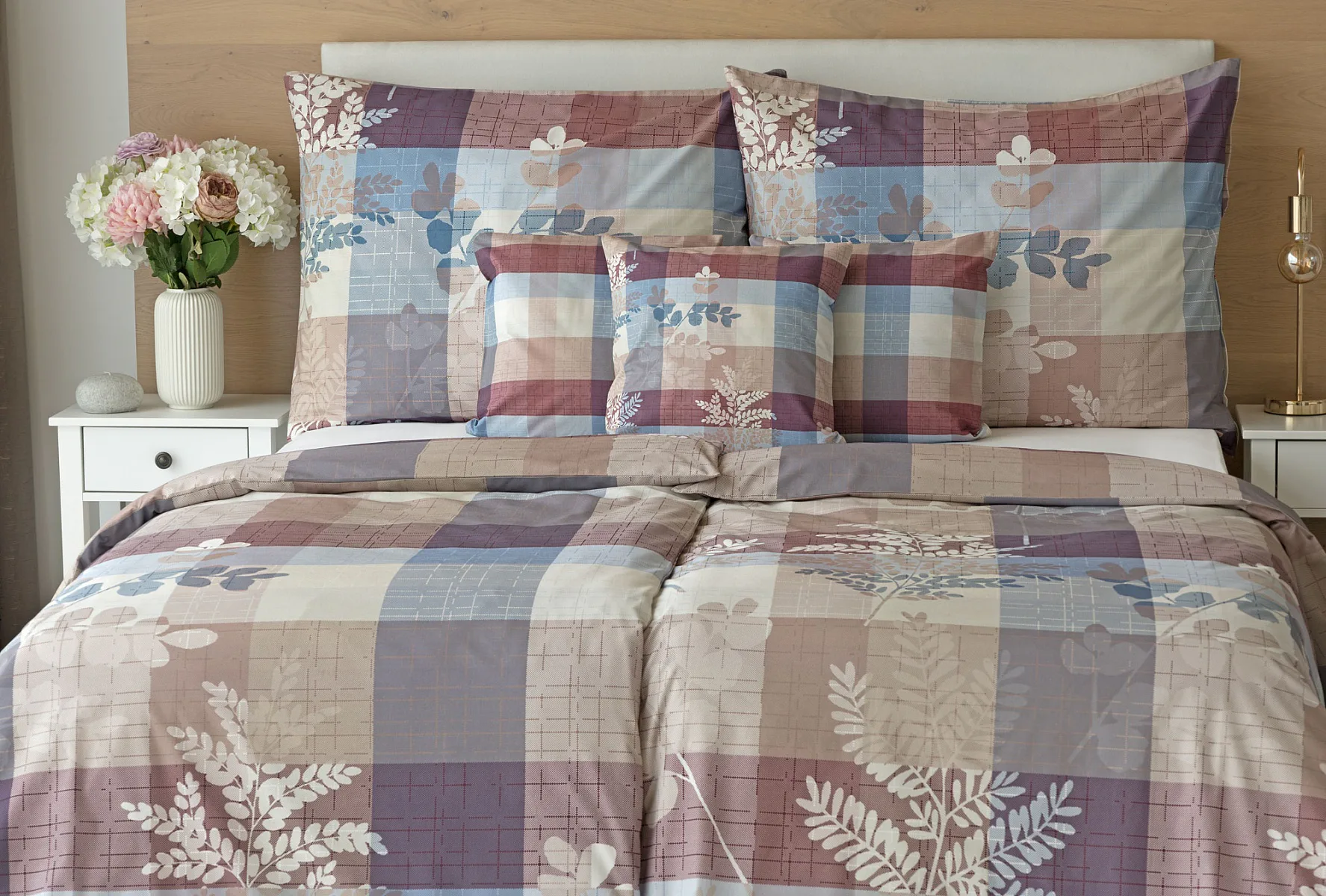 Bavlněné povlečení Carlo s originálním geometrickým vzorem doladí moderní interiér i rustikálně zařízenou ložnici. Kombinace odstínů modré, vínové a přírodní béžové utváří atraktivní celek, který navíc zdobí decentní florální motiv.