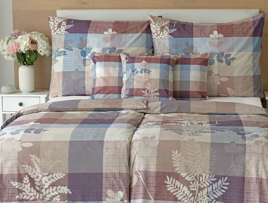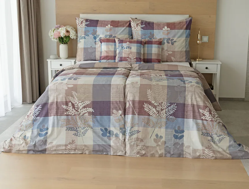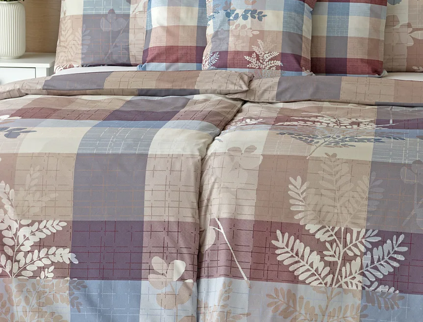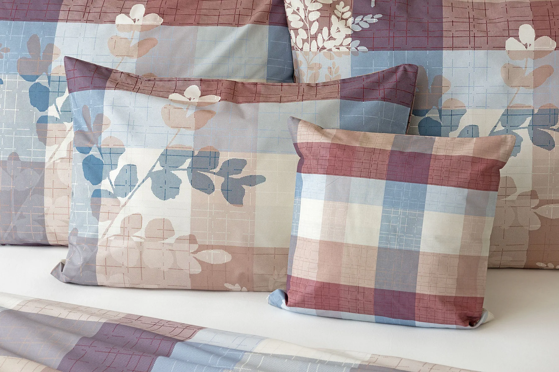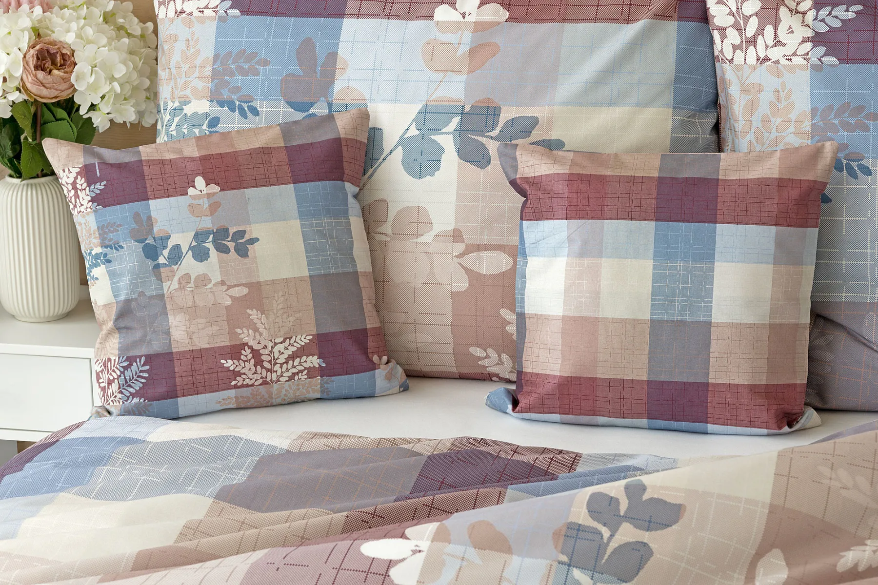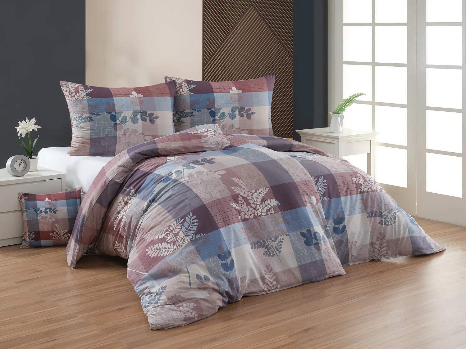 Bavlněné povlečení Carlo s originálním geometrickým vzorem doladí moderní interiér i rustikálně zařízenou ložnici. Kombinace odstínů modré, vínové a přírodní béžové utváří atraktivní celek, který navíc zdobí decentní florální motiv.