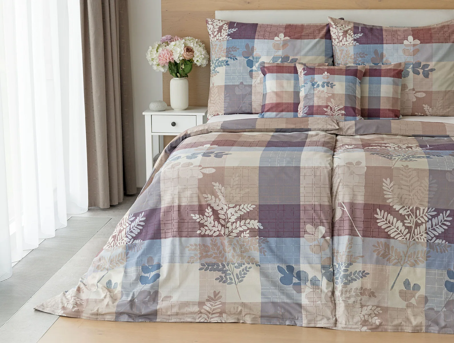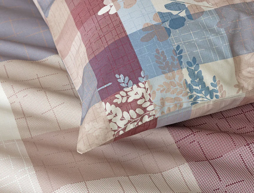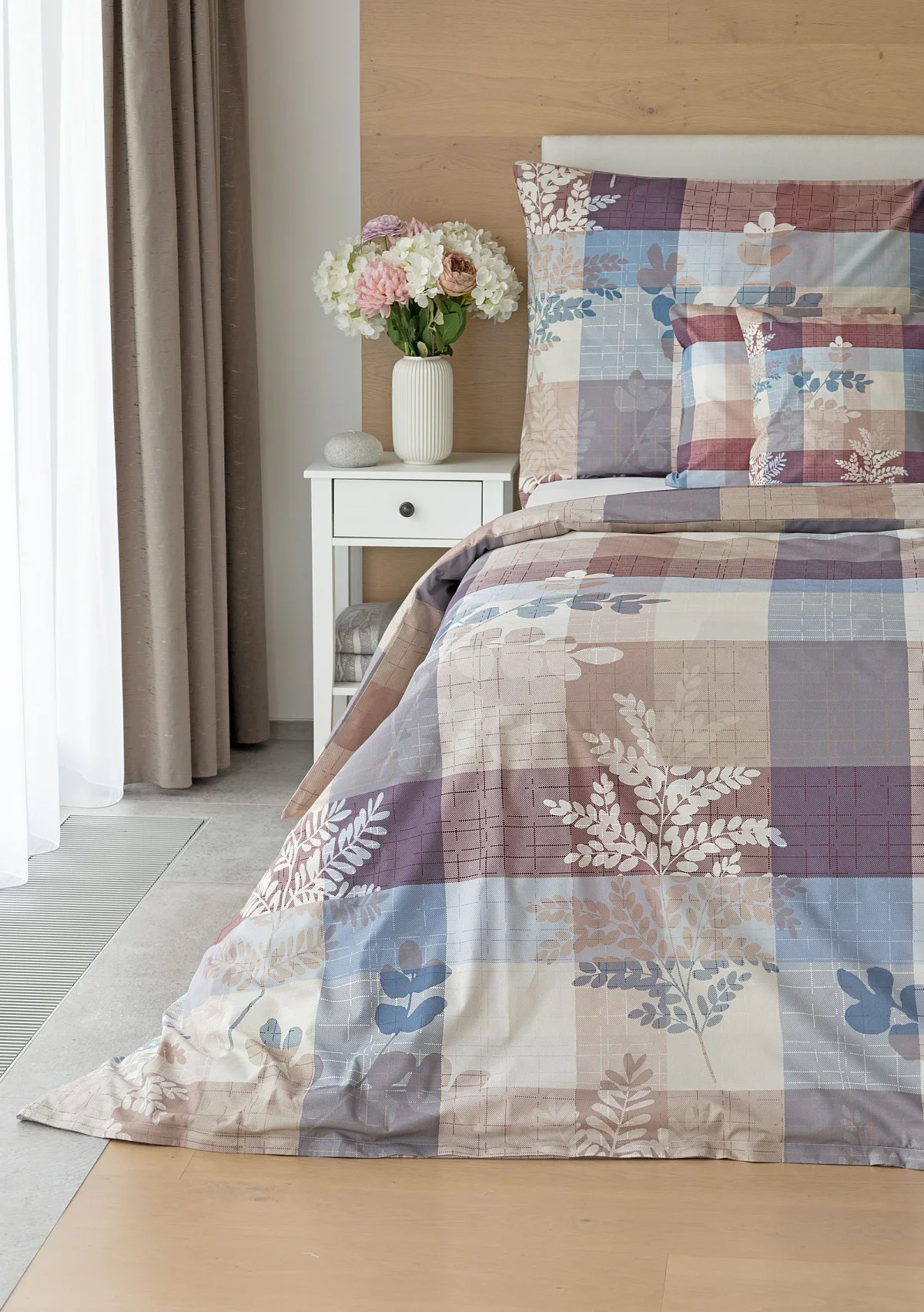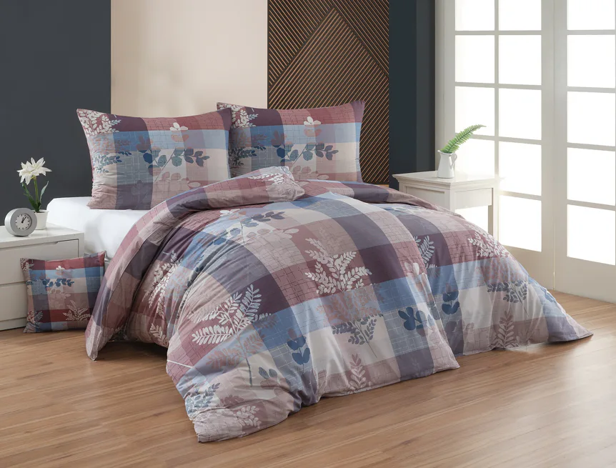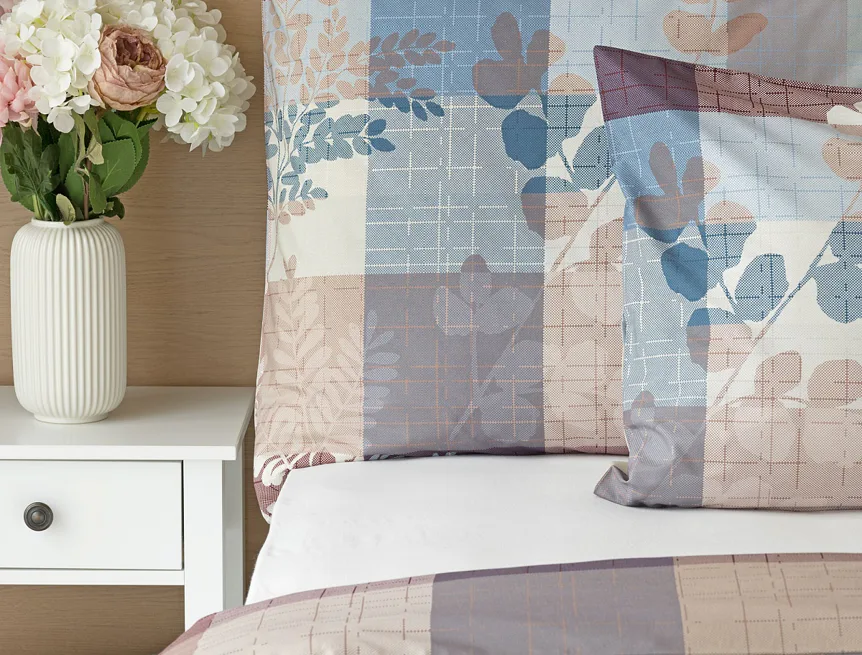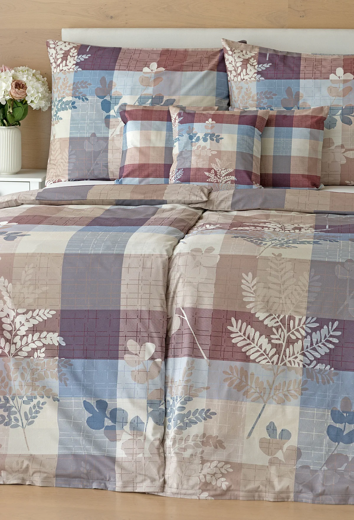 Bavlněné povlečení Carlo s originálním geometrickým vzorem doladí moderní interiér i rustikálně zařízenou ložnici. Kombinace odstínů modré, vínové a přírodní béžové utváří atraktivní celek, který navíc zdobí decentní florální motiv.
