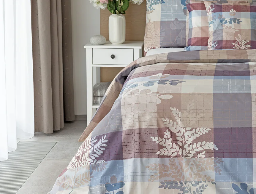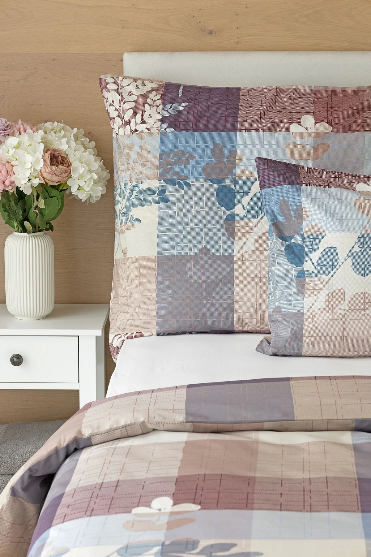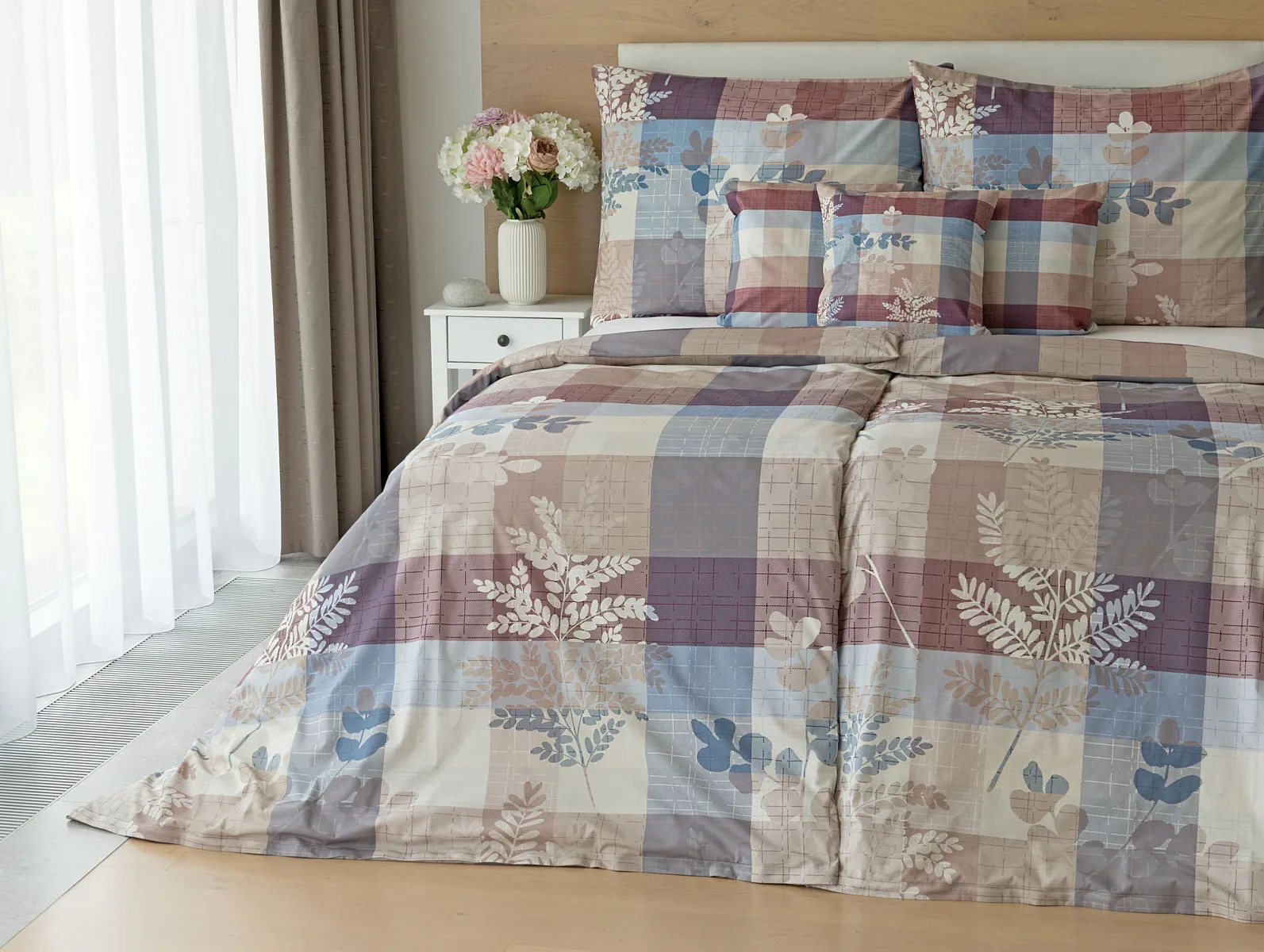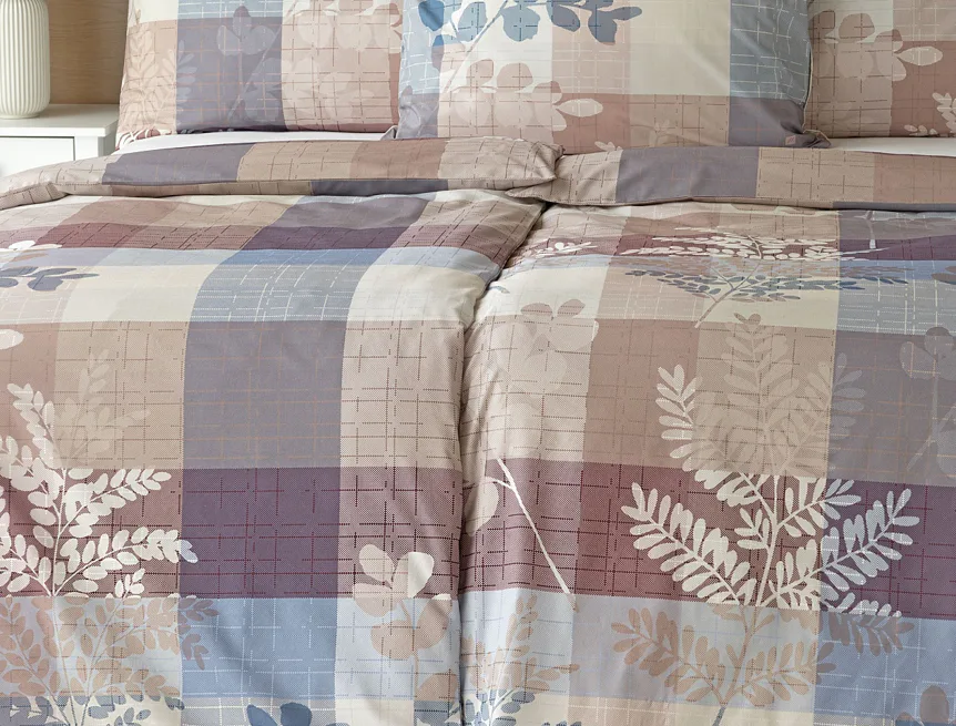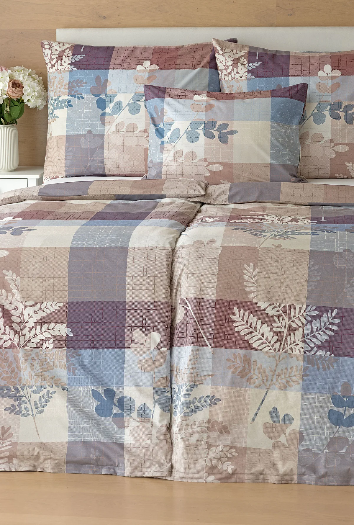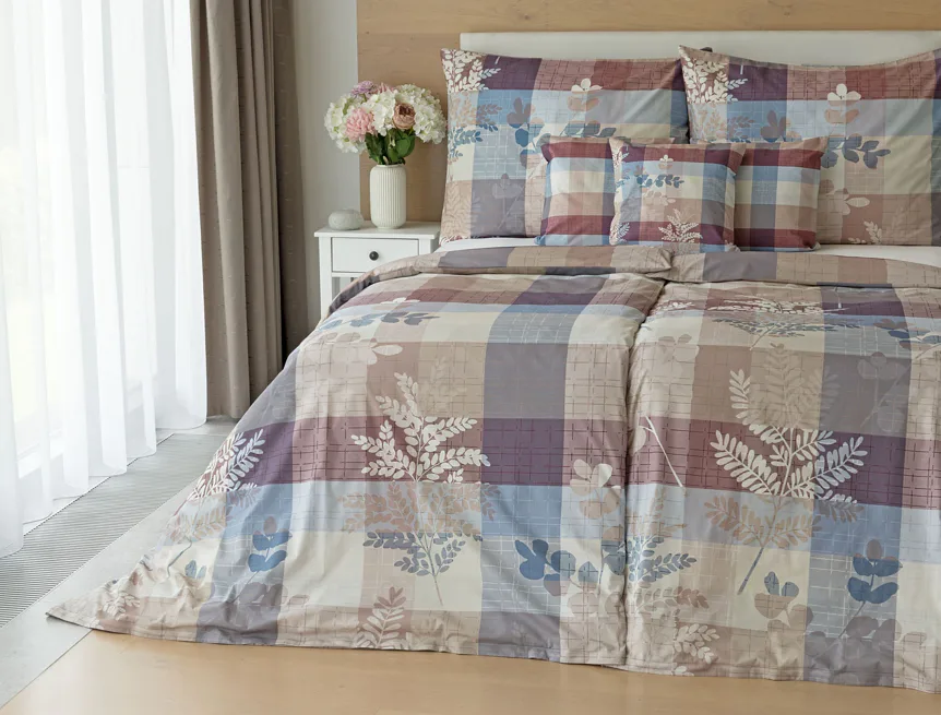 Bavlněné povlečení Carlo s originálním geometrickým vzorem doladí moderní interiér i rustikálně zařízenou ložnici. Kombinace odstínů modré, vínové a přírodní béžové utváří atraktivní celek, který navíc zdobí decentní florální motiv.