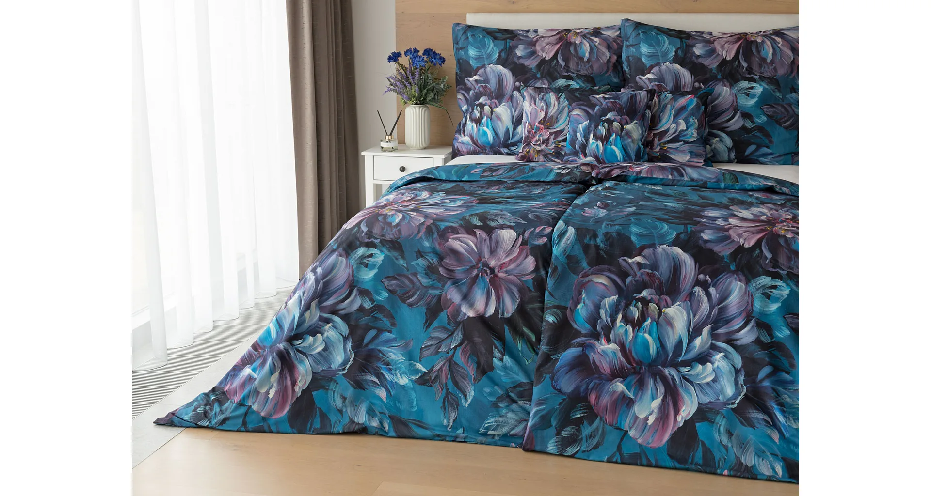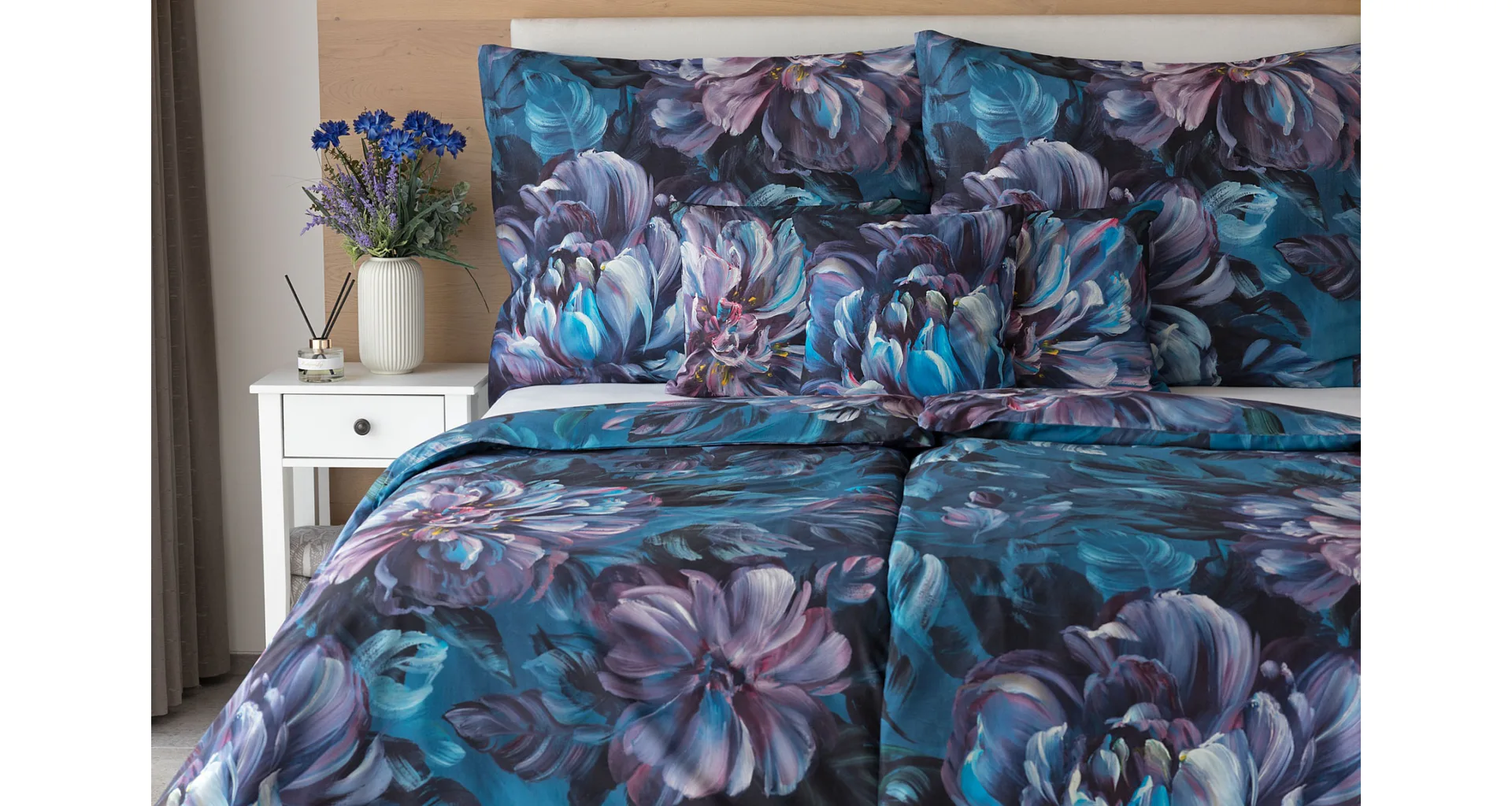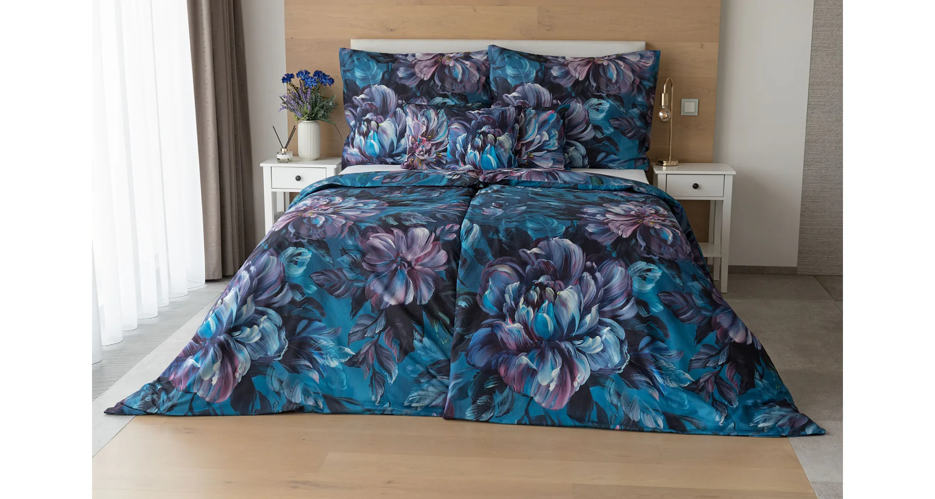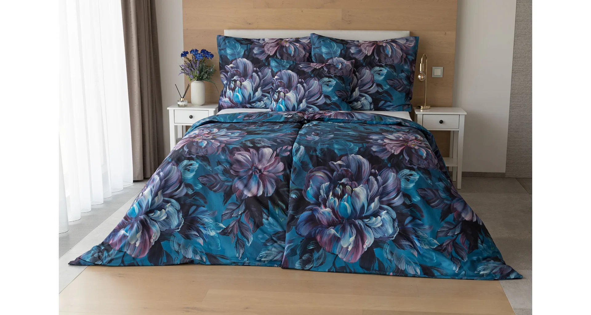 Vychutnejte si magické souznění barev v květinové malbě, která je v jedinečném detailu přenesena na bavlněné ložní povlečení Christine. Převažující petrolejové tóny hravě doplňuje paleta růžových a fialových odstínů. Díky nejmodernější digitální tiskové technologii se povlečení pyšní precizním detailem potisku.