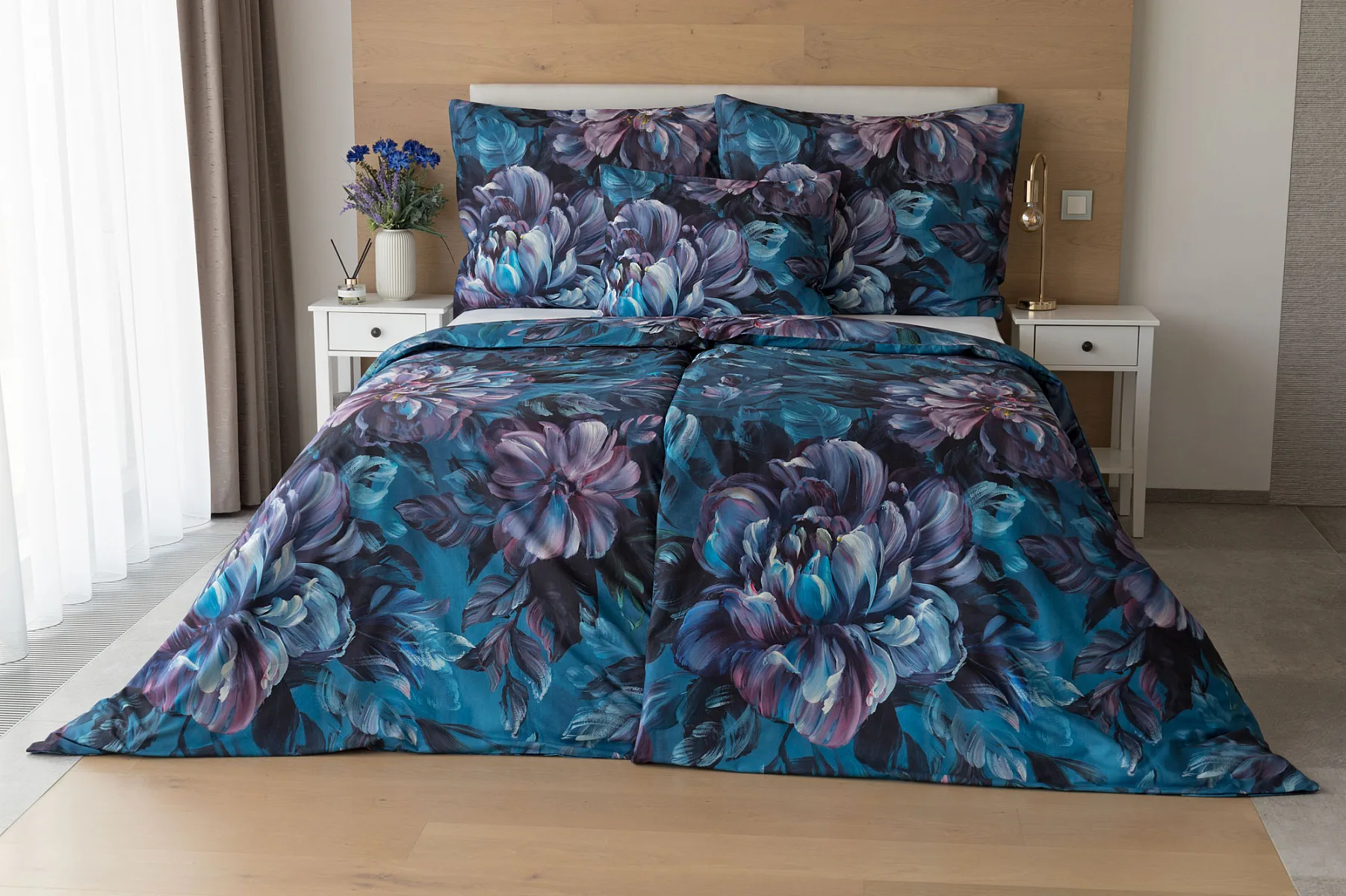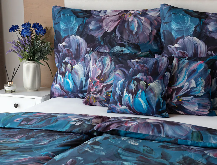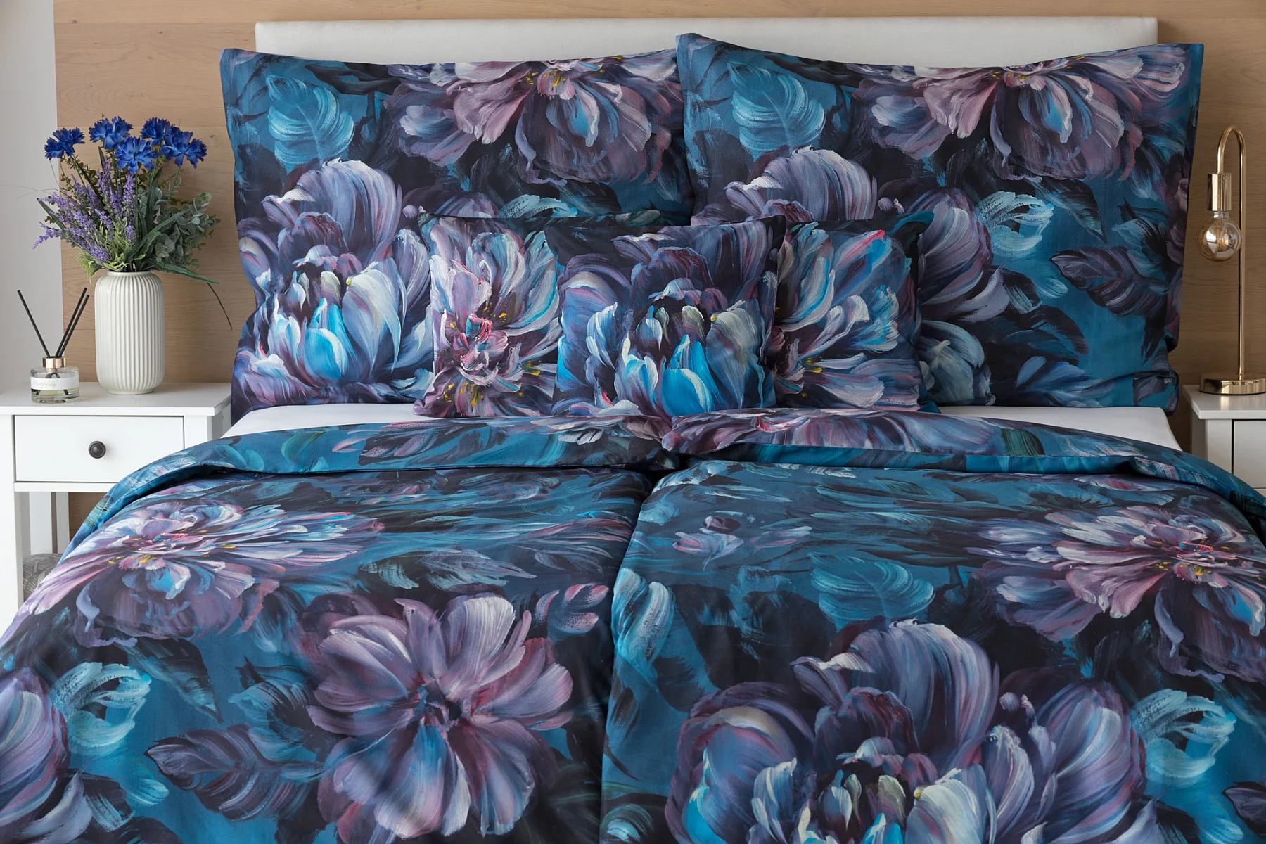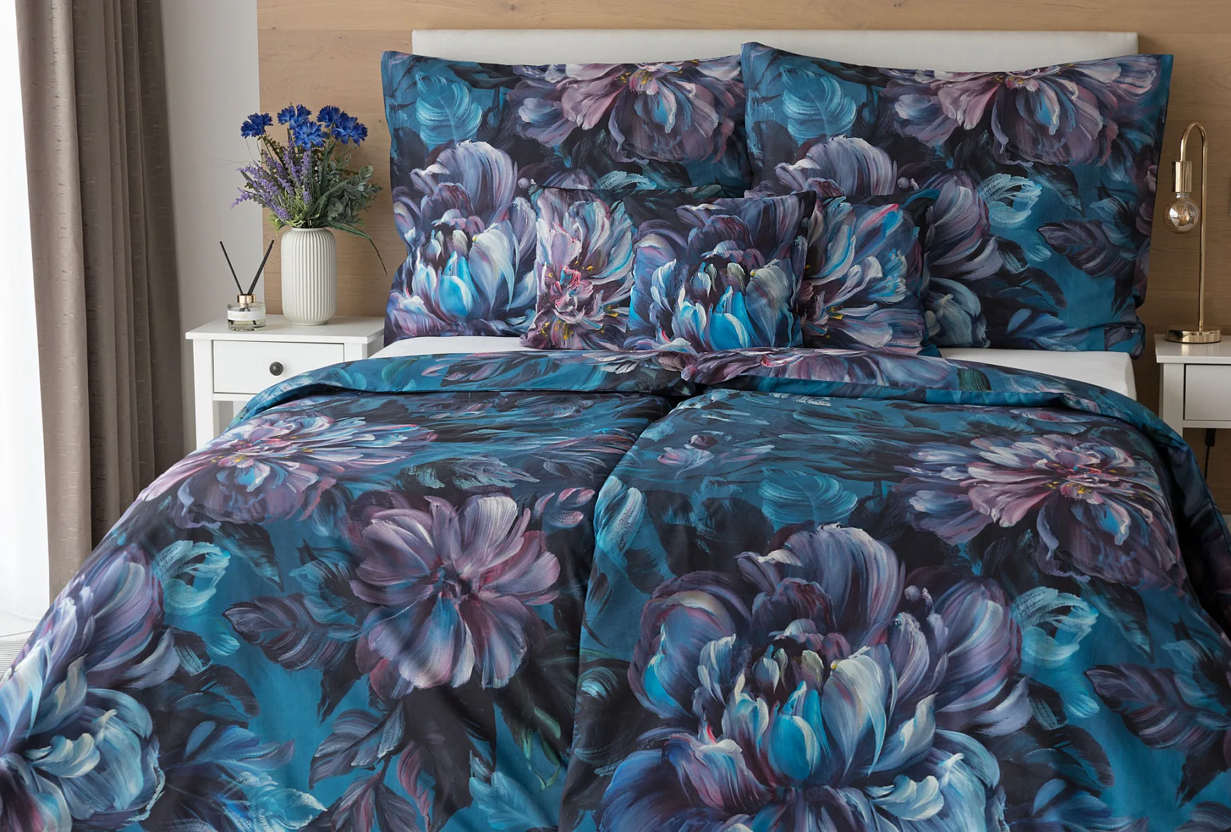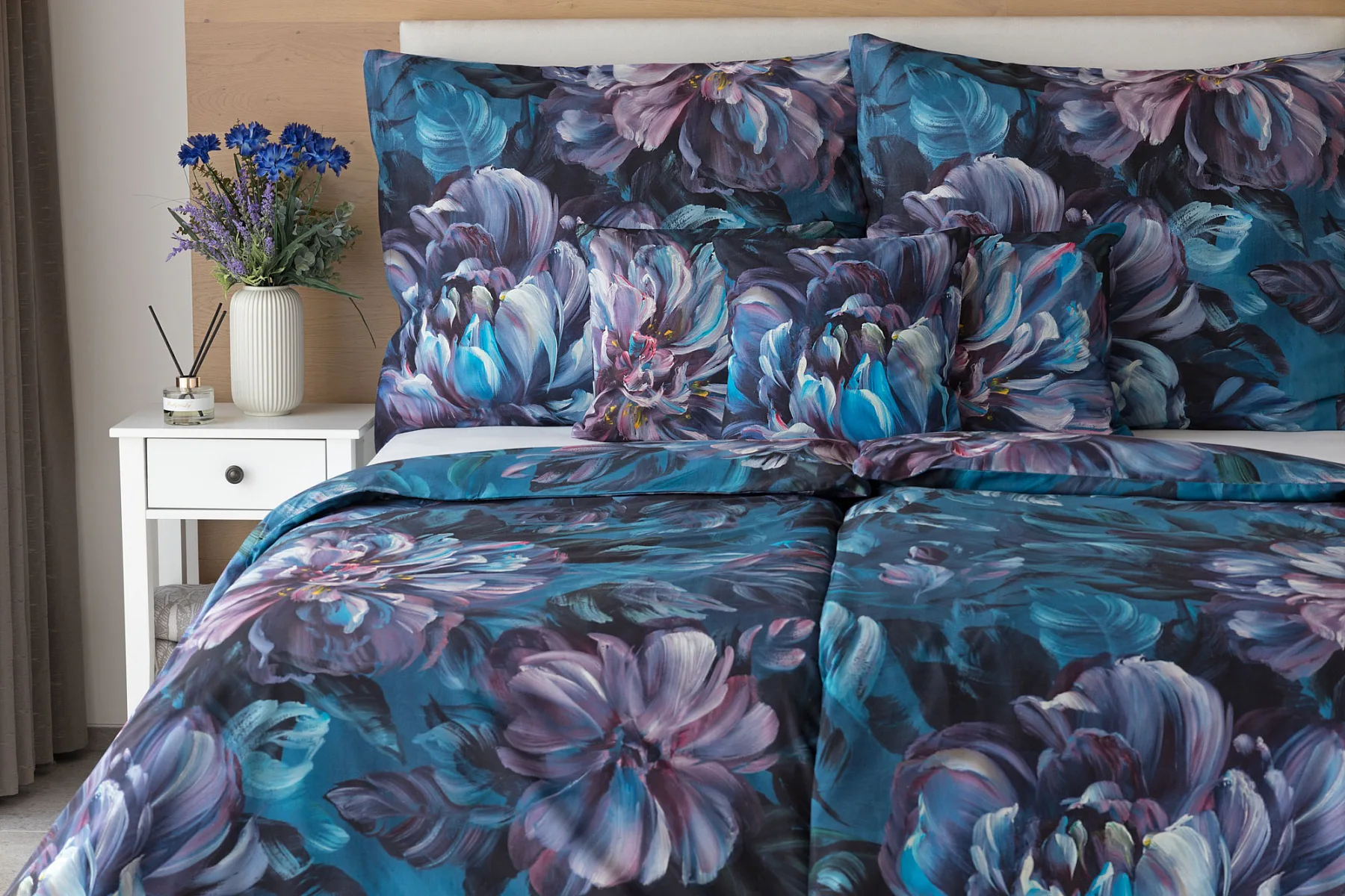 Vychutnejte si magické souznění barev v květinové malbě, která je v jedinečném detailu přenesena na bavlněné ložní povlečení Christine. Převažující petrolejové tóny hravě doplňuje paleta růžových a fialových odstínů. Díky nejmodernější digitální tiskové technologii se povlečení pyšní precizním detailem potisku.