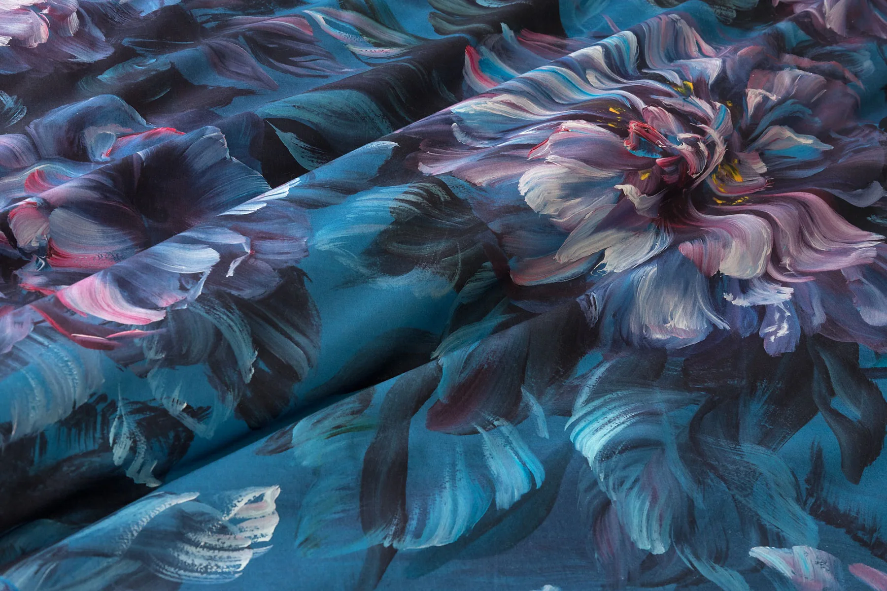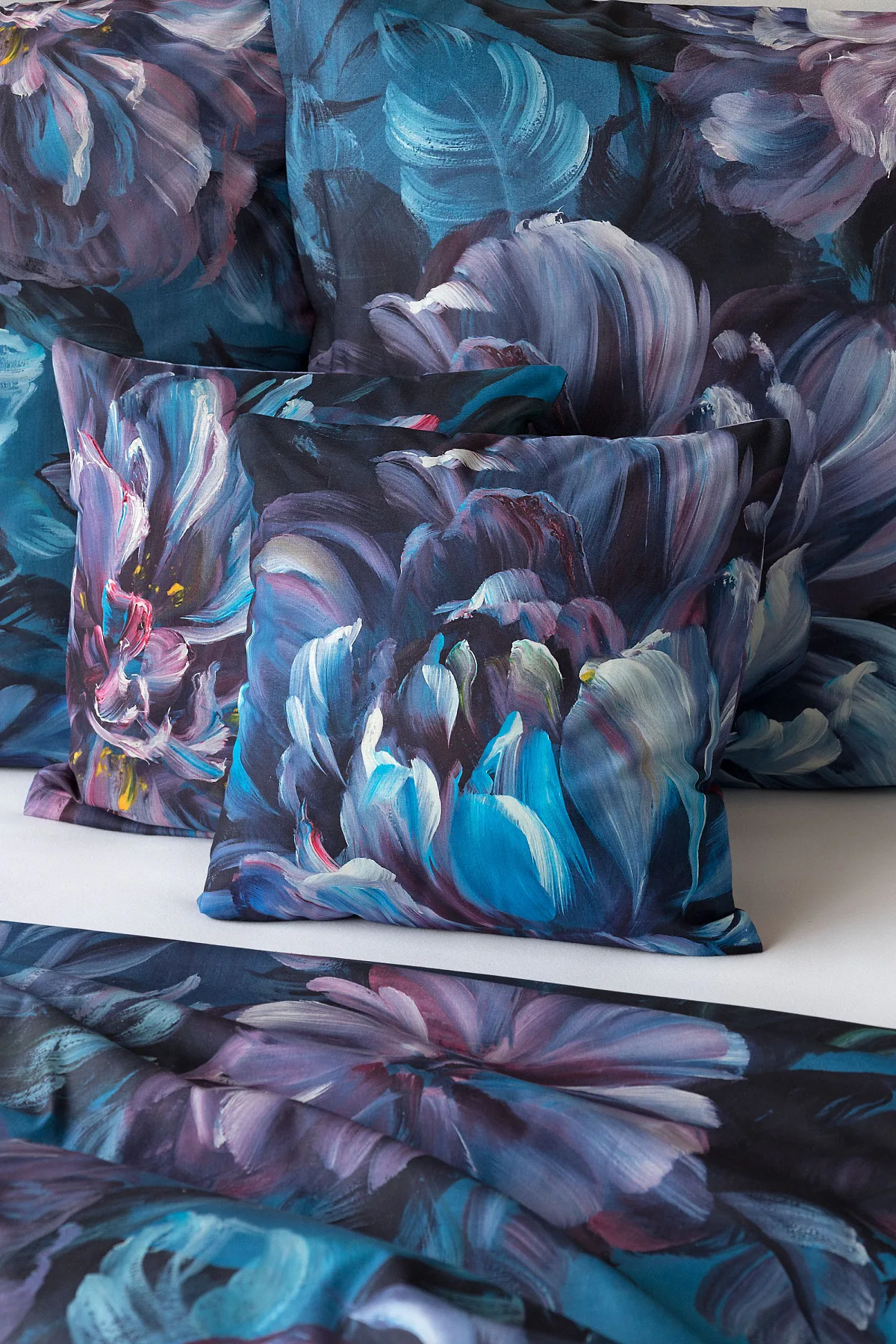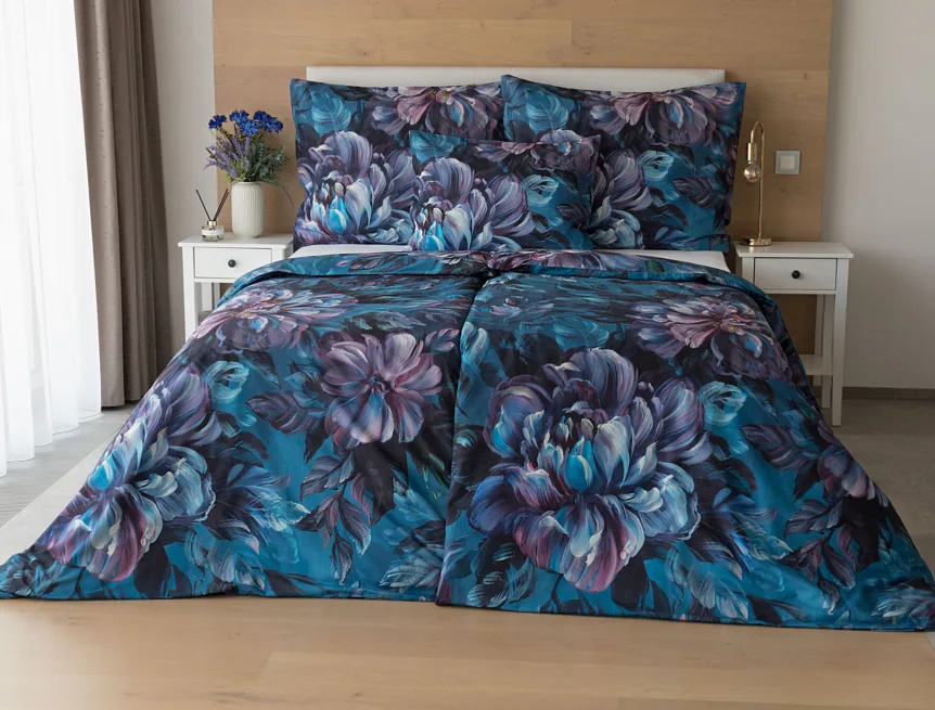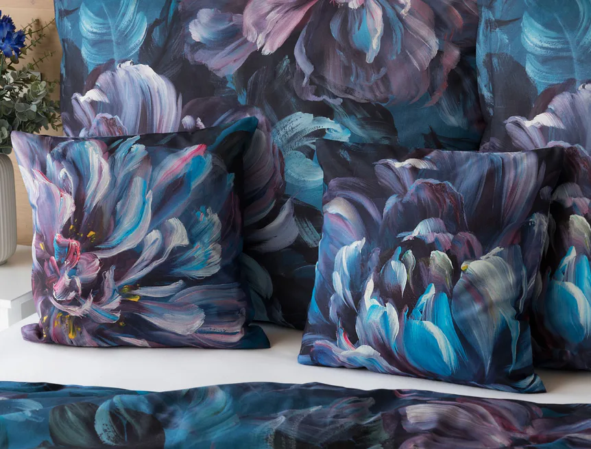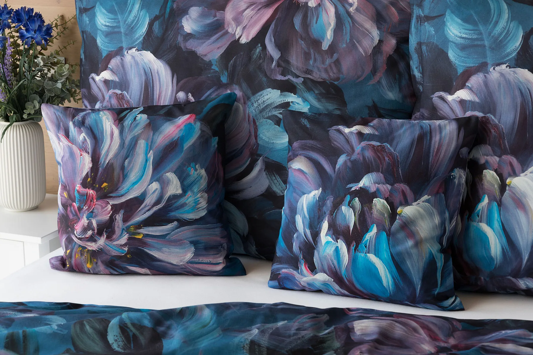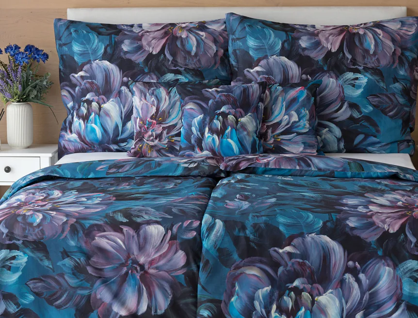 Vychutnejte si magické souznění barev v květinové malbě, která je v jedinečném detailu přenesena na bavlněné ložní povlečení Christine. Převažující petrolejové tóny hravě doplňuje paleta růžových a fialových odstínů. Díky nejmodernější digitální tiskové technologii se povlečení pyšní precizním detailem potisku.