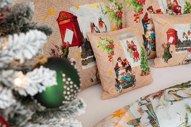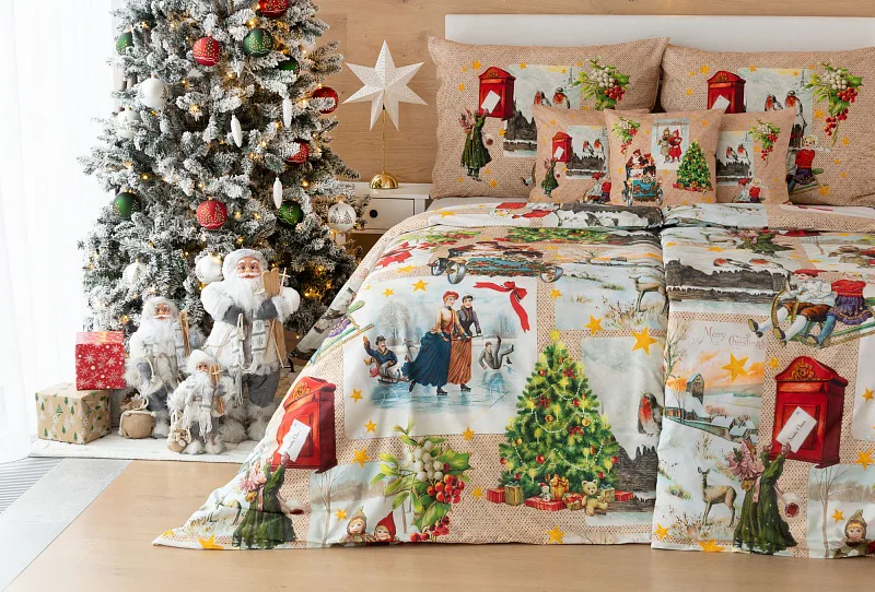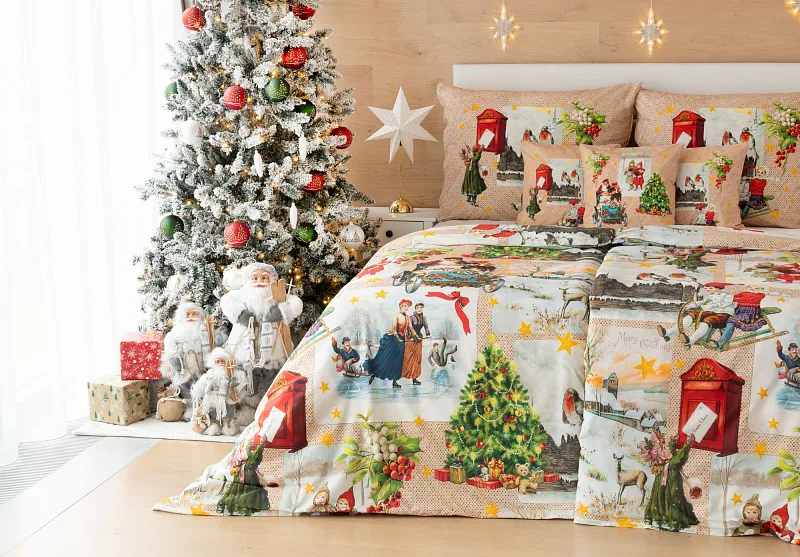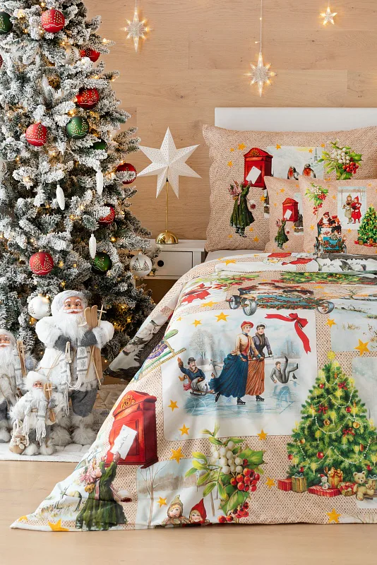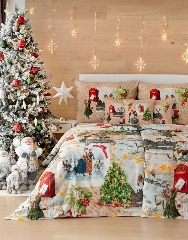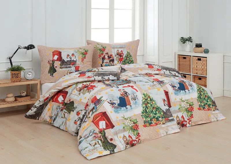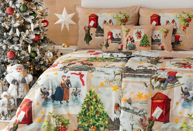 Veselé bavlněné povlečení Christmas Vintage je tím pravým poslem Vánoc. Snad všechny tradiční motivy, které se vám vybaví v souvislosti s těmito kouzelnými svátky, najdete v důmyslně sestavené koláži. Pokud máte smysl pro detail a zalíbení ve vánočních dekoracích, pořiďte si tento sváteční klenot do ložnice i do dětského pokojíčku.