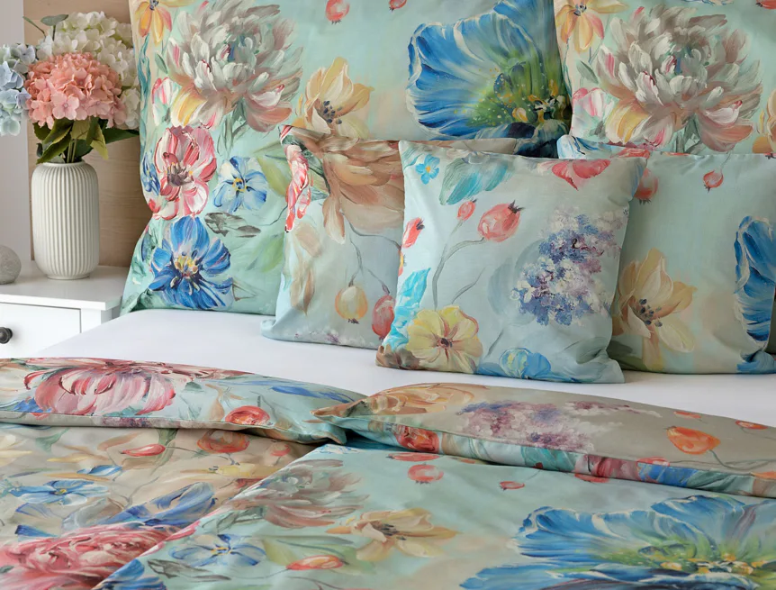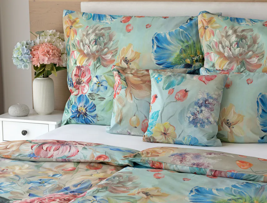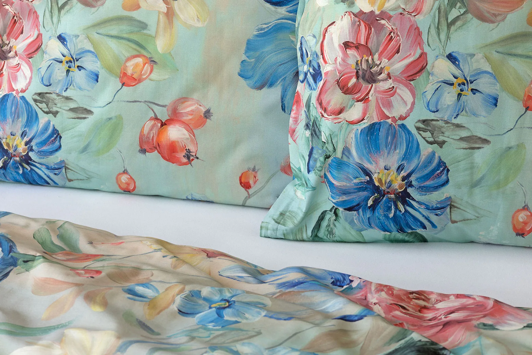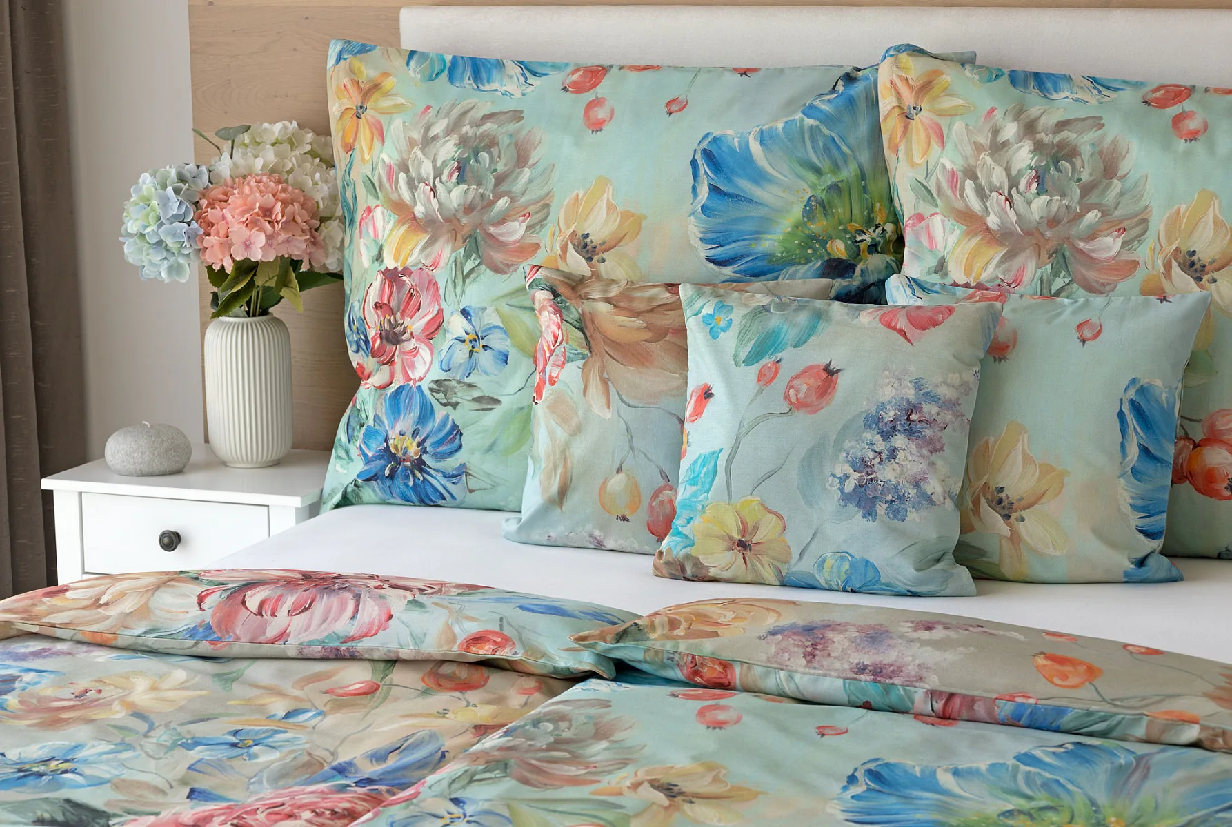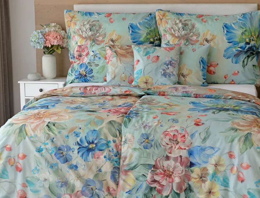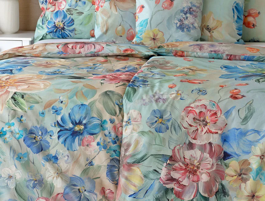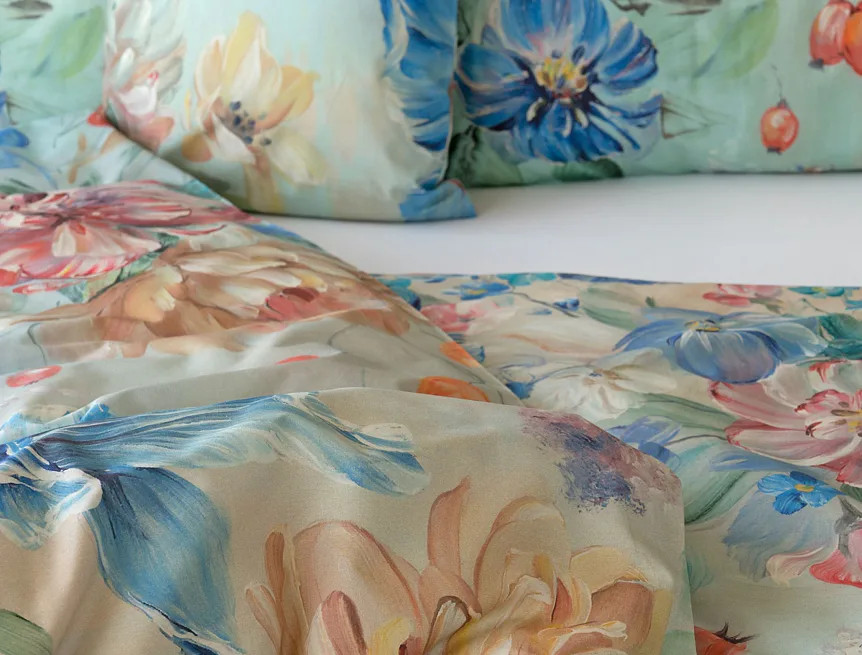 Bavlněné ložní povlečení Clara rozzáří vaši ložnici. Podkladem pestrobarevného květinového motivu se stala originální olejová malba, která i na látce vyniká v precizním detailu díky nejmodernějšímu digitálnímu tisku.