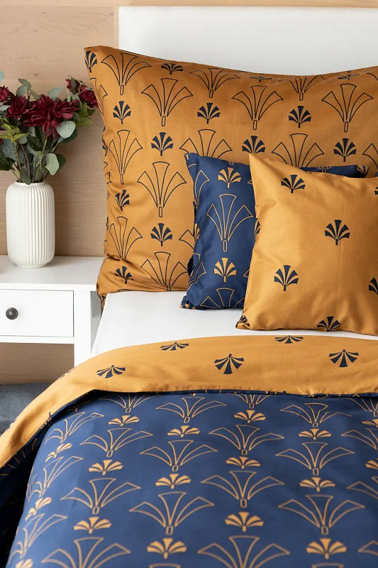 Noblesní vějířový vzor na povlečení CORDONA vnese do vaší ložnice skutečný luxus. Elegantní motivy ve zlatavém a temně modrém odstínu dokonale kontrastují a vytvářejí tak jedinečný celek.