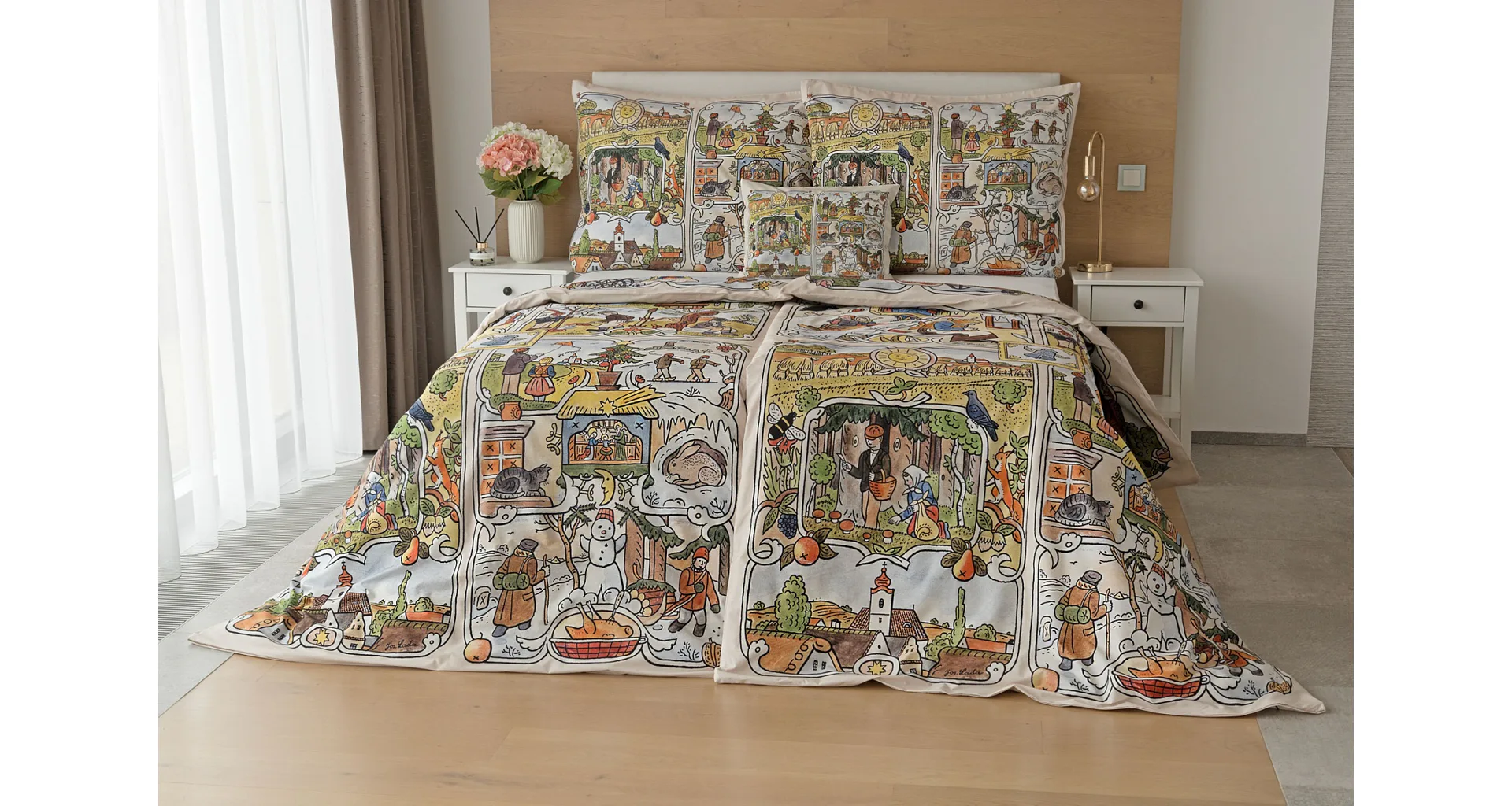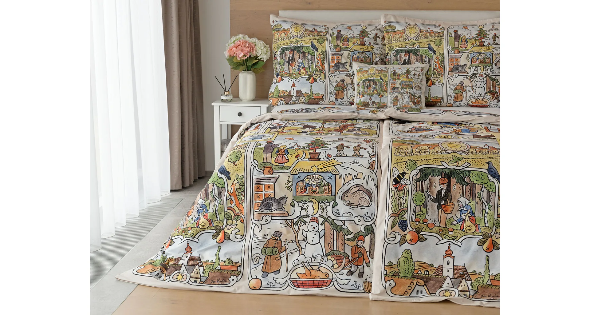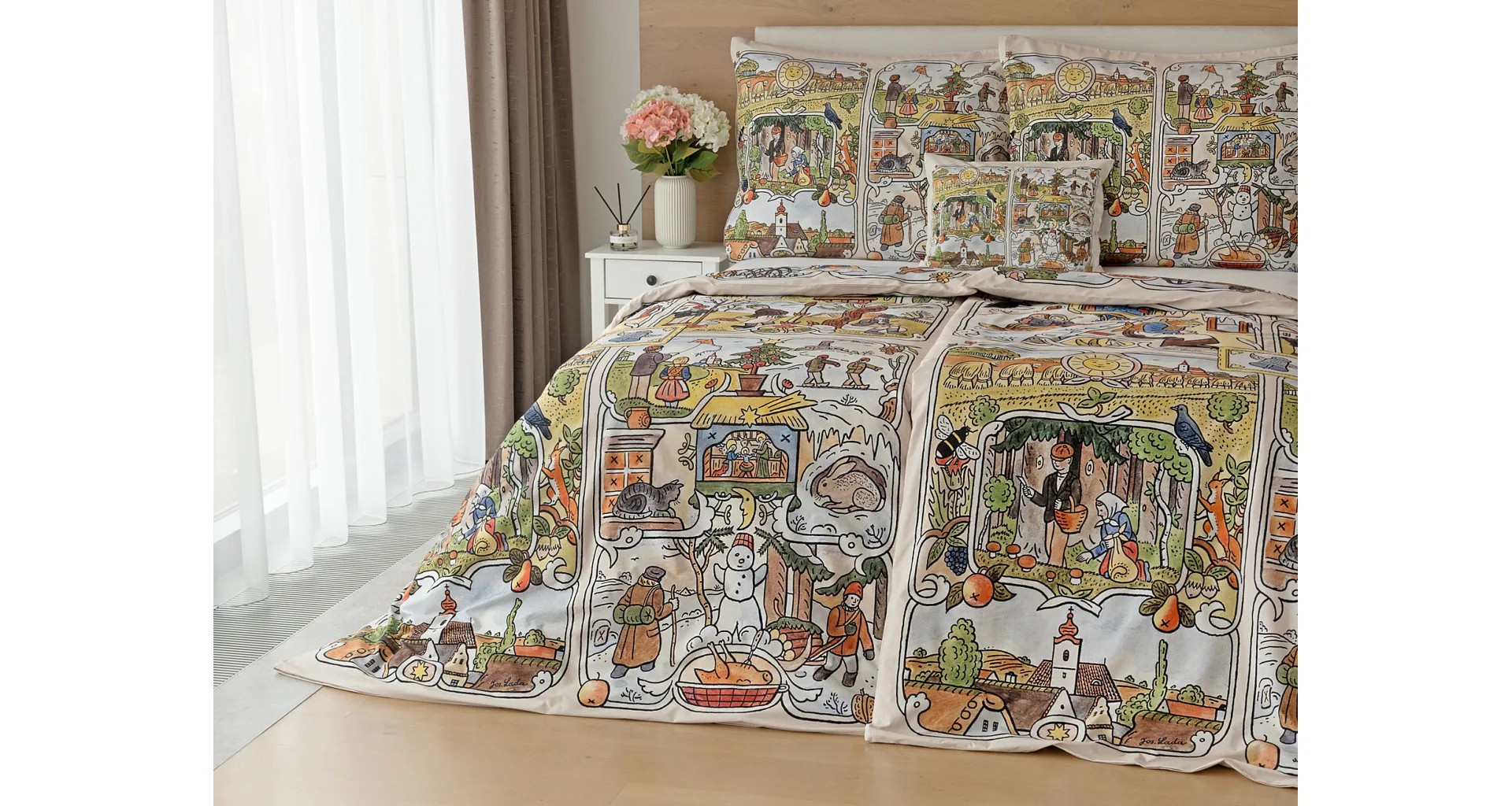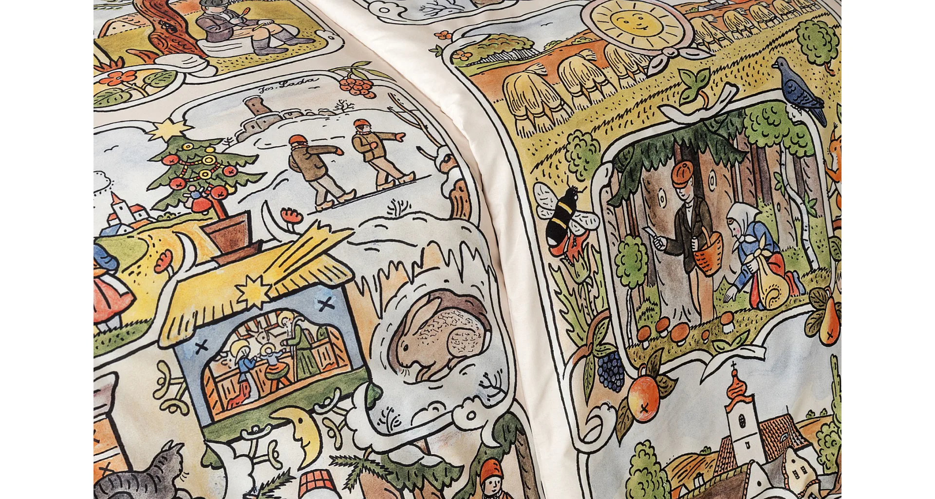 Půvabné kresby Josefa Lady v mnohých z nás probouzejí vzpomínky na bezstarostné dětství. Mají schopnost připomenout vůni rozkvetlé třešně či plápolajícího ohýnku. Zasníme se při pomyšlení na zimy plné sněhu. Vykouzlete si takovou kouzelnou atmosféru i u sebe doma díky bavlněnému povlečení Čtyři roční období. Díky příjemné paletě přírodních tónů a nestárnoucím tradičním motivům bude povlečení ozdobou každé ložnice.