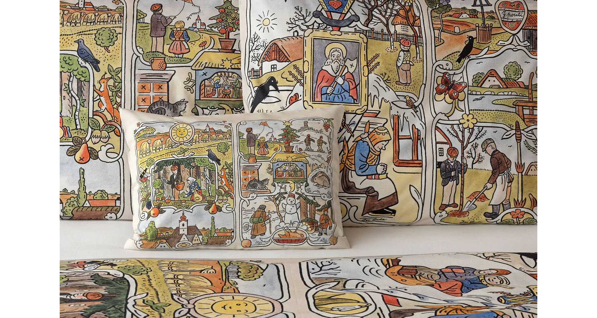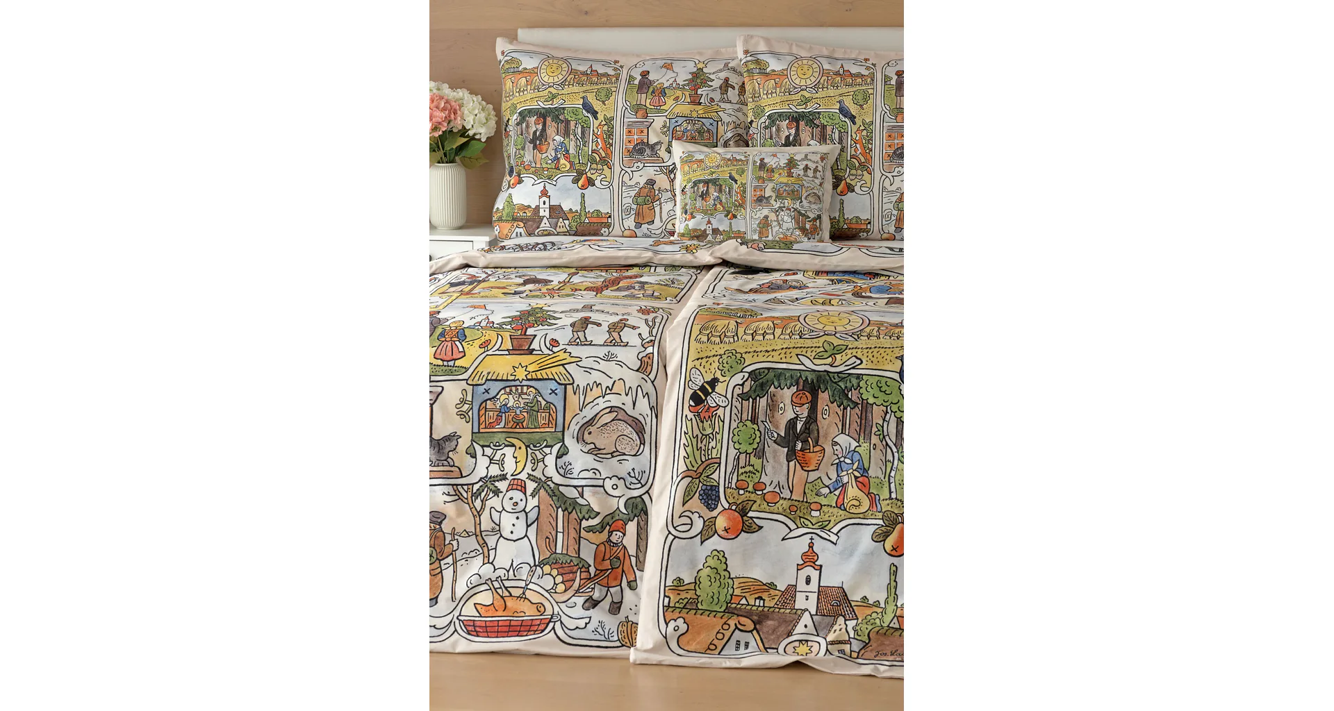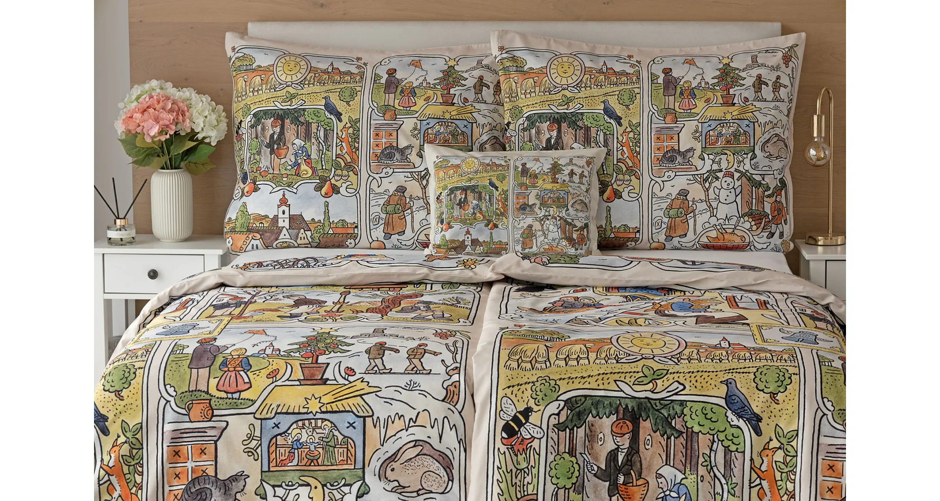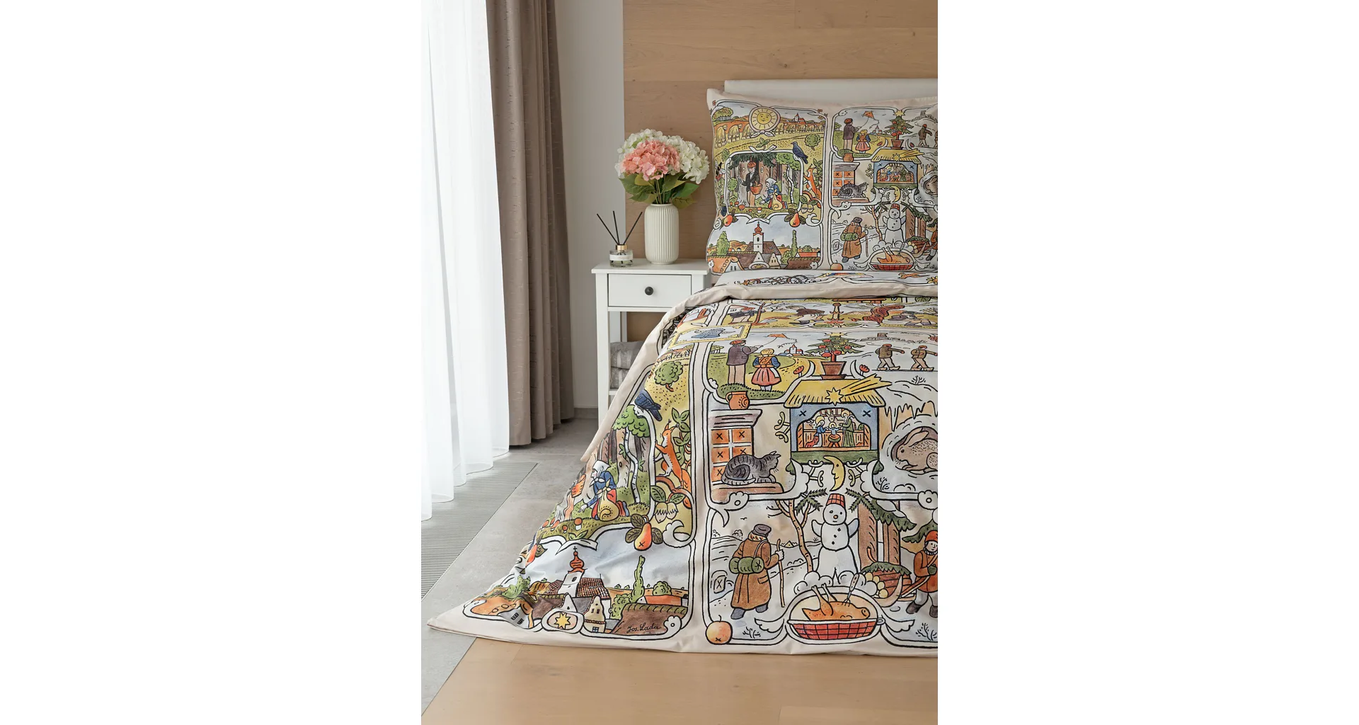 Půvabné kresby Josefa Lady v mnohých z nás probouzejí vzpomínky na bezstarostné dětství. Mají schopnost připomenout vůni rozkvetlé třešně či plápolajícího ohýnku. Zasníme se při pomyšlení na zimy plné sněhu. Vykouzlete si takovou kouzelnou atmosféru i u sebe doma díky bavlněnému povlečení Čtyři roční období. Díky příjemné paletě přírodních tónů a nestárnoucím tradičním motivům bude povlečení ozdobou každé ložnice.