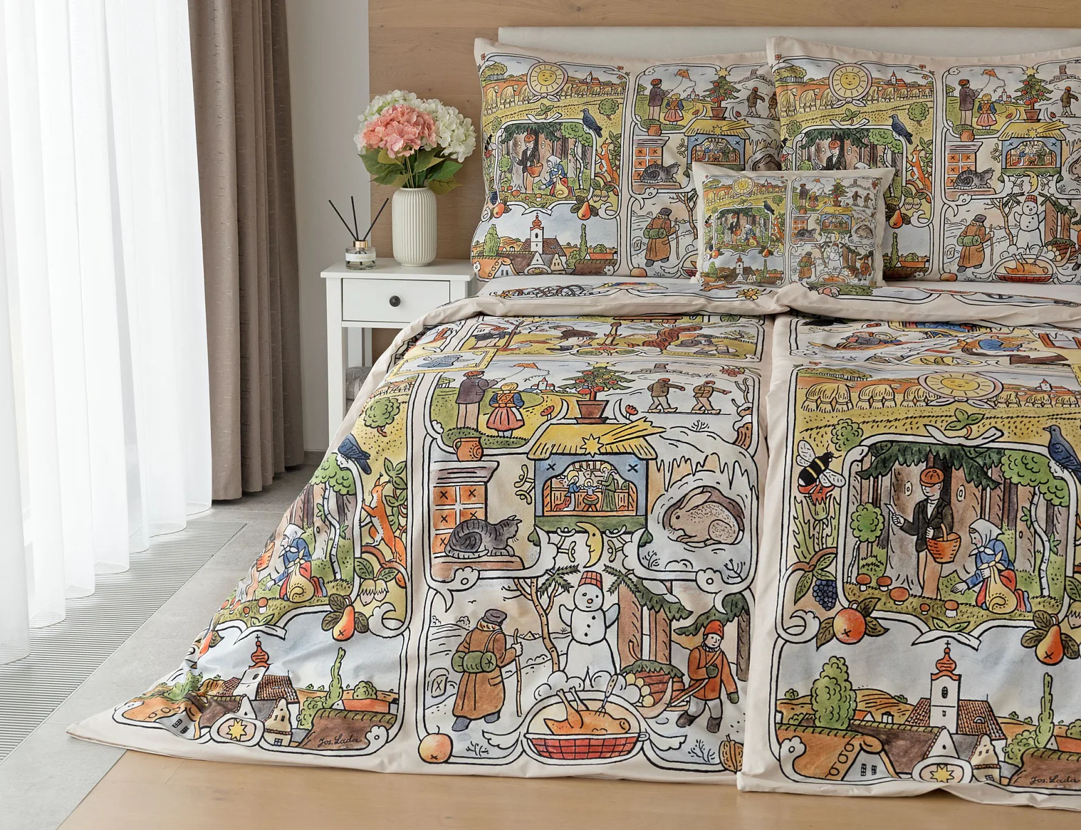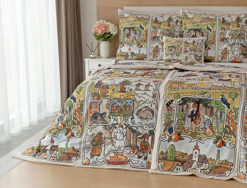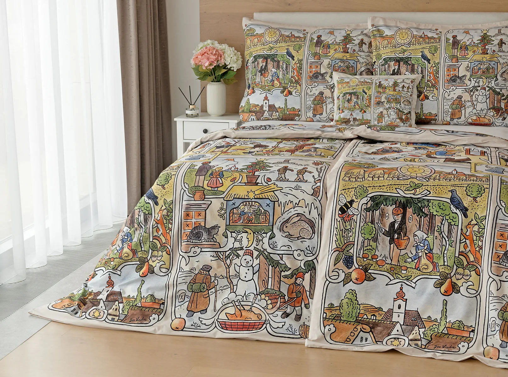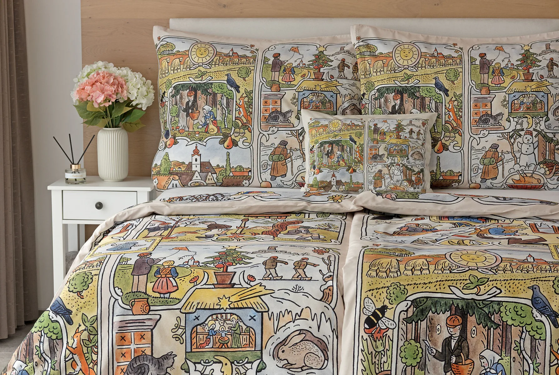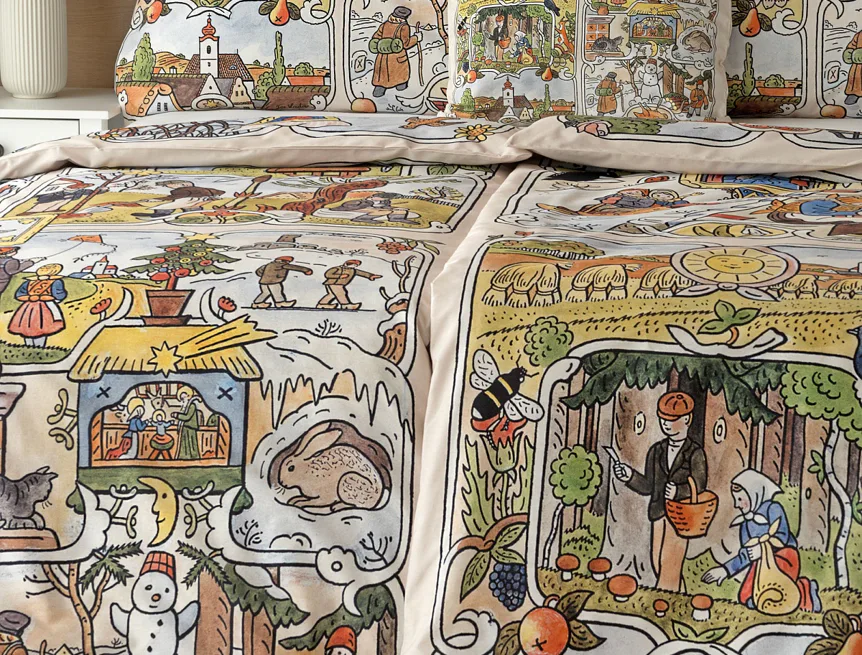 Půvabné kresby Josefa Lady v mnohých z nás probouzejí vzpomínky na bezstarostné dětství. Mají schopnost připomenout vůni rozkvetlé třešně či plápolajícího ohýnku. Zasníme se při pomyšlení na zimy plné sněhu. Vykouzlete si takovou kouzelnou atmosféru i u sebe doma díky bavlněnému povlečení Čtyři roční období. Díky příjemné paletě přírodních tónů a nestárnoucím tradičním motivům bude povlečení ozdobou každé ložnice.