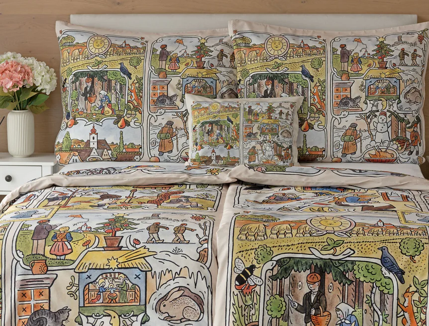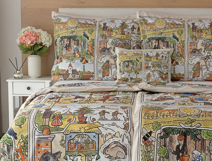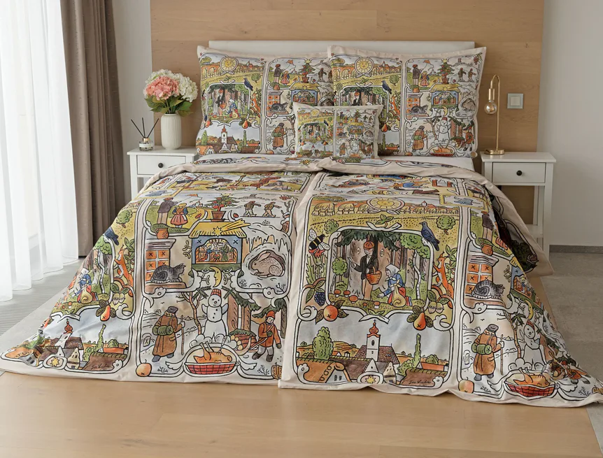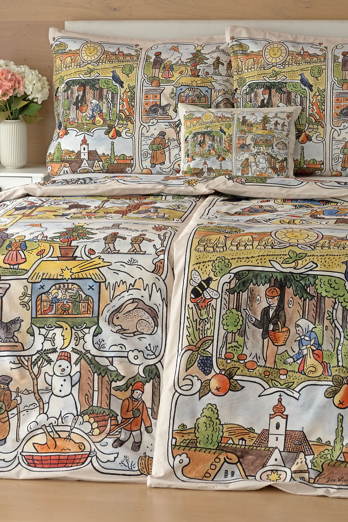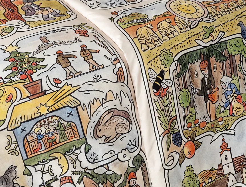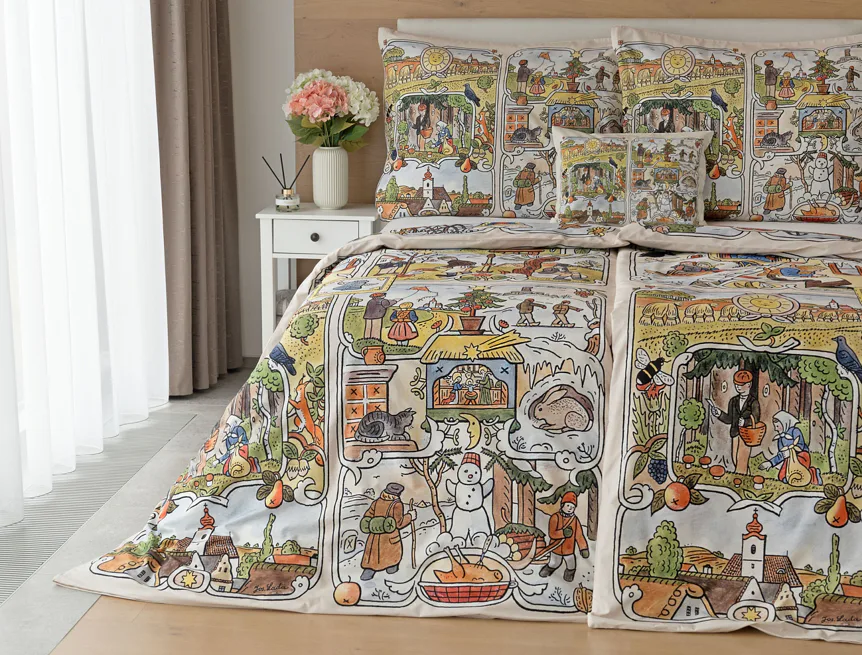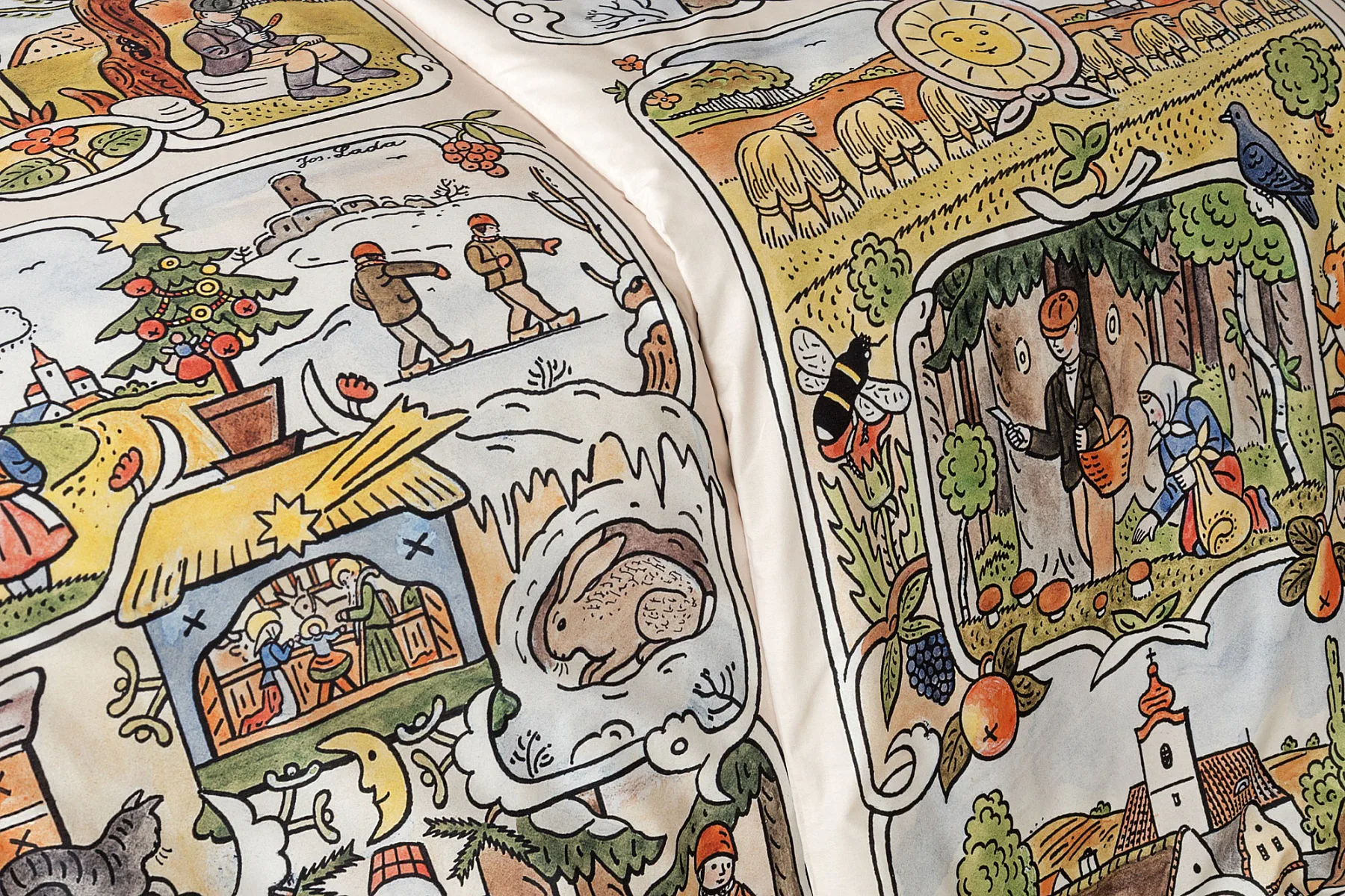 Půvabné kresby Josefa Lady v mnohých z nás probouzejí vzpomínky na bezstarostné dětství. Mají schopnost připomenout vůni rozkvetlé třešně či plápolajícího ohýnku. Zasníme se při pomyšlení na zimy plné sněhu. Vykouzlete si takovou kouzelnou atmosféru i u sebe doma díky bavlněnému povlečení Čtyři roční období. Díky příjemné paletě přírodních tónů a nestárnoucím tradičním motivům bude povlečení ozdobou každé ložnice.