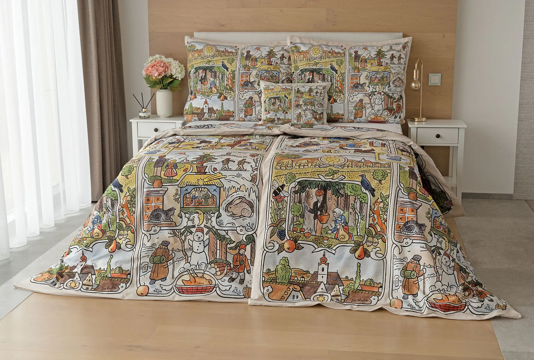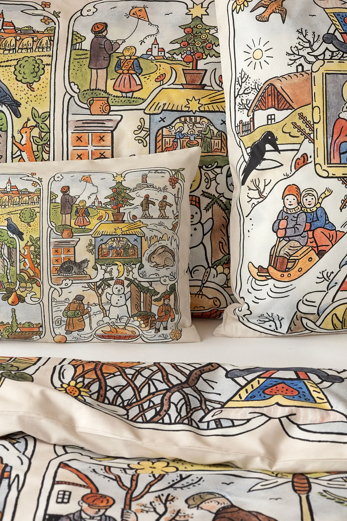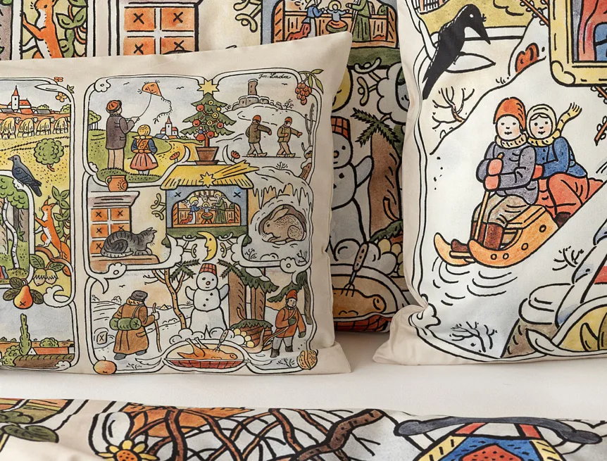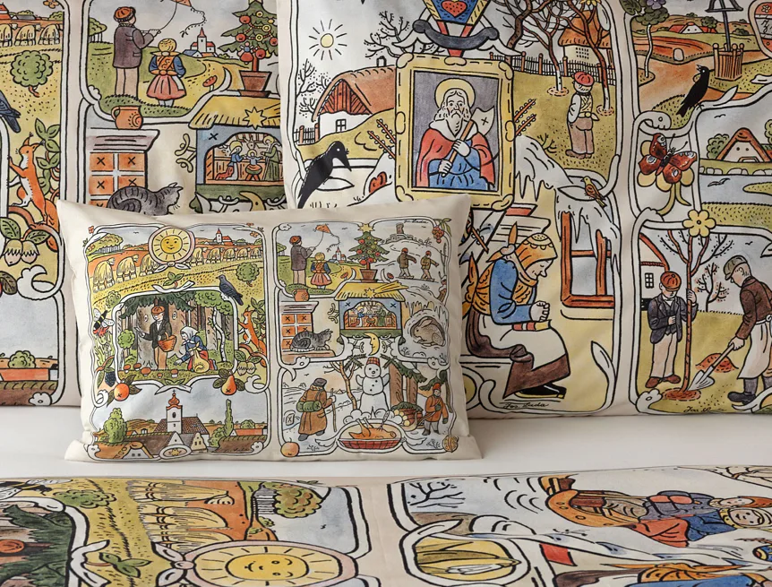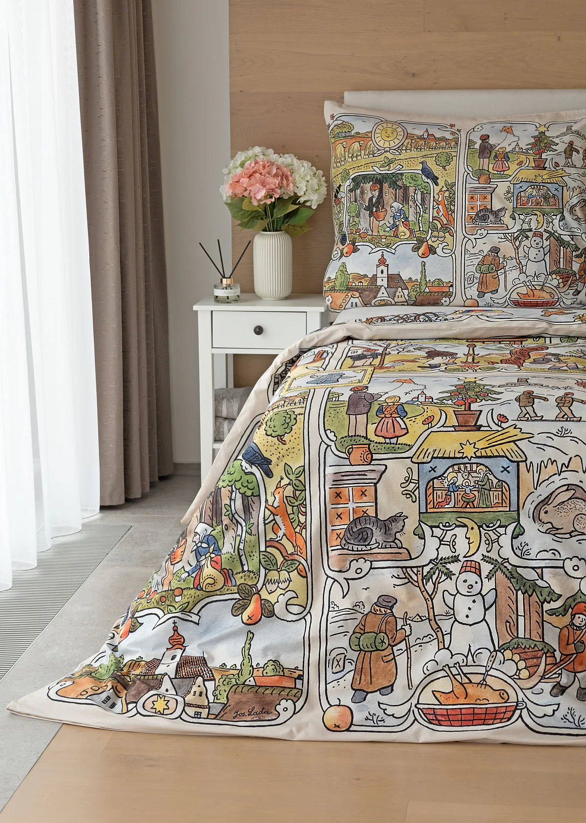 Půvabné kresby Josefa Lady v mnohých z nás probouzejí vzpomínky na bezstarostné dětství. Mají schopnost připomenout vůni rozkvetlé třešně či plápolajícího ohýnku. Zasníme se při pomyšlení na zimy plné sněhu. Vykouzlete si takovou kouzelnou atmosféru i u sebe doma díky bavlněnému povlečení Čtyři roční období. Díky příjemné paletě přírodních tónů a nestárnoucím tradičním motivům bude povlečení ozdobou každé ložnice.