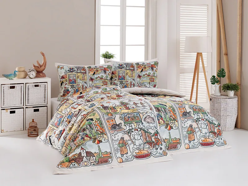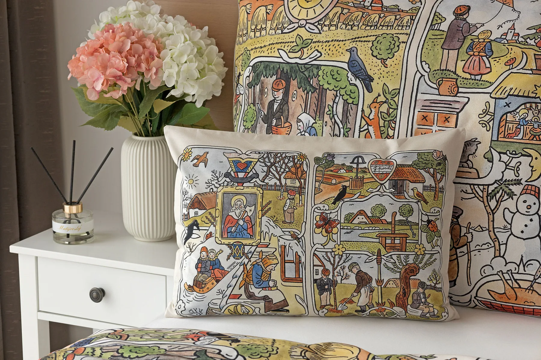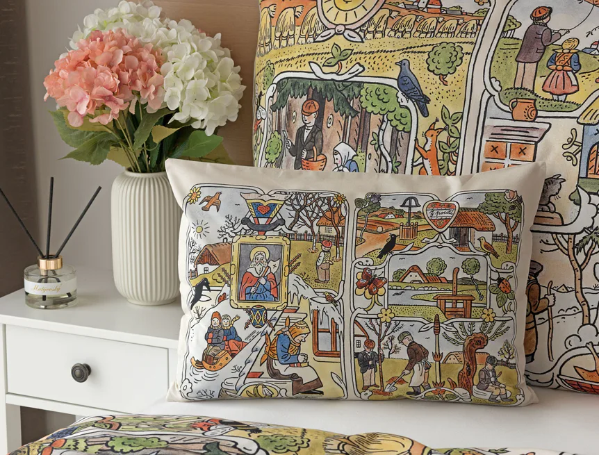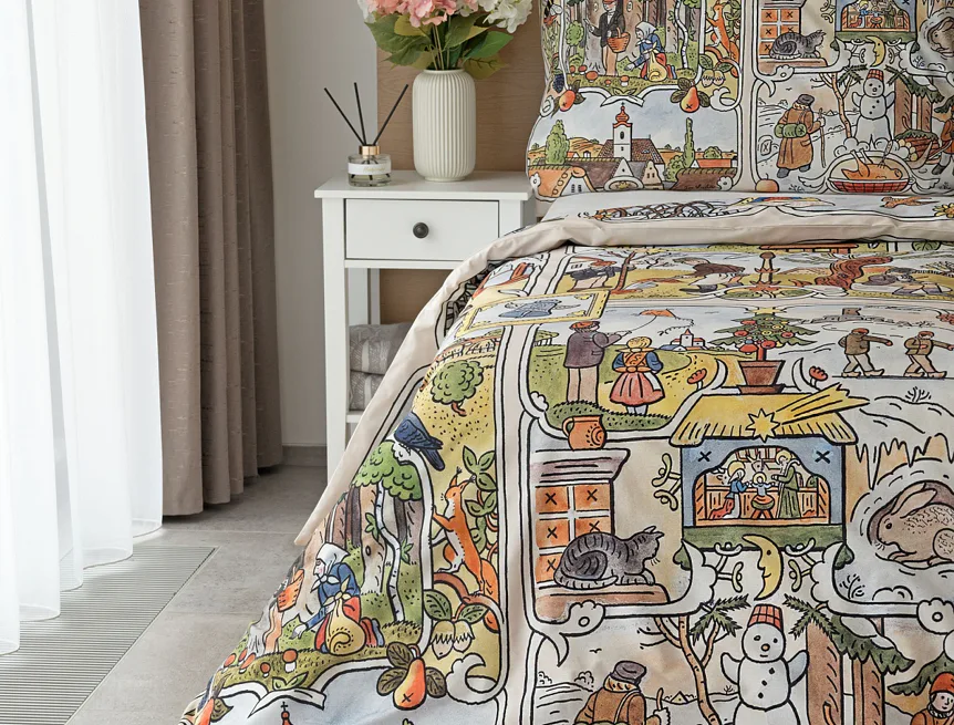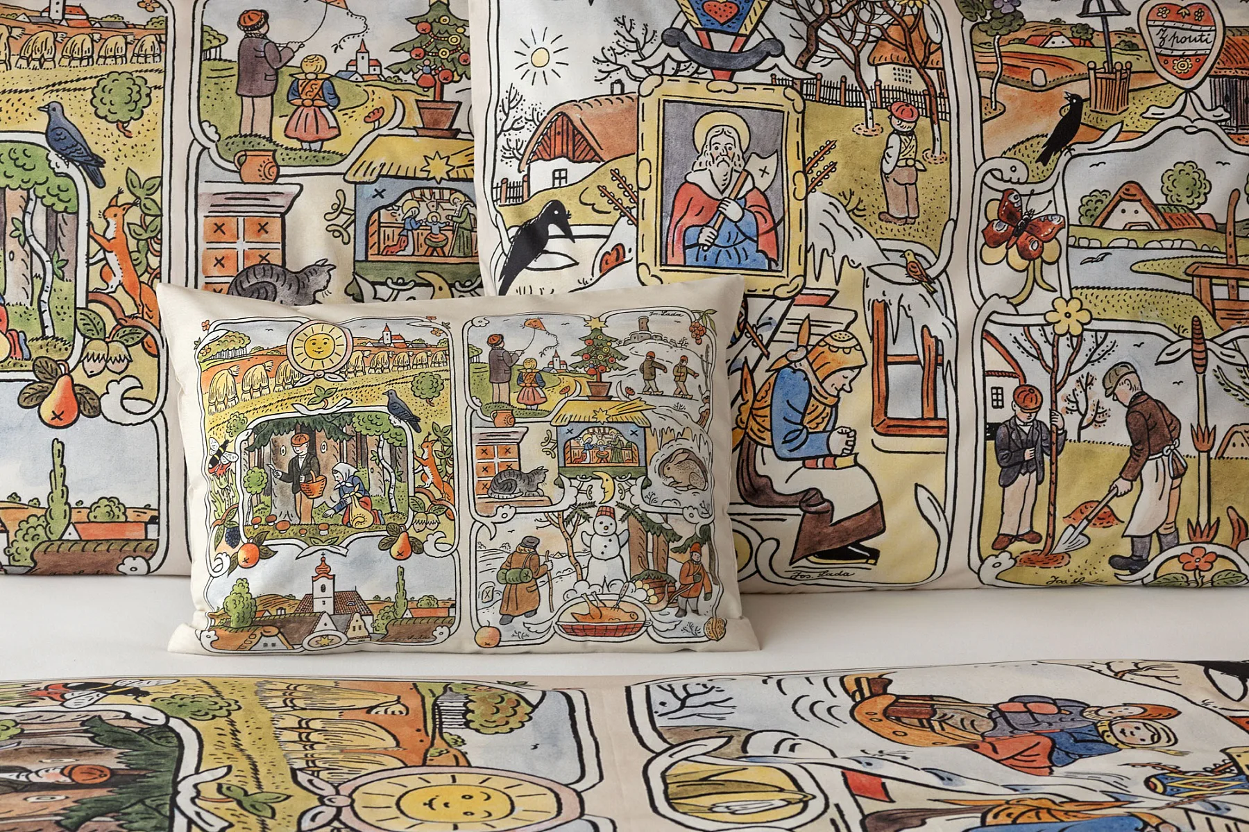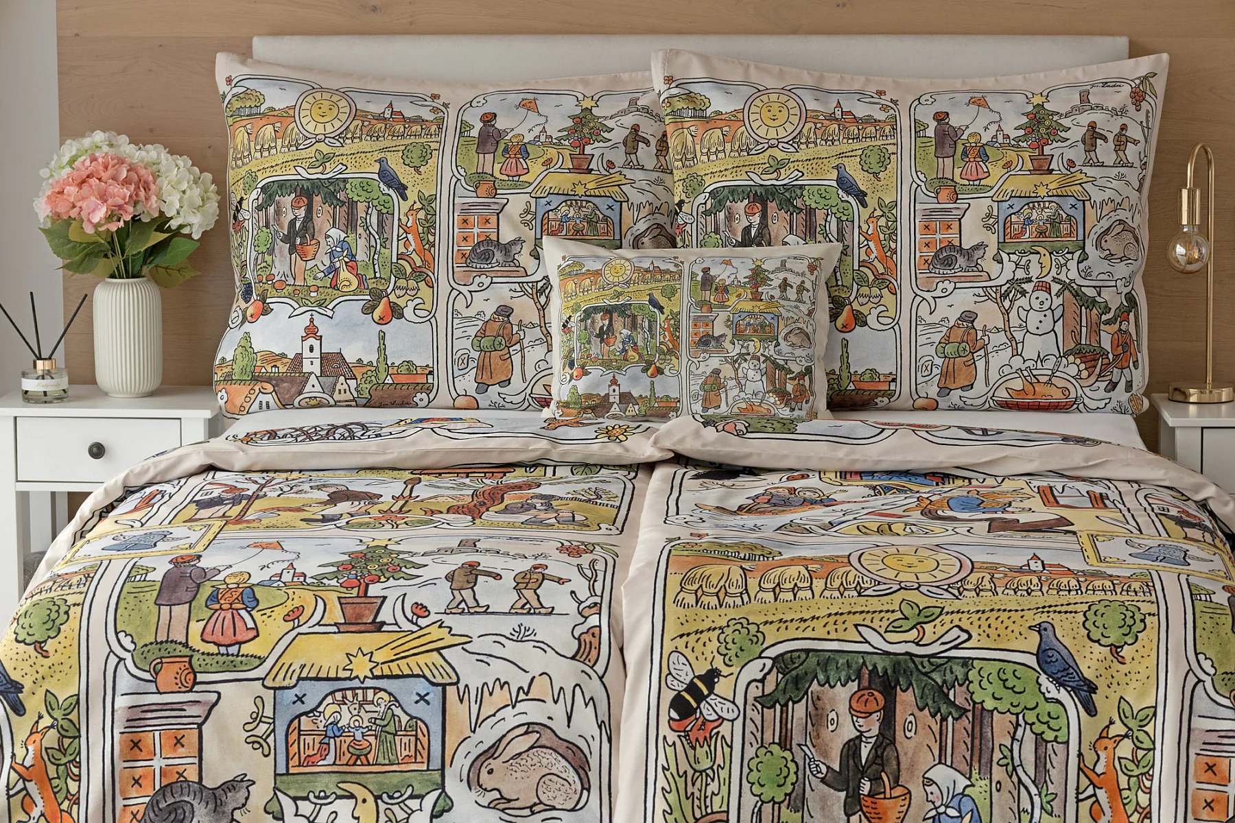 Půvabné kresby Josefa Lady v mnohých z nás probouzejí vzpomínky na bezstarostné dětství. Mají schopnost připomenout vůni rozkvetlé třešně či plápolajícího ohýnku. Zasníme se při pomyšlení na zimy plné sněhu. Vykouzlete si takovou kouzelnou atmosféru i u sebe doma díky bavlněnému povlečení Čtyři roční období. Díky příjemné paletě přírodních tónů a nestárnoucím tradičním motivům bude povlečení ozdobou každé ložnice.