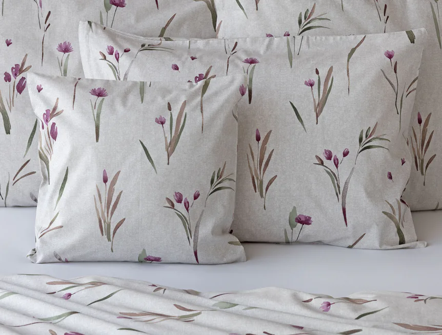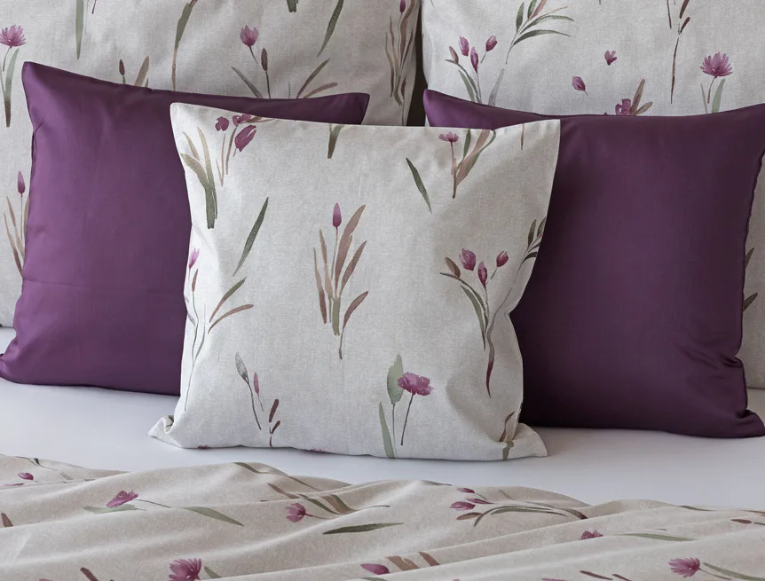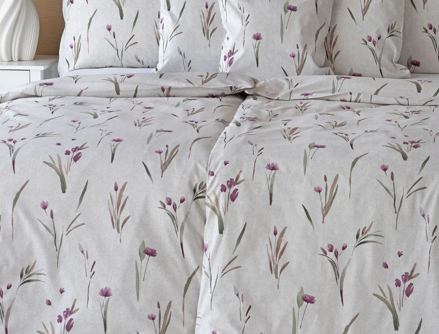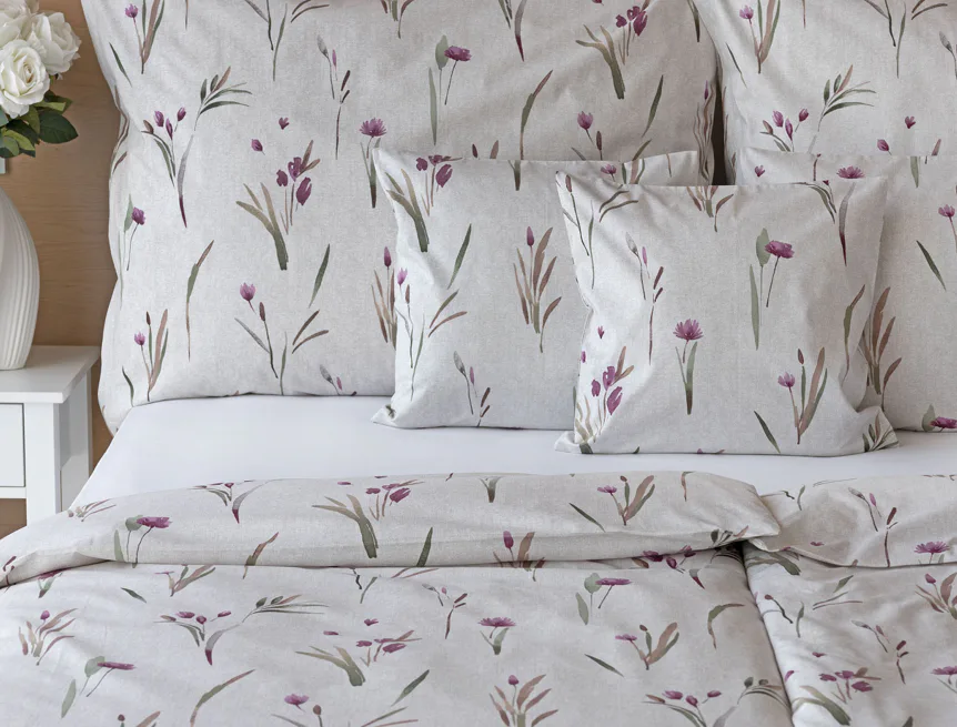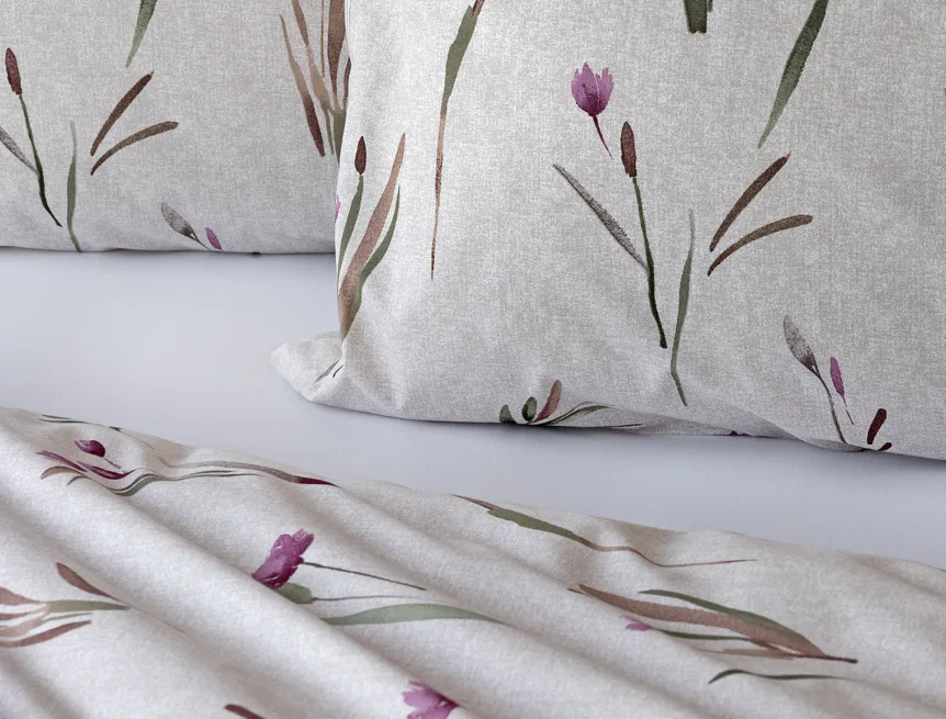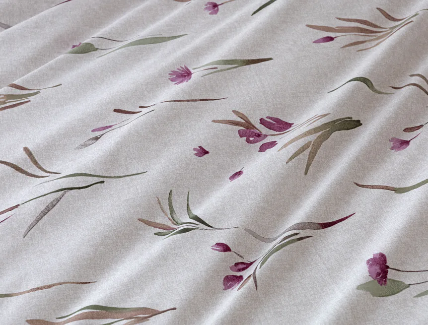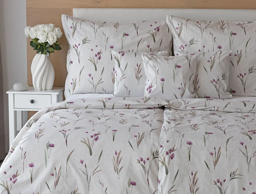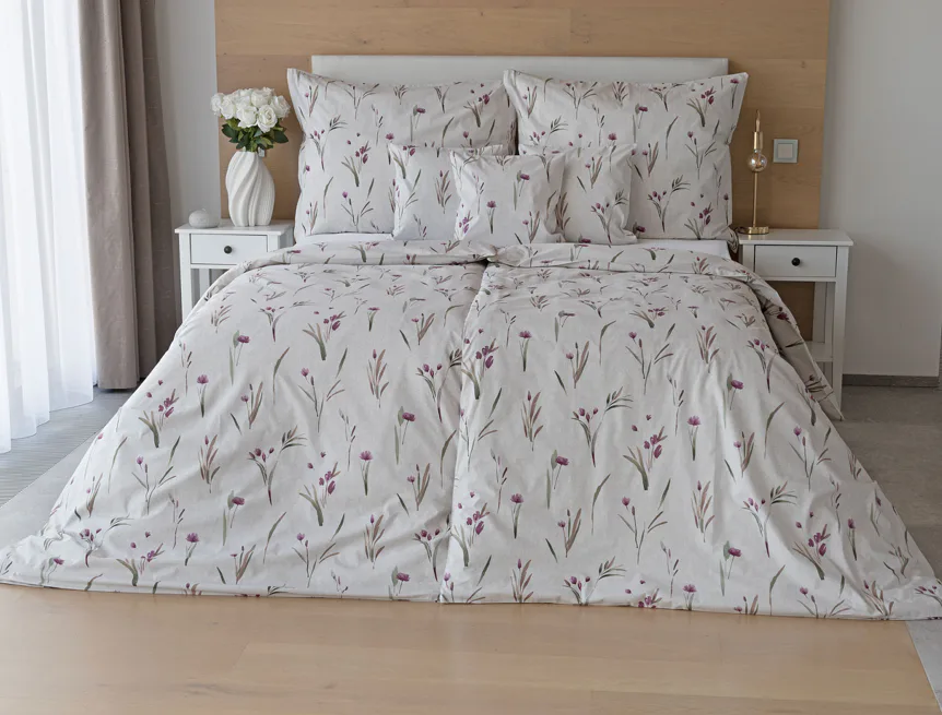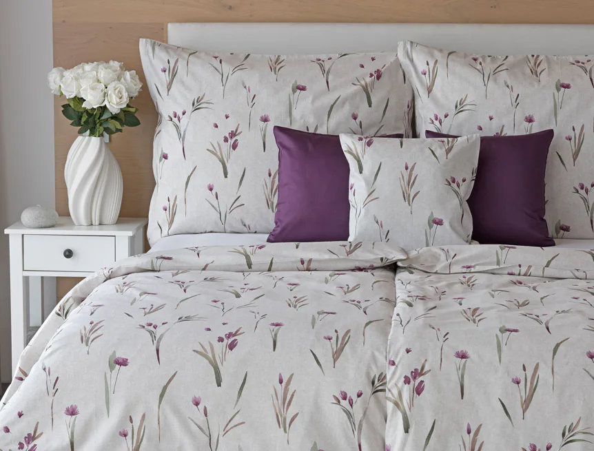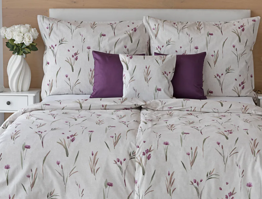 Decentní květinové povlečení Danae vdechne vaší ložnici elegantní nádech v každé roční době. Minimalistický akvarelový motiv květů a poupat v tlumených fialových a zelených tónech vyniká na šedobéžovém podkladu se strukturou jemného melíru.