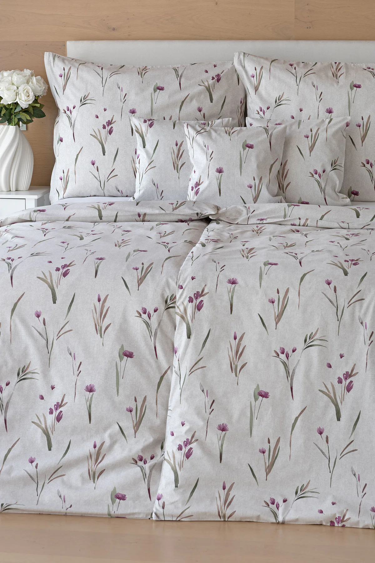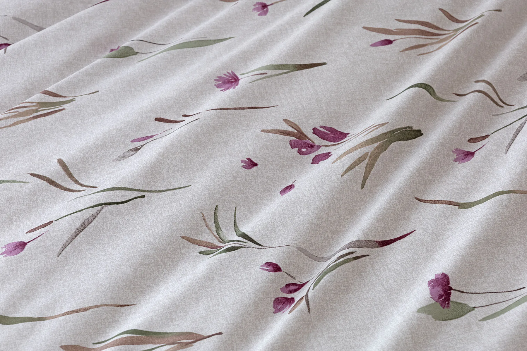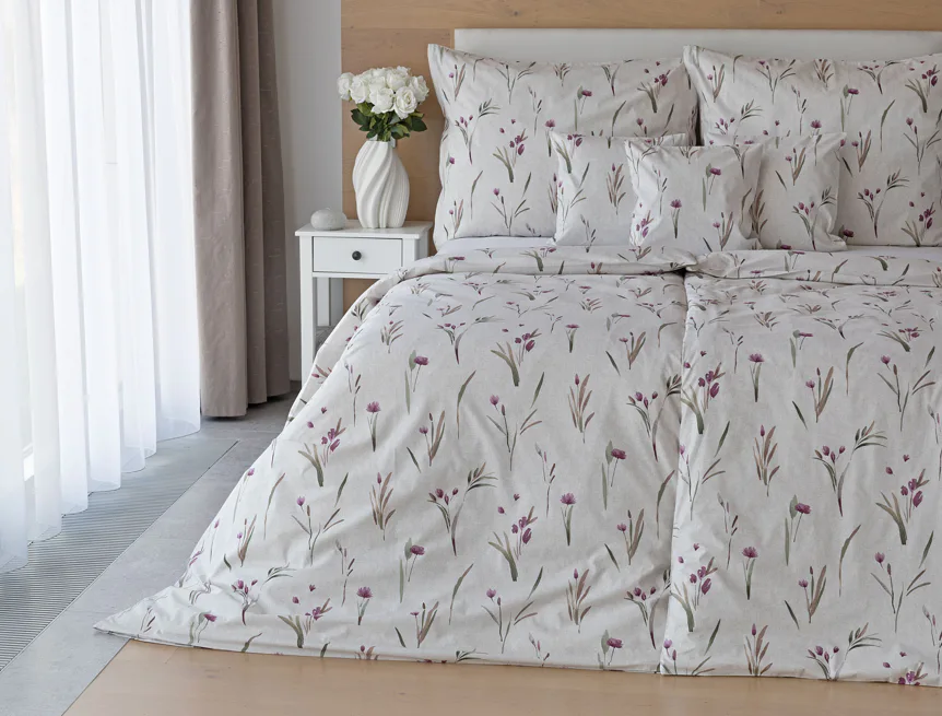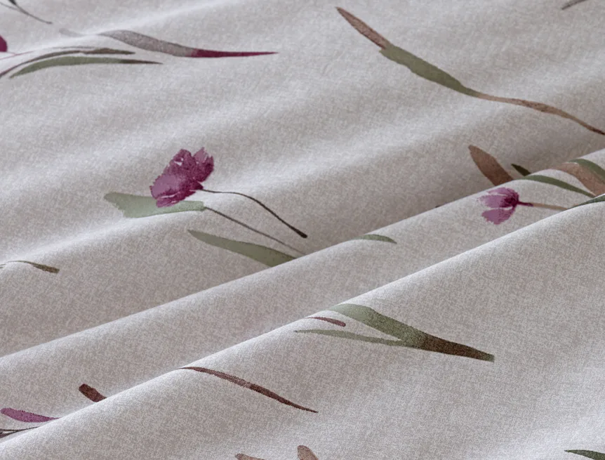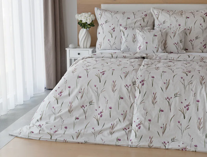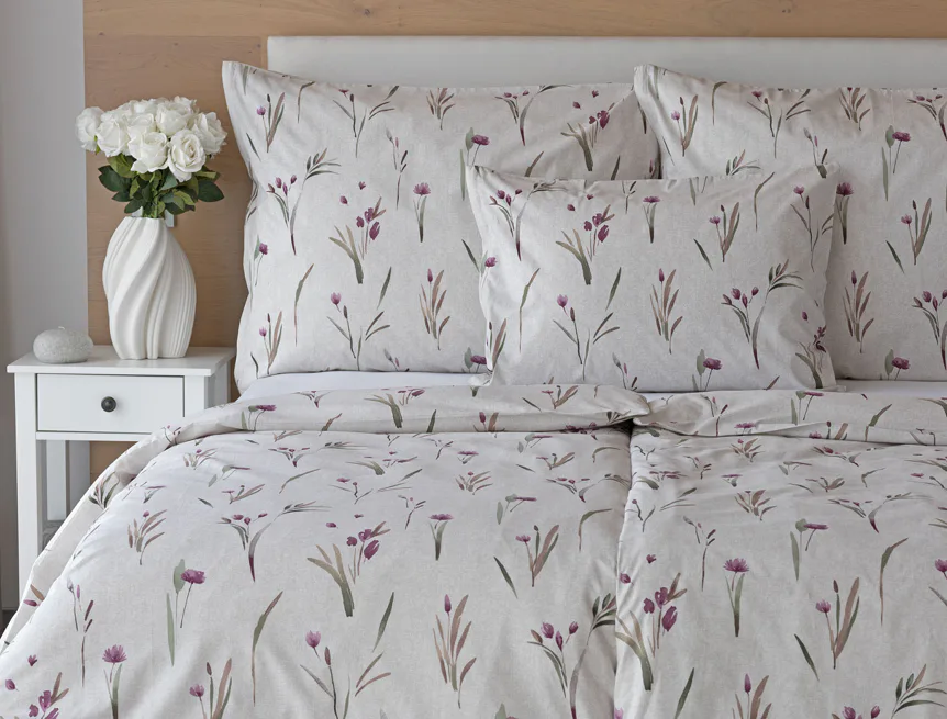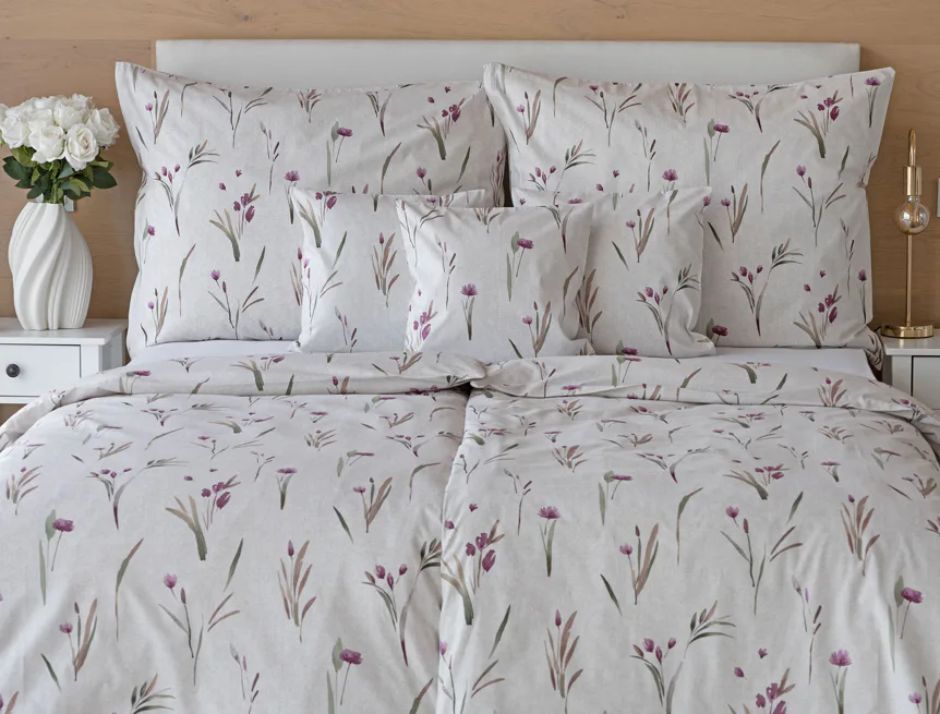 Decentní květinové povlečení Danae vdechne vaší ložnici elegantní nádech v každé roční době. Minimalistický akvarelový motiv květů a poupat v tlumených fialových a zelených tónech vyniká na šedobéžovém podkladu se strukturou jemného melíru.
