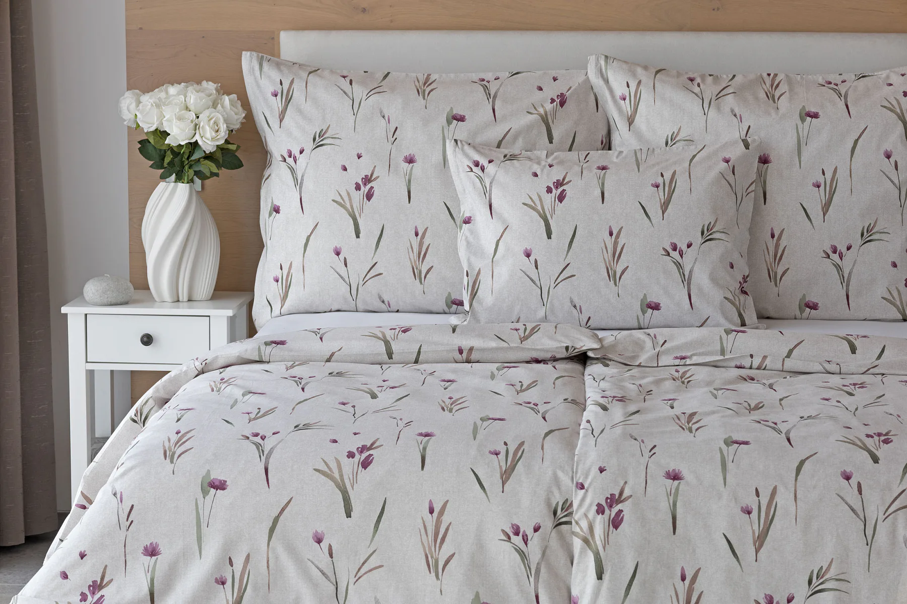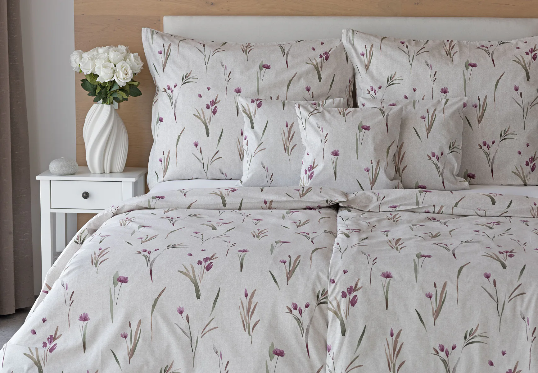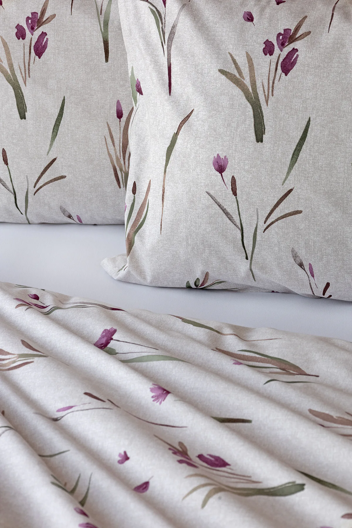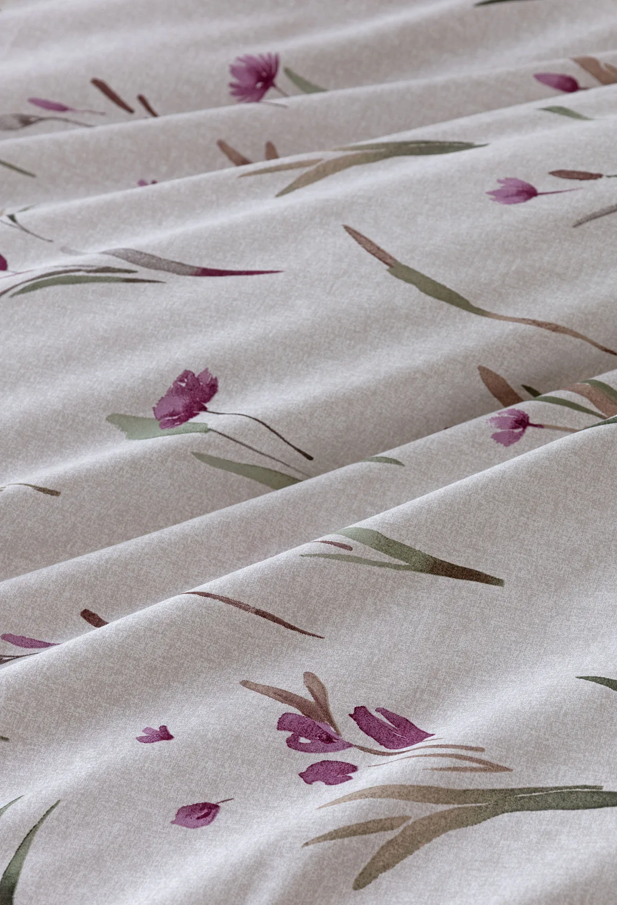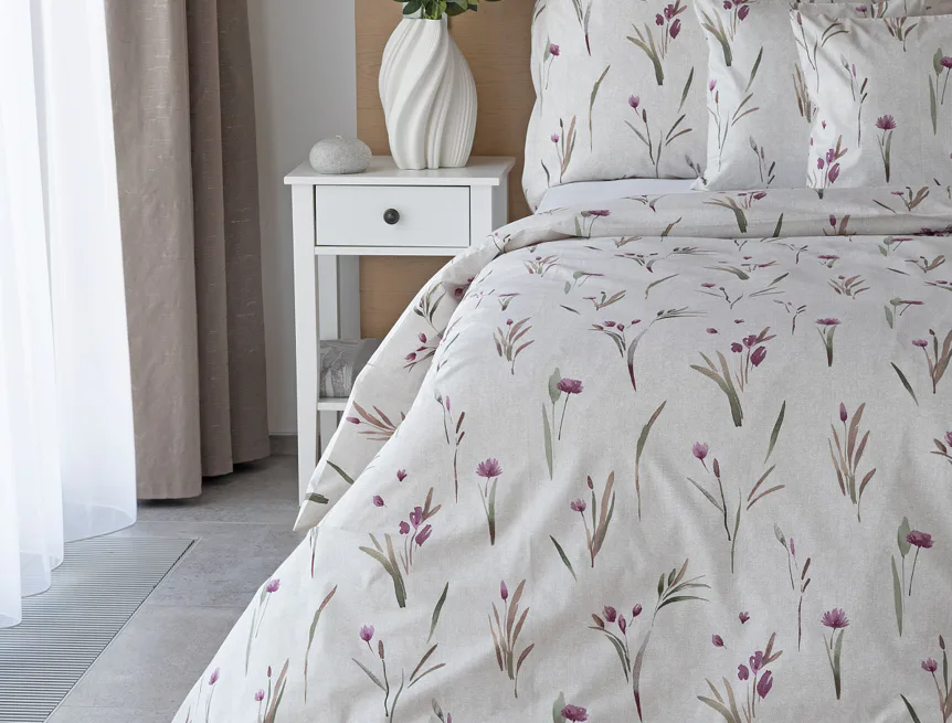 Decentní květinové povlečení Danae vdechne vaší ložnici elegantní nádech v každé roční době. Minimalistický akvarelový motiv květů a poupat v tlumených fialových a zelených tónech vyniká na šedobéžovém podkladu se strukturou jemného melíru.