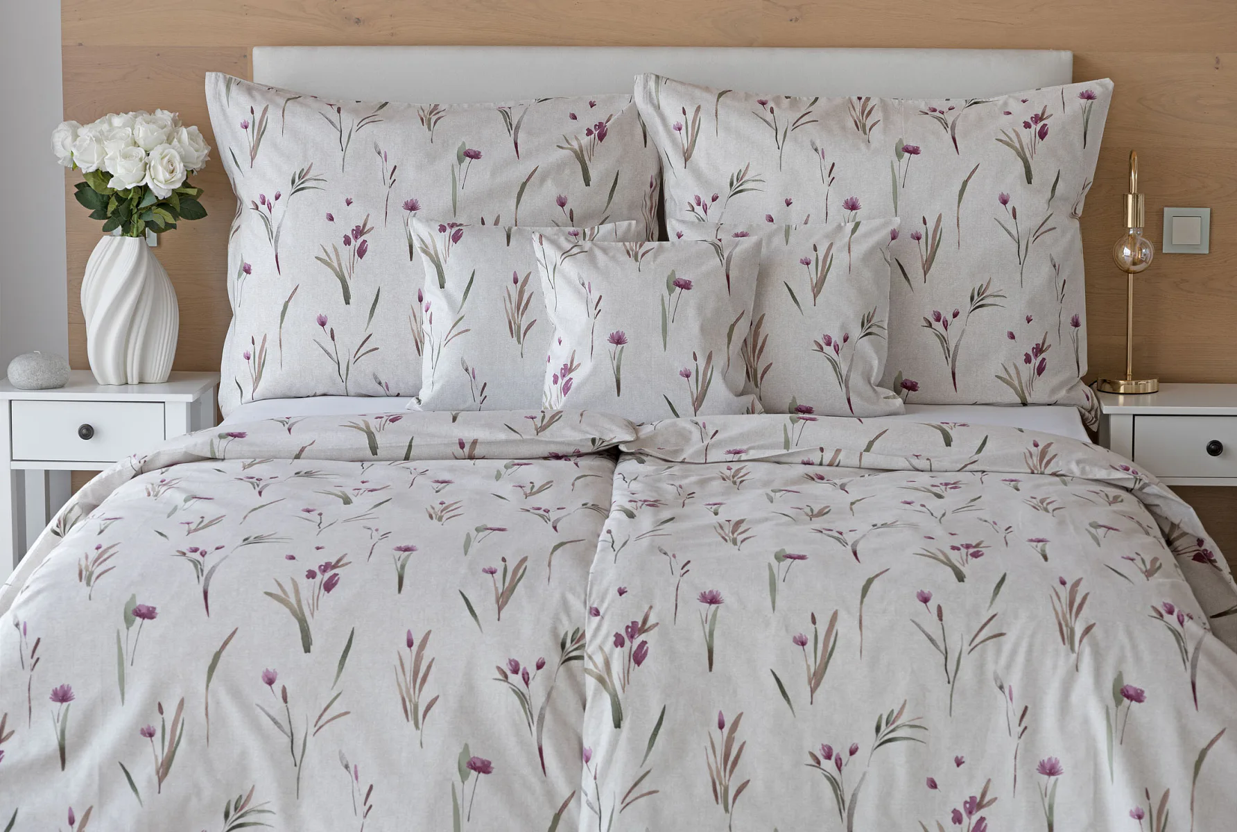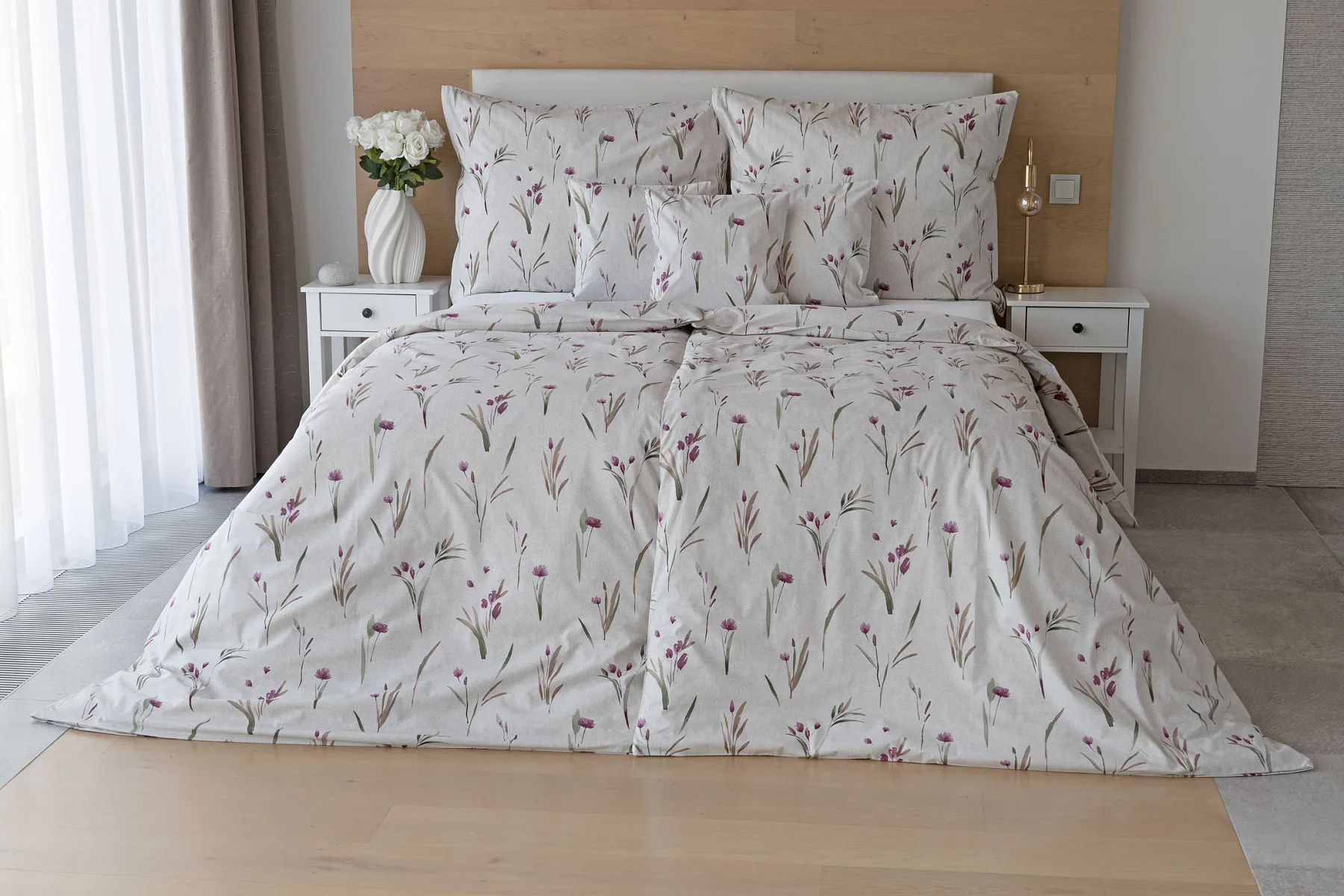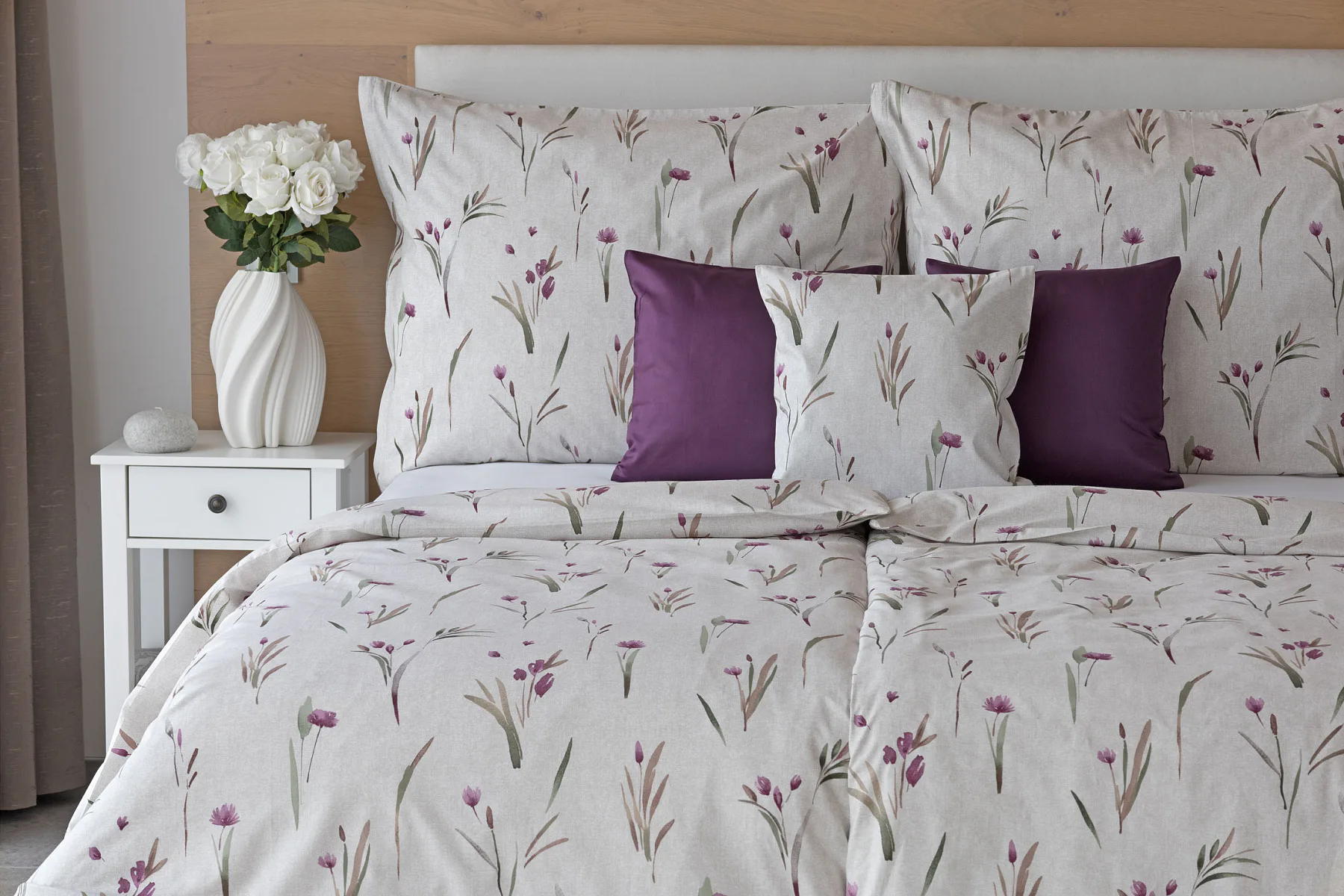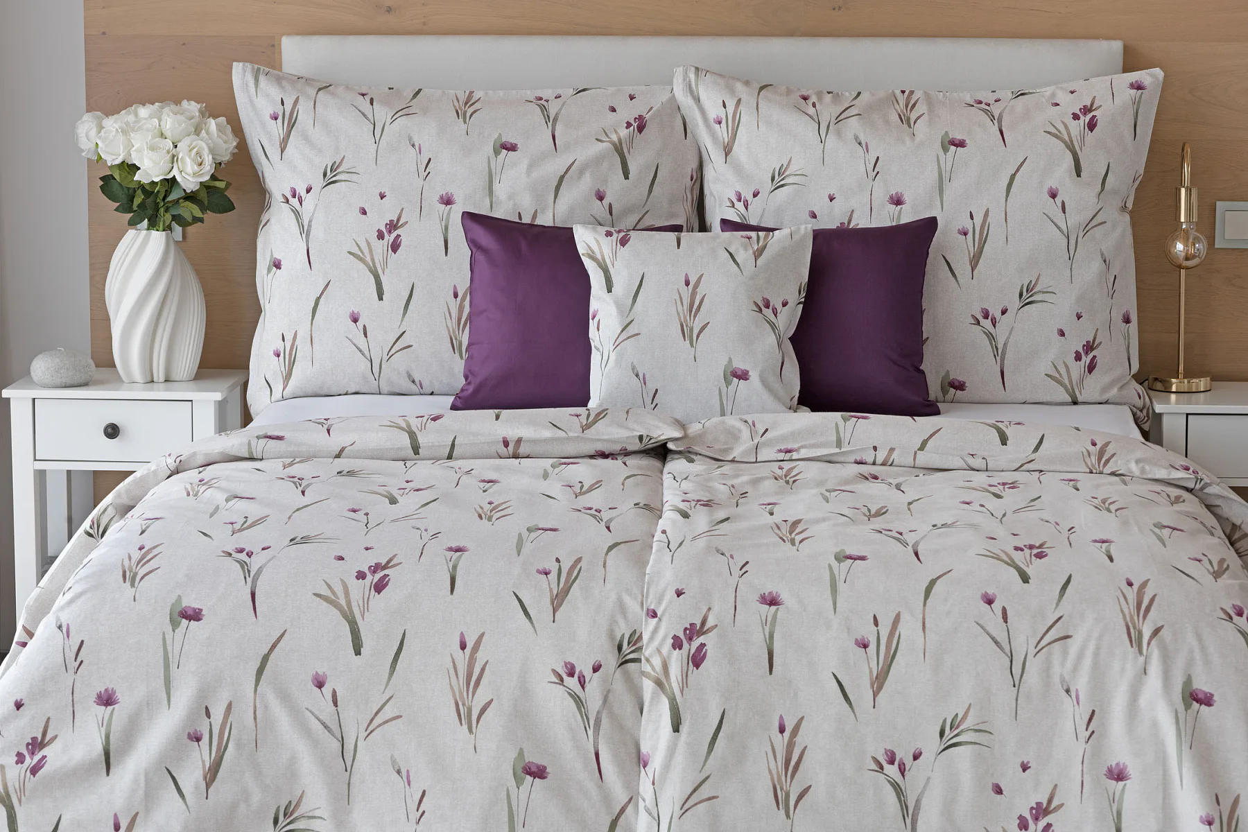 Decentní květinové povlečení Danae vdechne vaší ložnici elegantní nádech v každé roční době. Minimalistický akvarelový motiv květů a poupat v tlumených fialových a zelených tónech vyniká na šedobéžovém podkladu se strukturou jemného melíru.