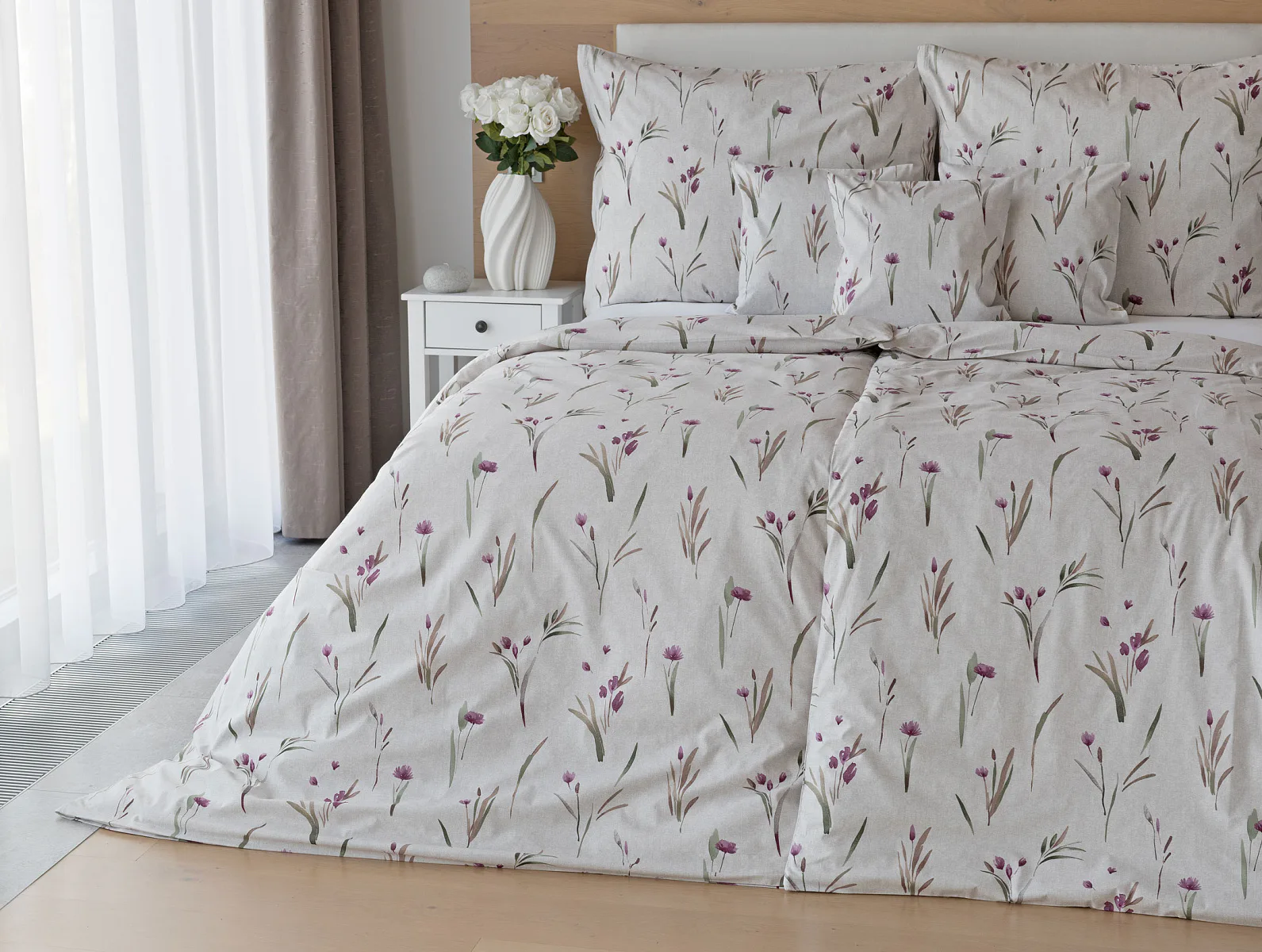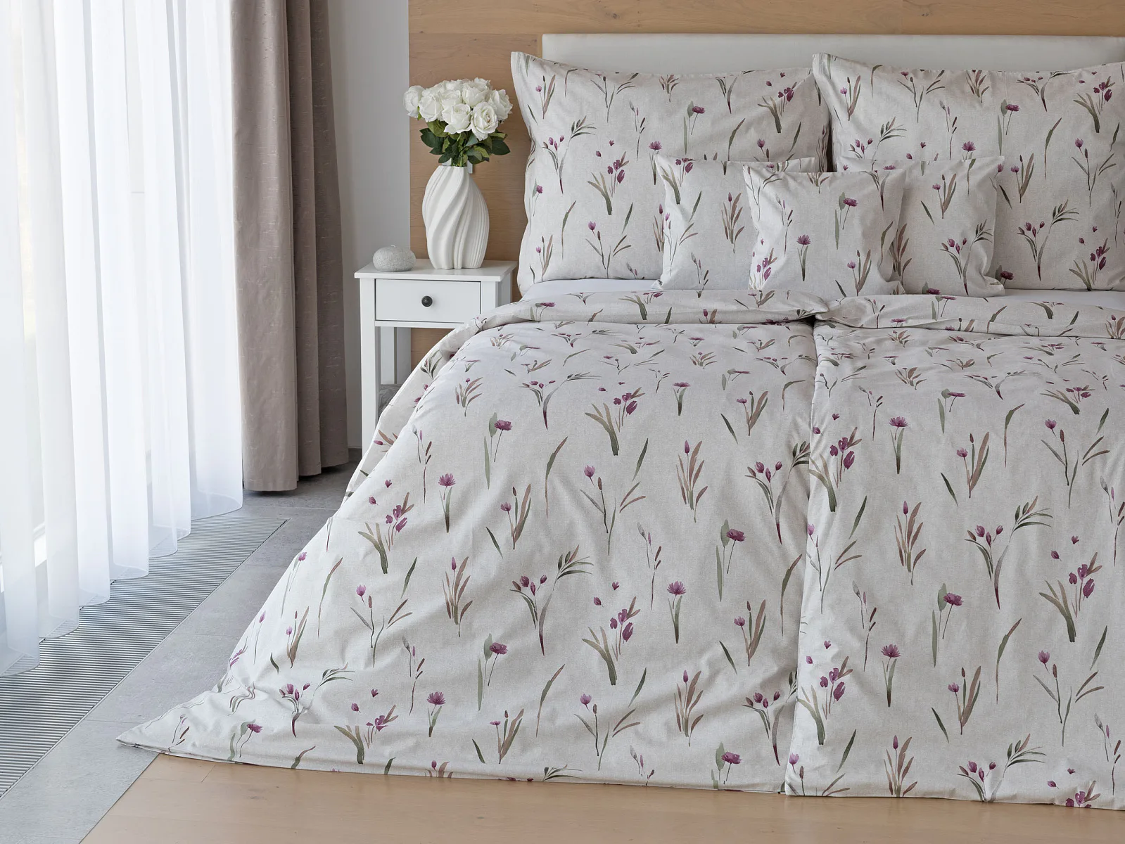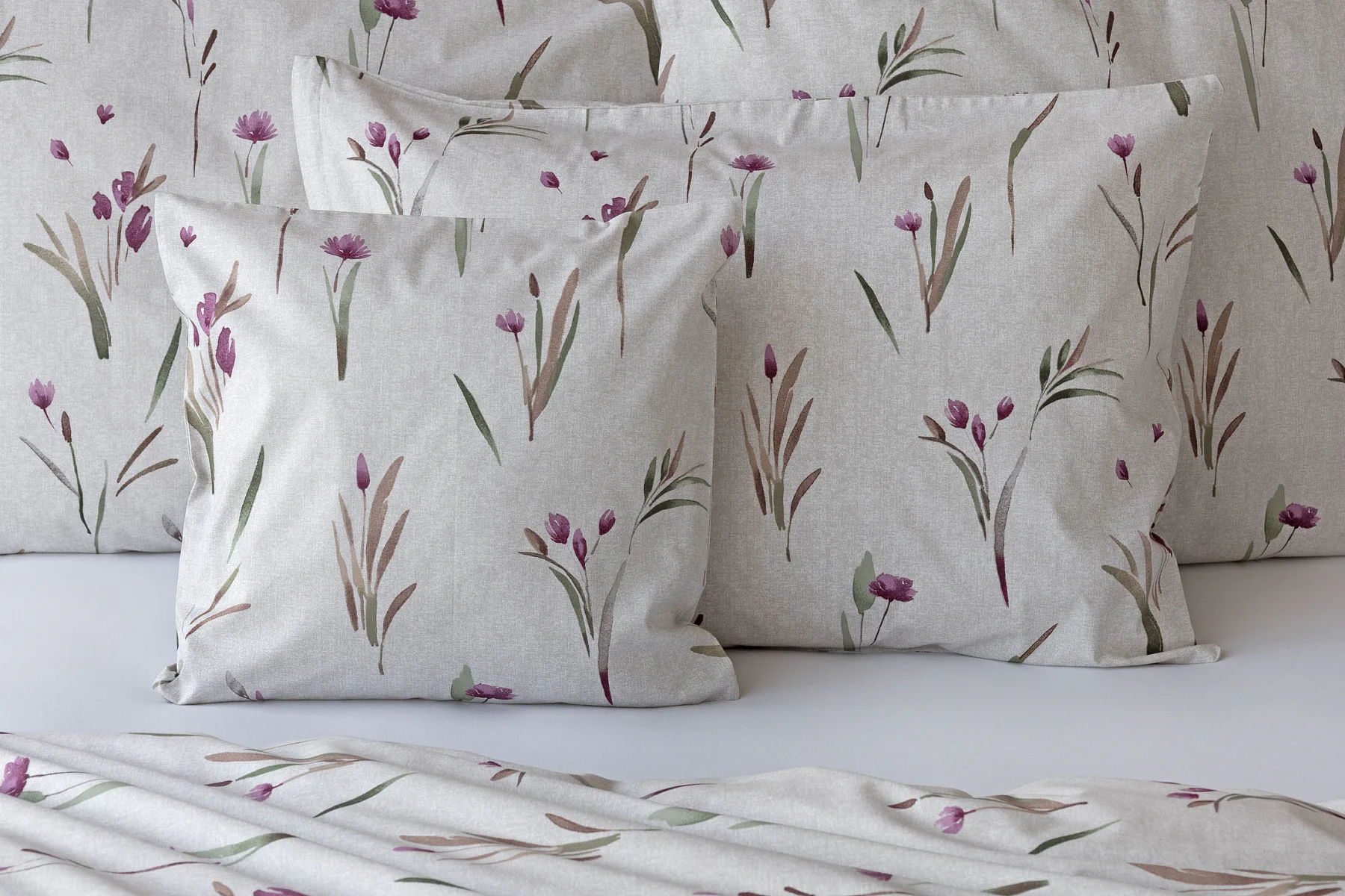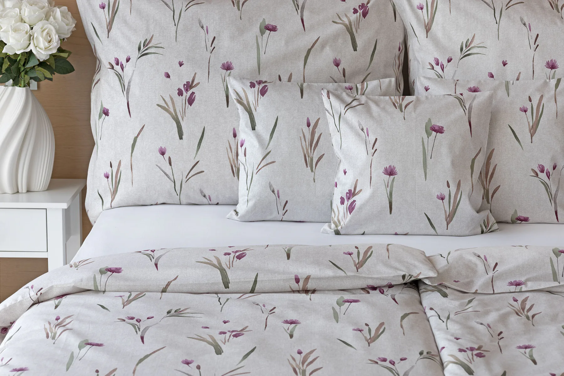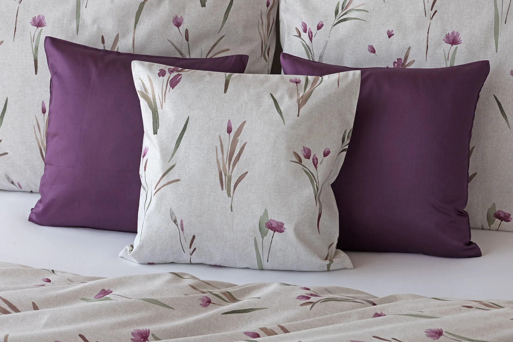 Decentní květinové povlečení Danae vdechne vaší ložnici elegantní nádech v každé roční době. Minimalistický akvarelový motiv květů a poupat v tlumených fialových a zelených tónech vyniká na šedobéžovém podkladu se strukturou jemného melíru.