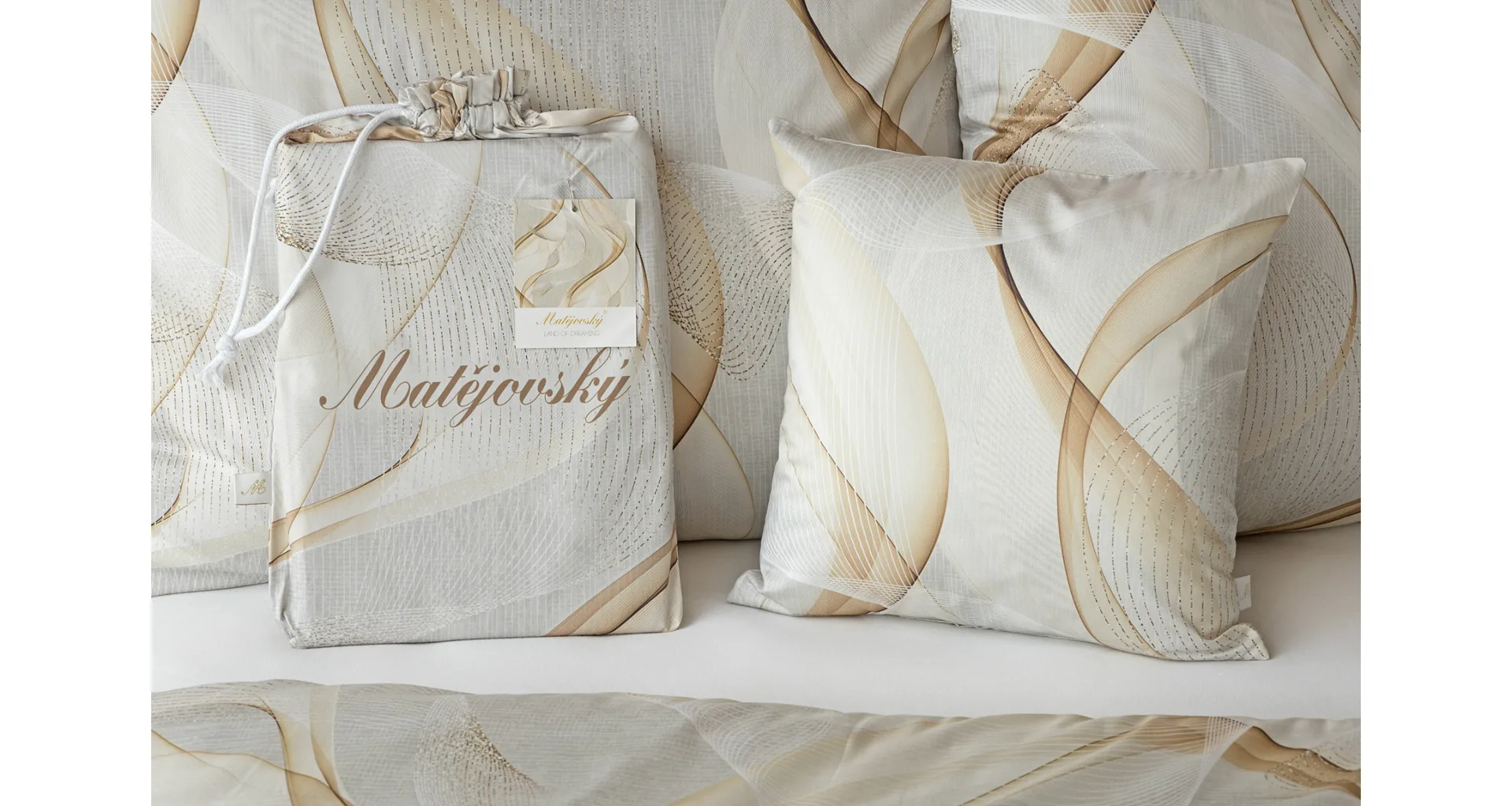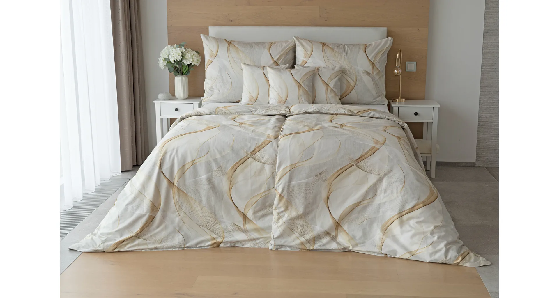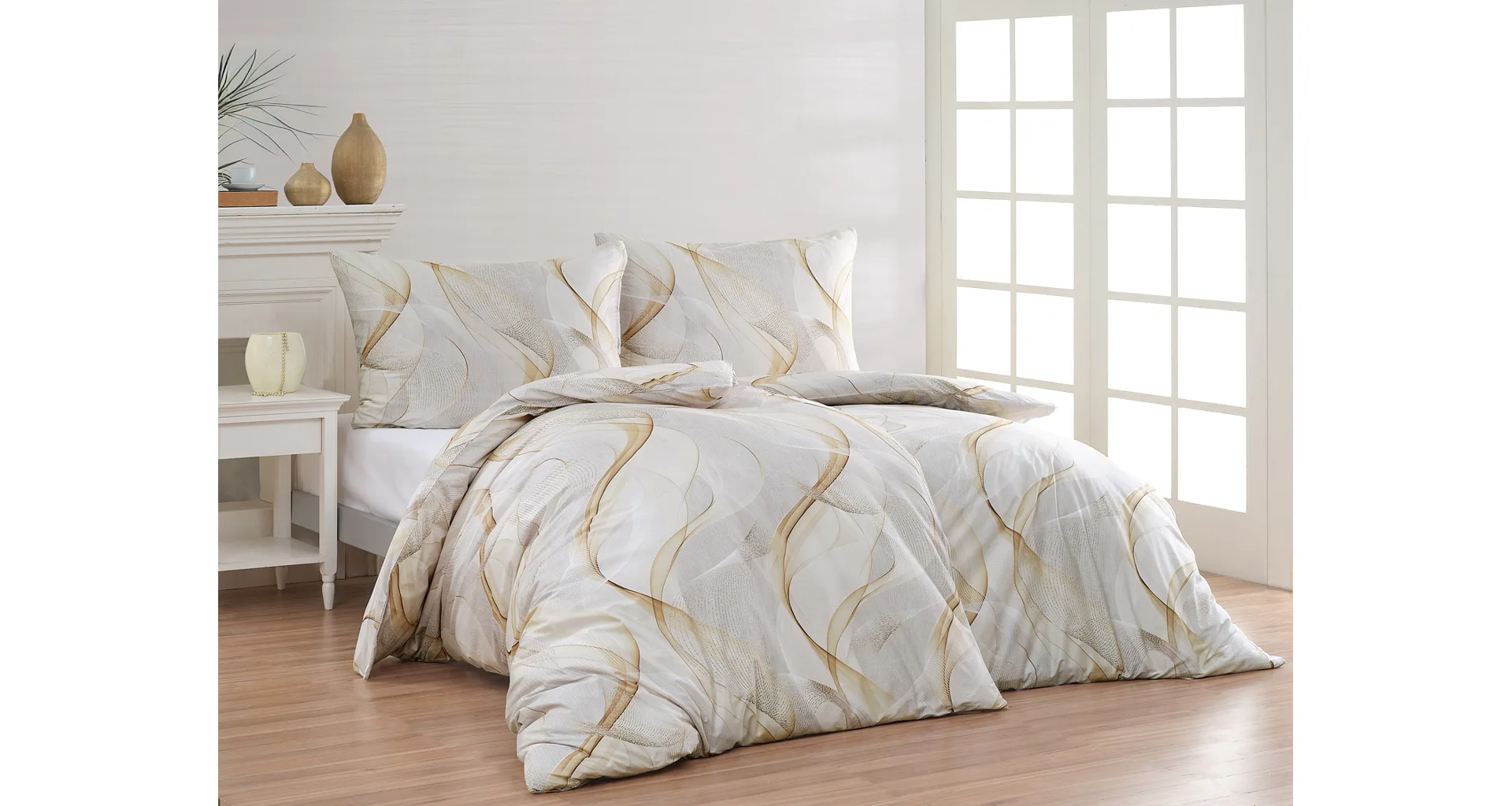 Povlečení Delight zdobí jemný geometrický vzor v podobě bílých a zlatavých nepravidelných vlnek na světle šedém podkladu. Povlak na polštář i na přikrývku je z obou stran stejný, povlečení je opatřeno komfortním zipovým uzávěrem.