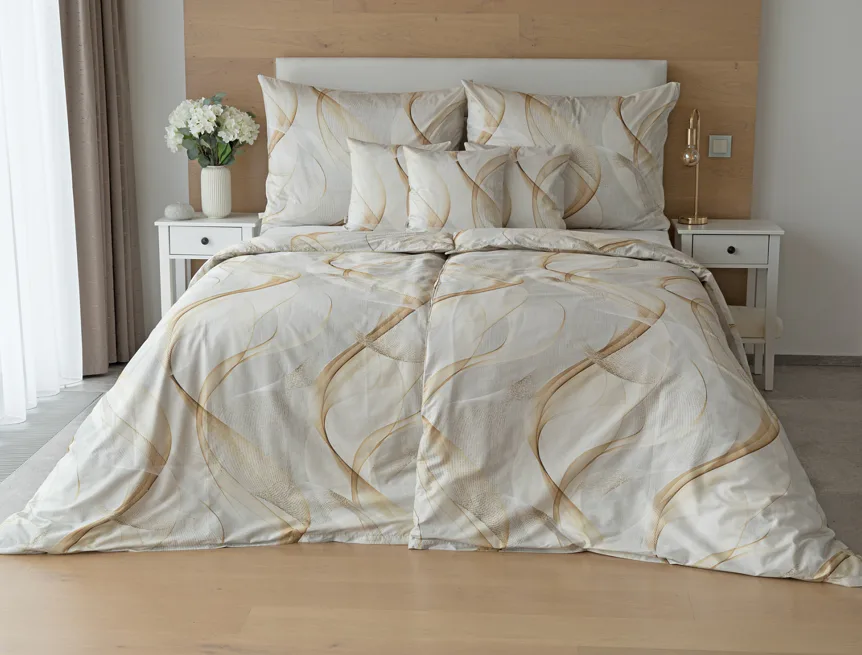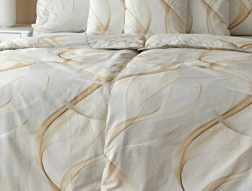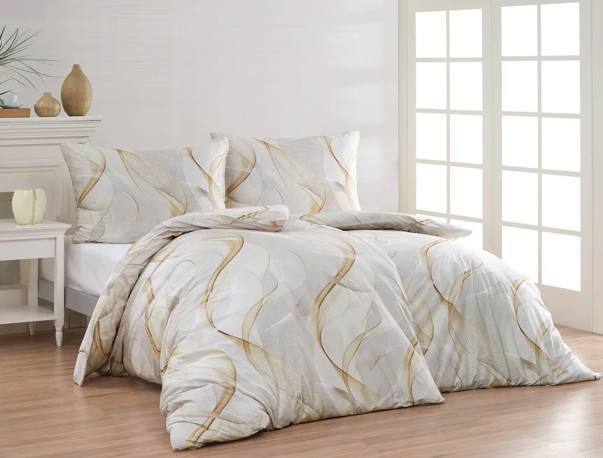 Povlečení Delight zdobí jemný geometrický vzor v podobě bílých a zlatavých nepravidelných vlnek na světle šedém podkladu. Povlak na polštář i na přikrývku je z obou stran stejný, povlečení je opatřeno komfortním zipovým uzávěrem.