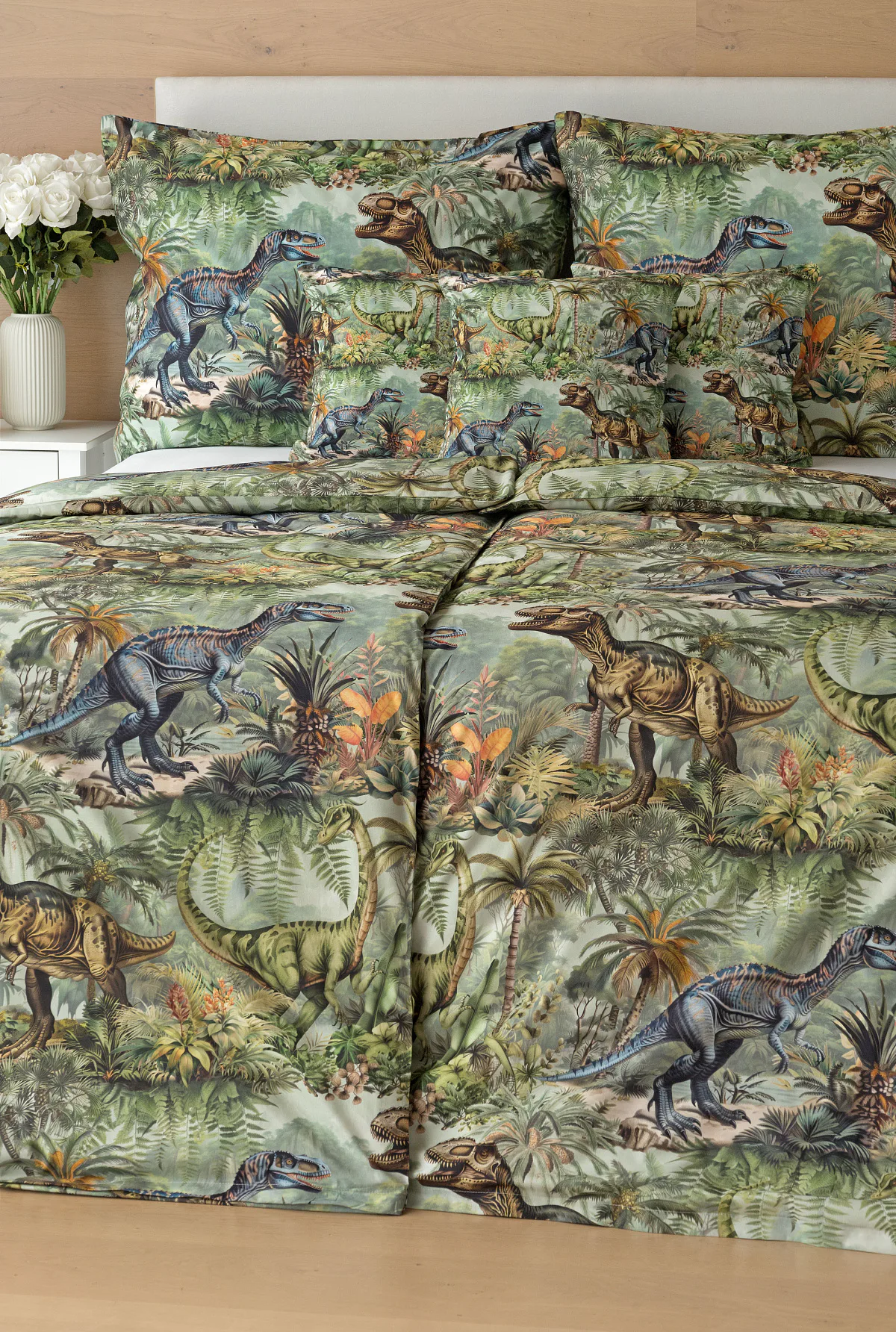 Bavlněné povlečení Dino potěší všechny malé i větší milovníky jurského období. Propracované barevné ilustrace oblíbených prehistorických tvorů promění každou postel v dobrodružnou džungli, kde čekají obří dinosauři, tyranosauři a brontosauři. Prvotřídní bavlna zajistí klidný spánek dětí a díky nejmodernější digitální technologii tisku si barvy zachovají svou sytost i po mnoha praních.