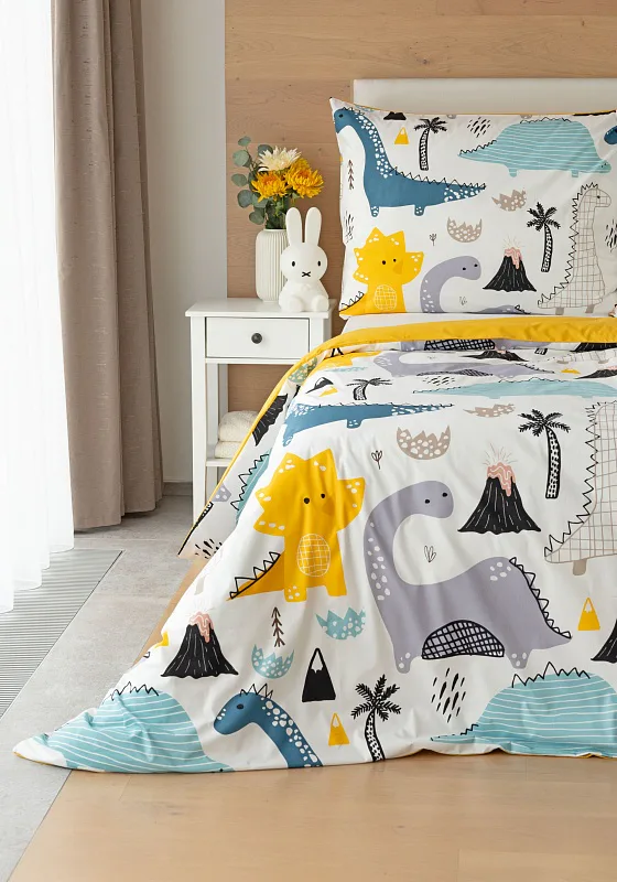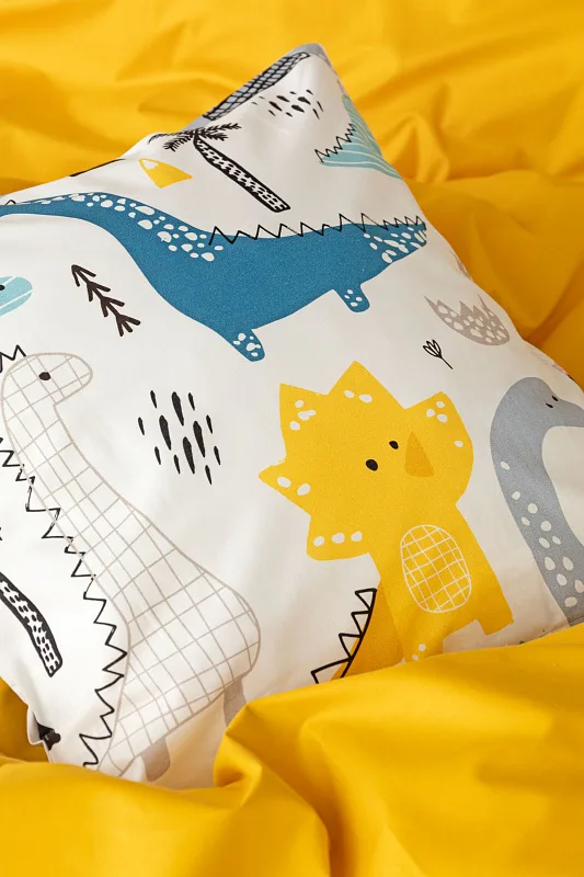 Hravý dětský vzor povlečení Dinosauři probudí fantazii každého malého dobrodruha. Nápaditá kombinace barev se hodí do chlapeckého i dívčího pokojíčku. Rodiče ocení vysoce kvalitní materiál ze 100% bavlny.