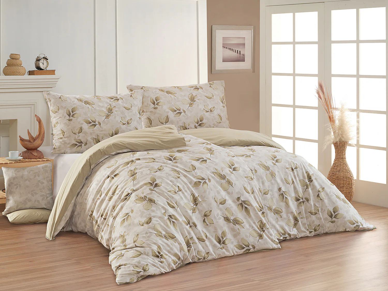 Vrchní stranu povlečení zdobí přírodní florální vzor, spodní strana je tvořena jemným proužkem v kombinaci světlé a tmavší olivové barvy. Vzor je z každé strany jiný u povlaku na přikrývku i na polštář, vrchní stranu povlaku na polštář zdobí malé logo "M" v pravém dolním rohu. Povlečení je opatřeno komfortním zipovým uzávěrem
