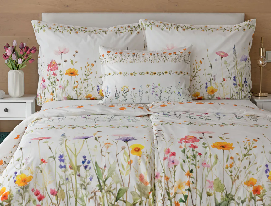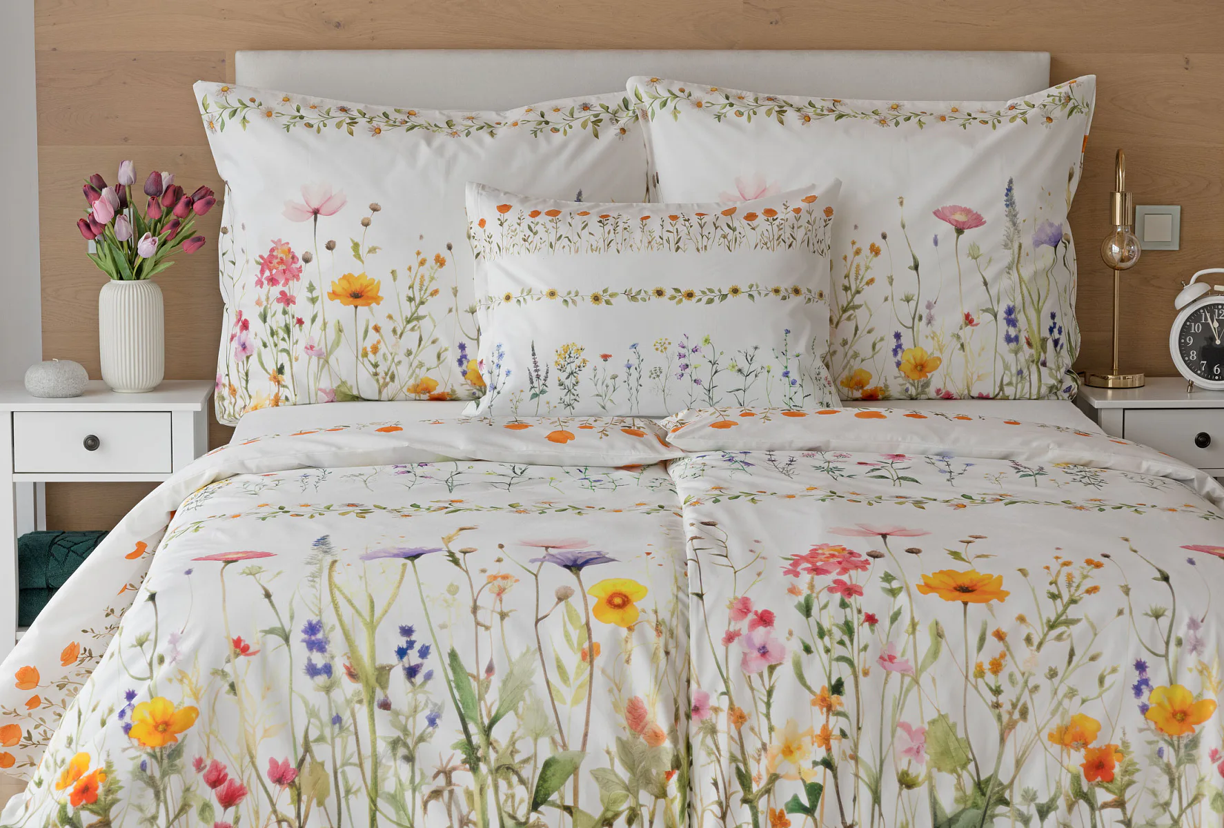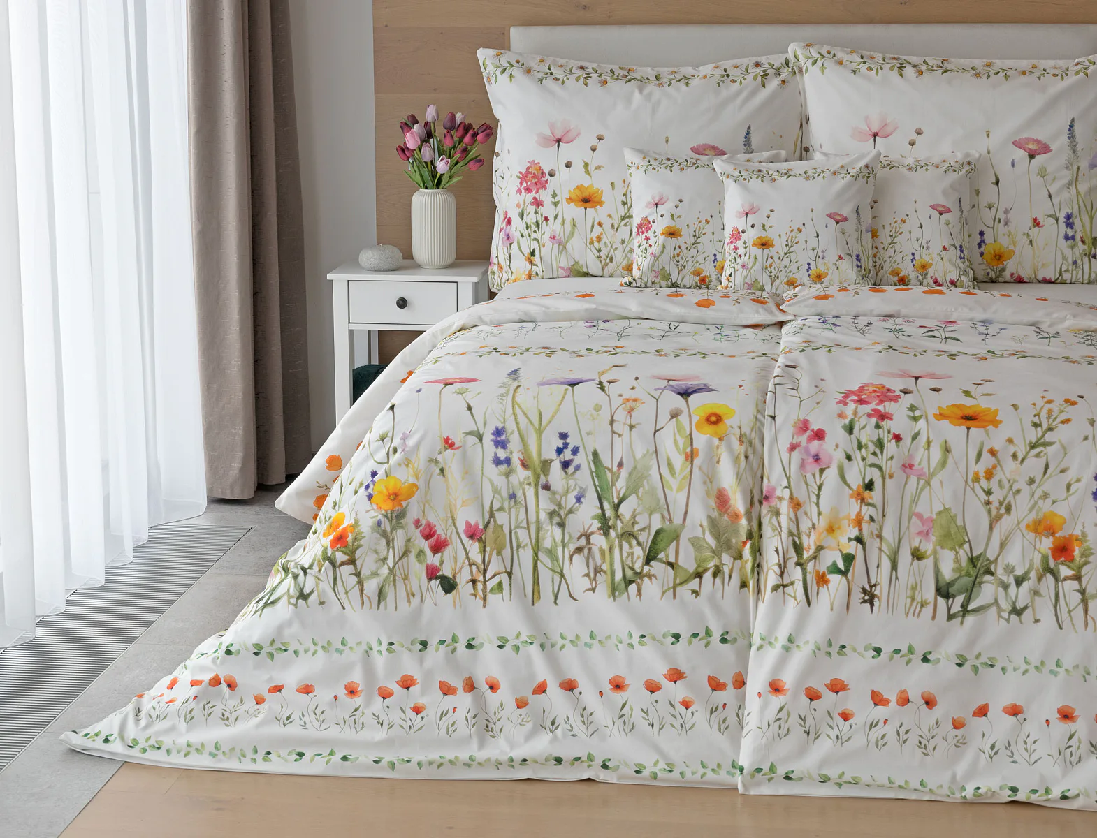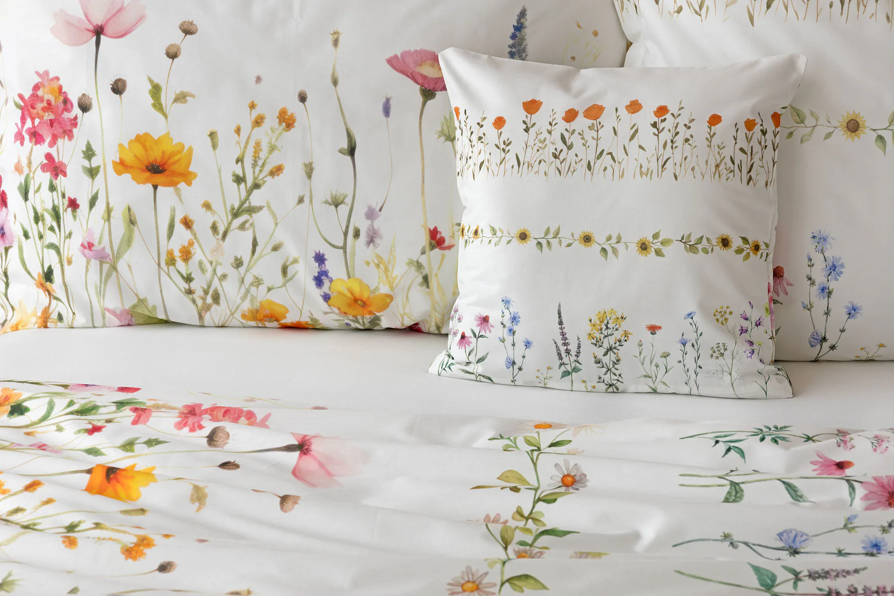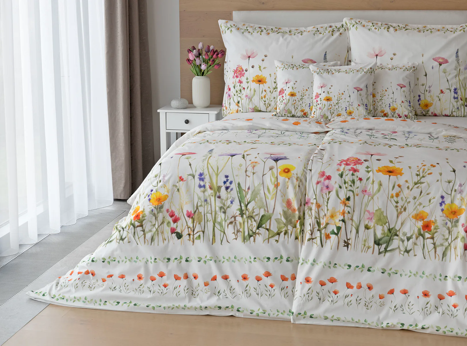 Proměňte svou ložnici v jarní oázu svěžesti s bavlněným povlečením Doris. Romantický motiv lučního kvítí vnese do interiéru lehkost a svěží vůni jara. Barevné květy v pastelových odstínech na bílém podkladu působí hravě a zároveň velmi elegantně. Povlečení Doris je ideální volbou pro milovníky jemných a neokázalých bytových doplňků.