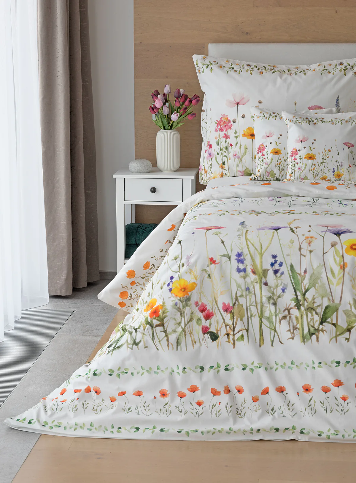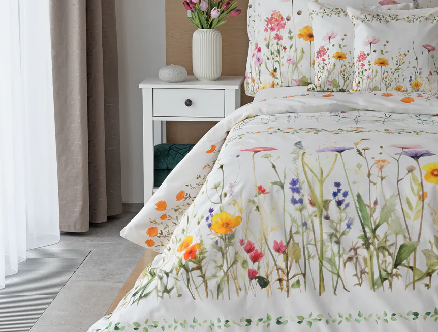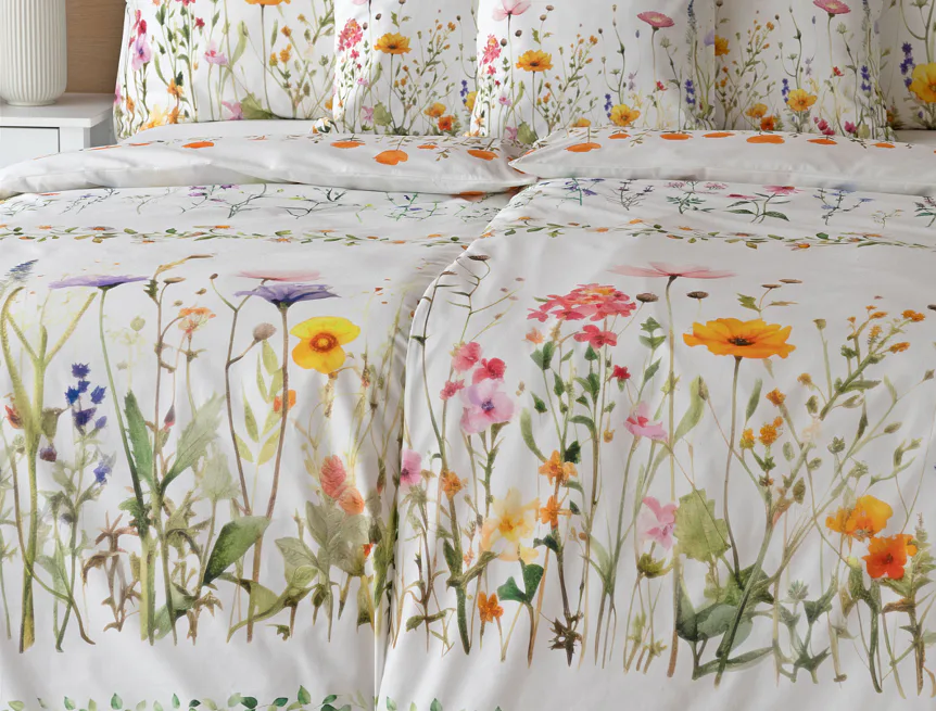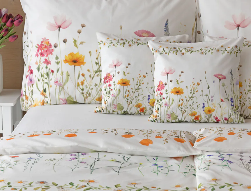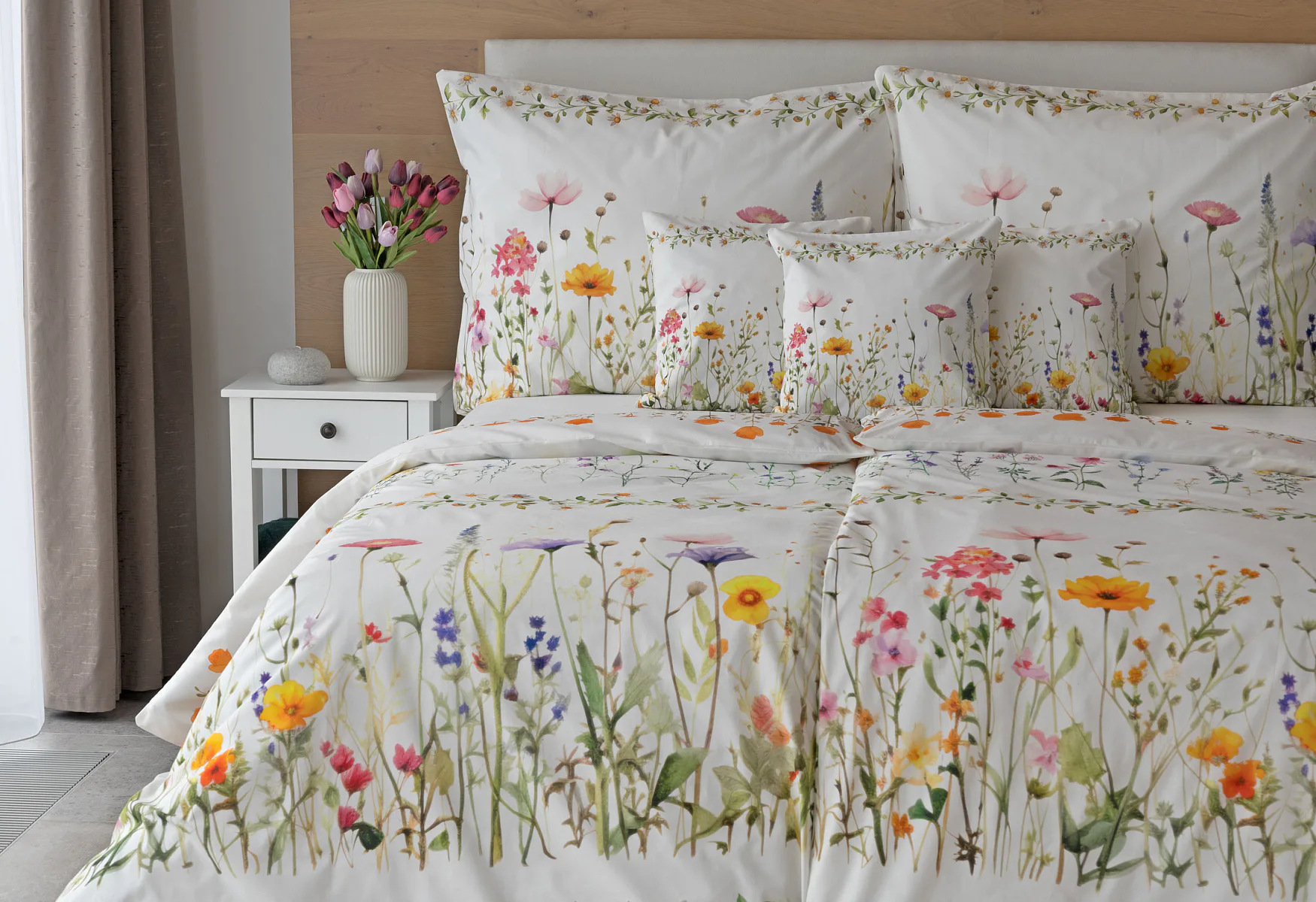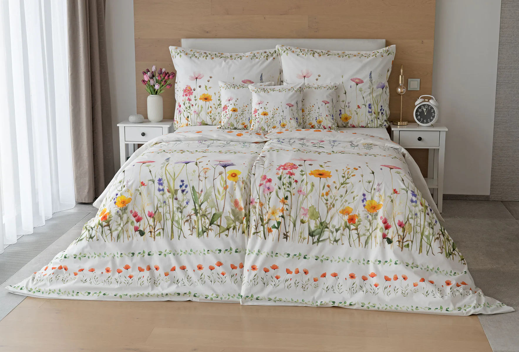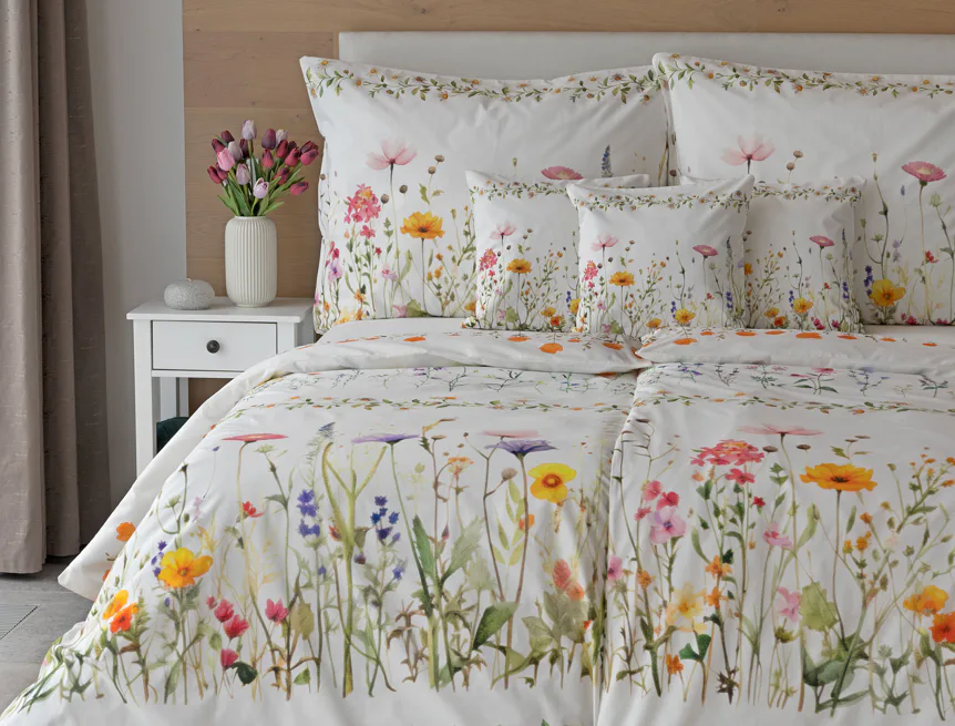 Proměňte svou ložnici v jarní oázu svěžesti s bavlněným povlečením Doris. Romantický motiv lučního kvítí vnese do interiéru lehkost a svěží vůni jara. Barevné květy v pastelových odstínech na bílém podkladu působí hravě a zároveň velmi elegantně. Povlečení Doris je ideální volbou pro milovníky jemných a neokázalých bytových doplňků.