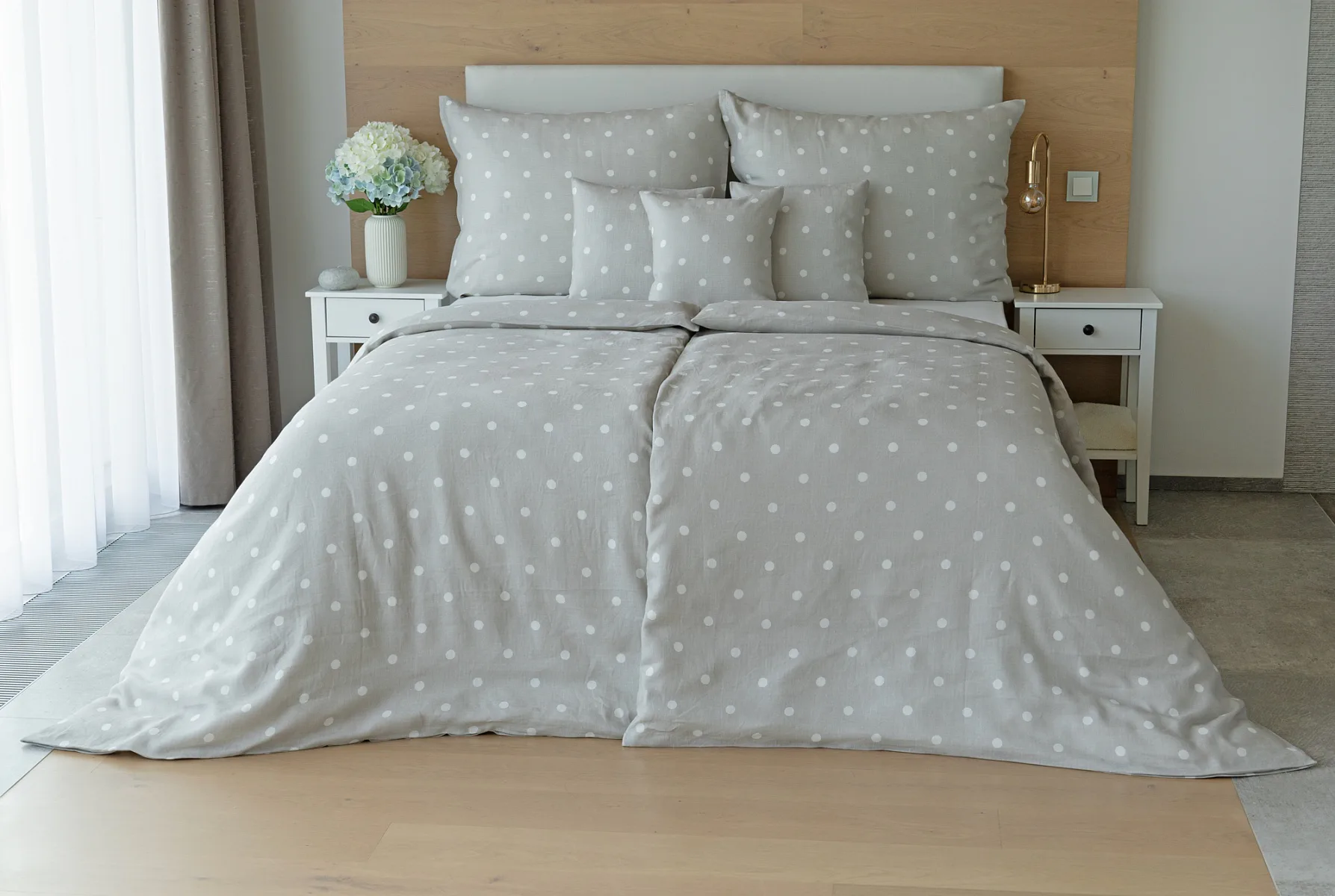 Objevte benefity jedinečného přírodního materiálu a dopřejte si nezaměnitelný komfort s naším lněným povlečením Dotté. Vzor s jemnými puntíky je jako stvořený pro tento ekologicky šetrný materiál a doladí k dokonalosti každý interiér s rustikálním nádechem. Podklad ložního povlečení není jednobarevný! Tvoří ho drobné malé tečky, které ladí vzor Dotté do přírodního šedého tónu.