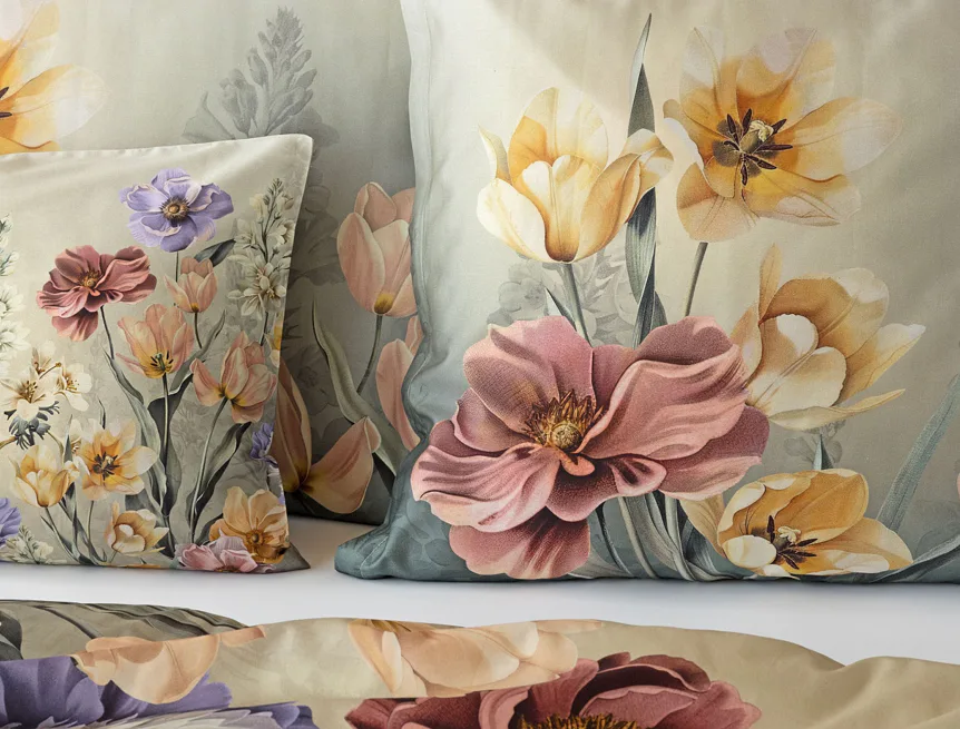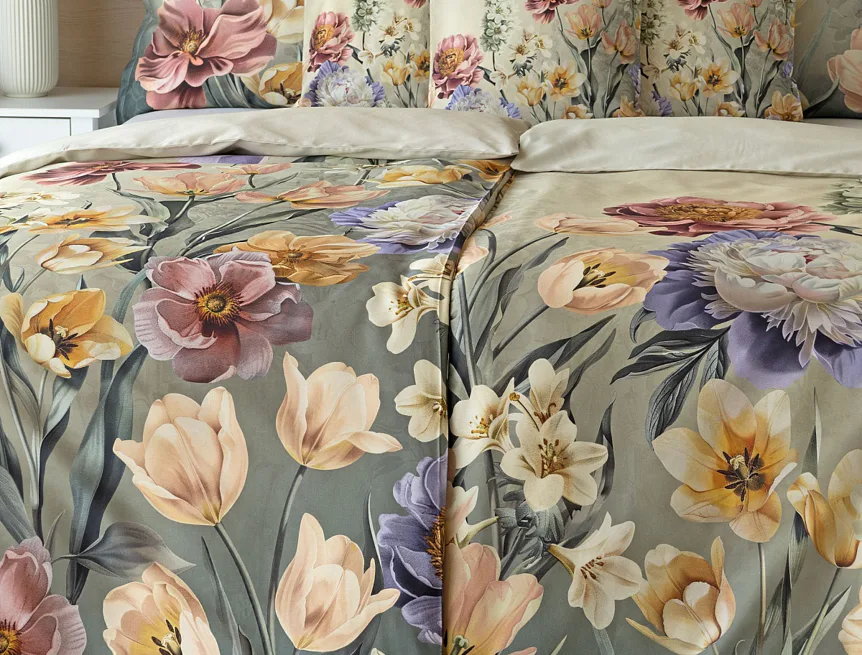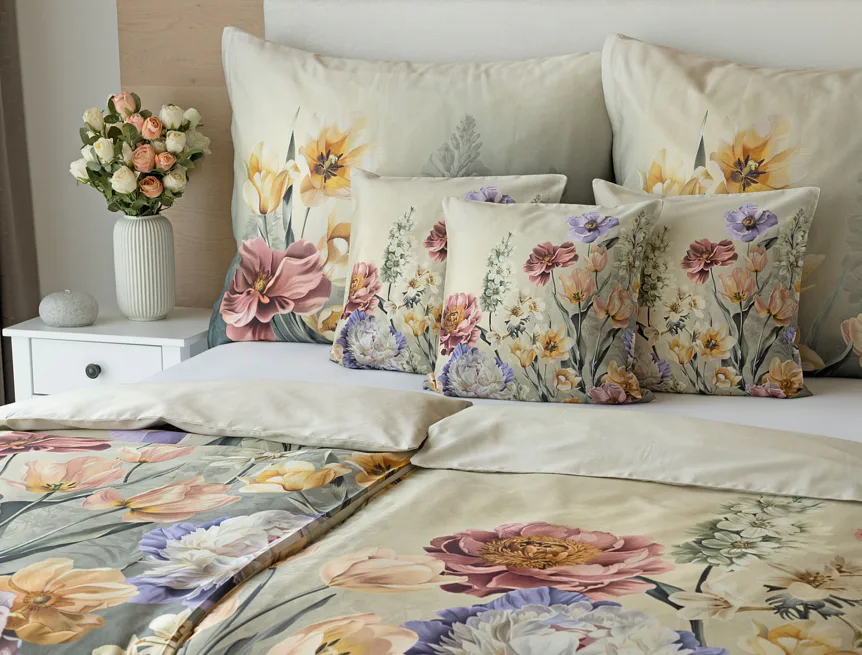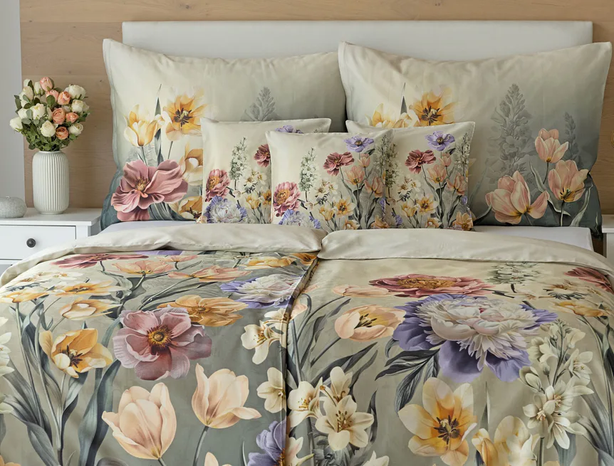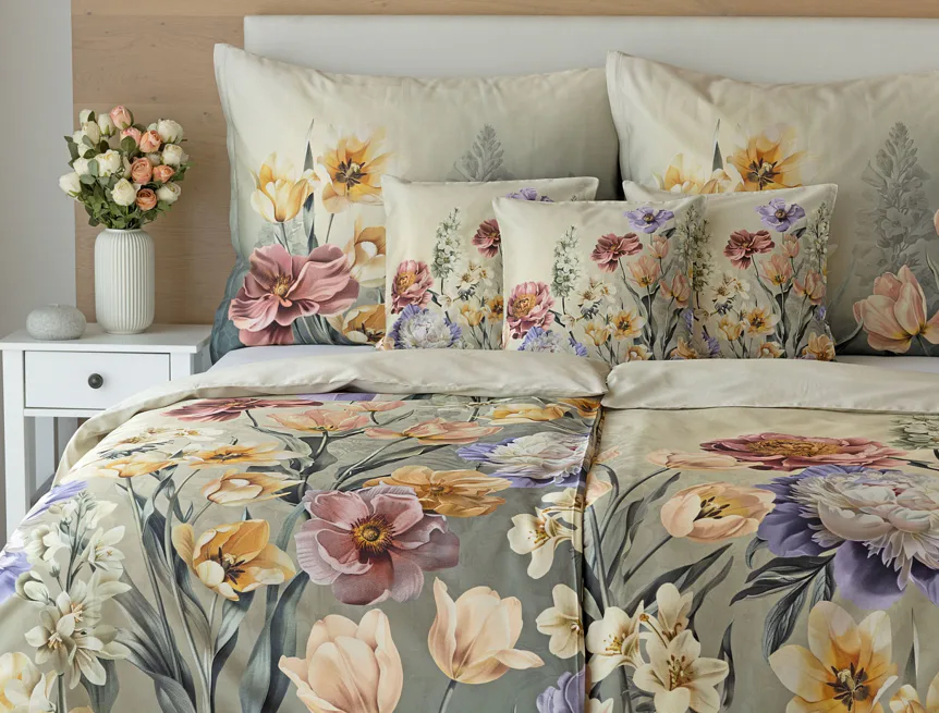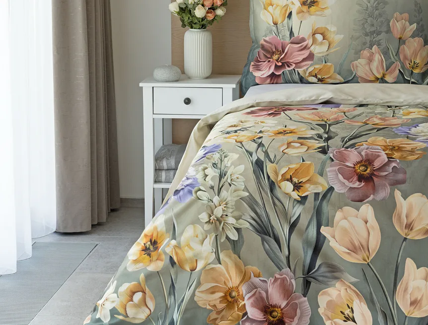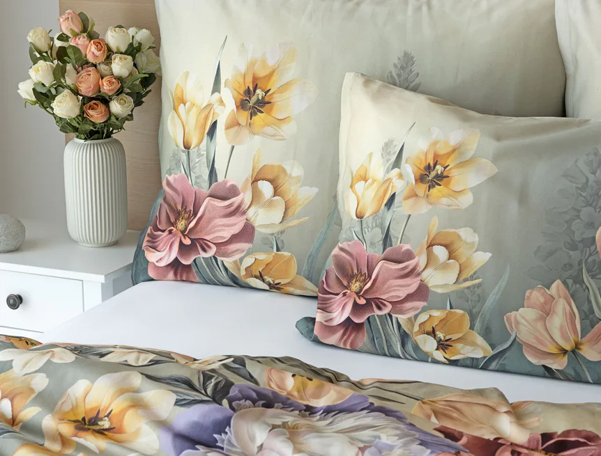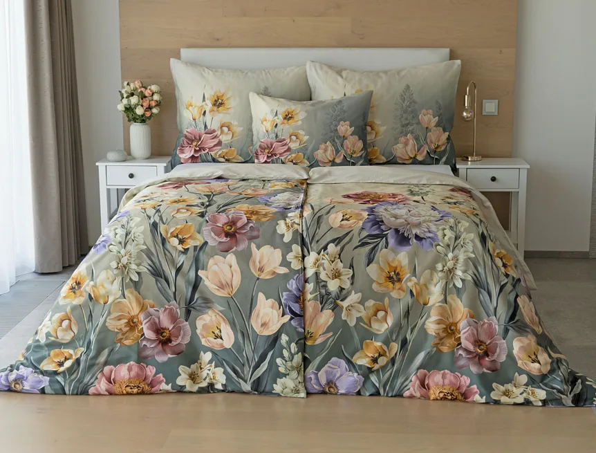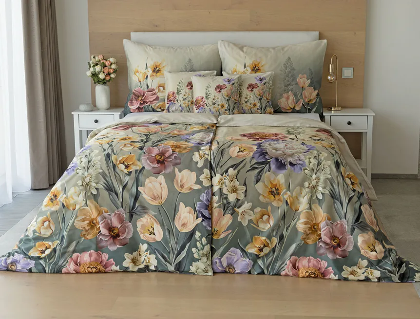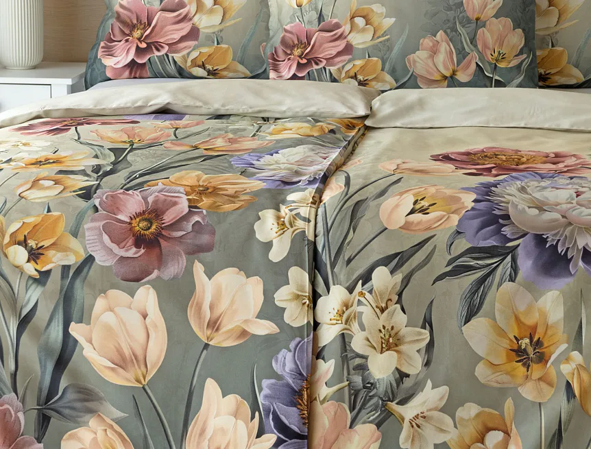 Se saténovým povlečením Elara vaše ložnice rozkvete do krásy. Barevné květy vlčích máků vynikají na modrozeleném podkladu, který přechází v horní části povlečení do tlumeného zelenošedého tónu. Díky nejmodernějšímu digitálnímu tisku vyniká květinový vzor v precizním detailu.