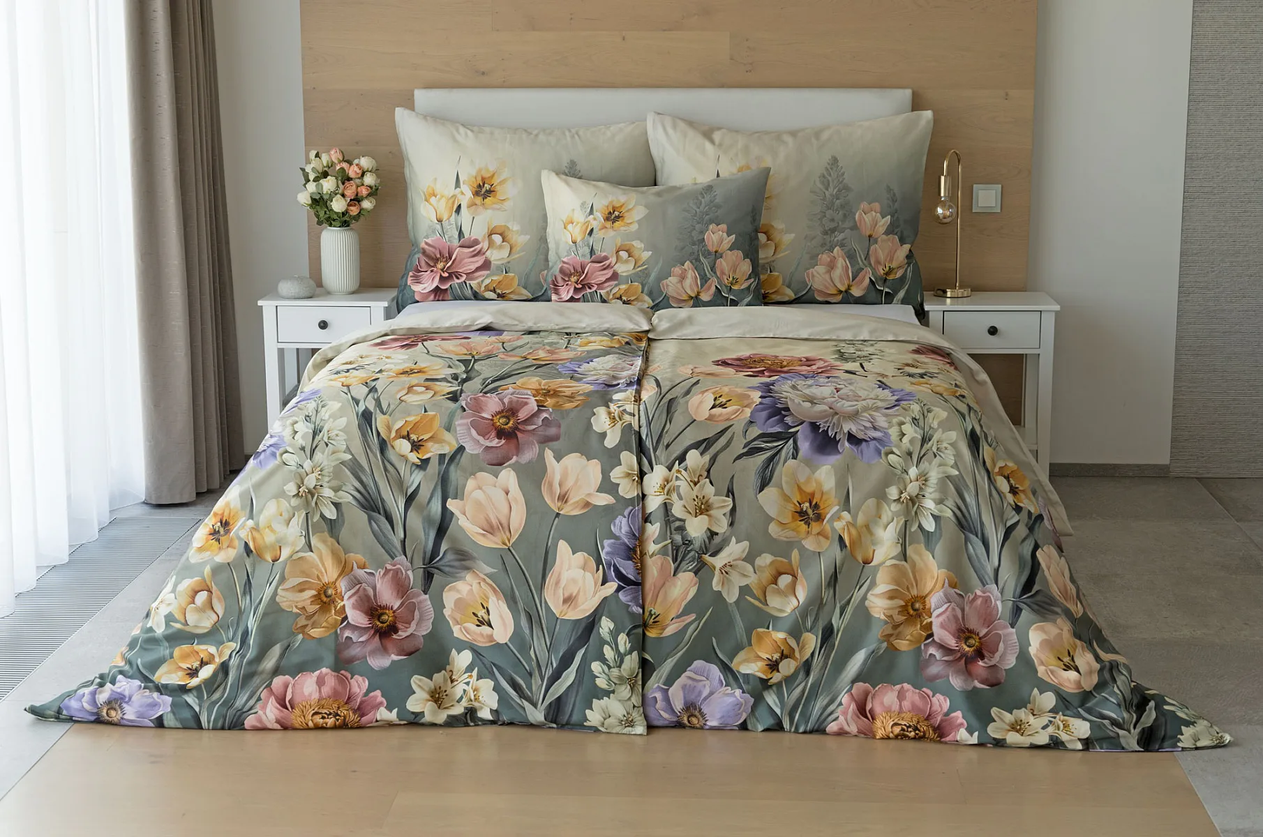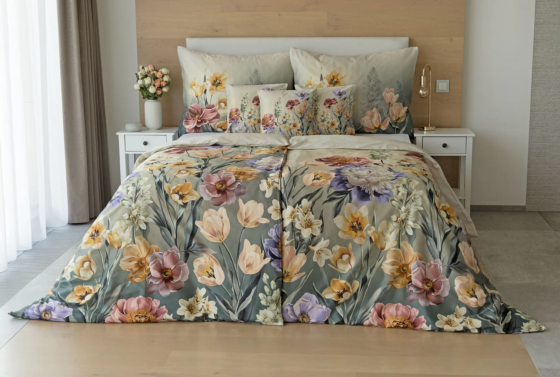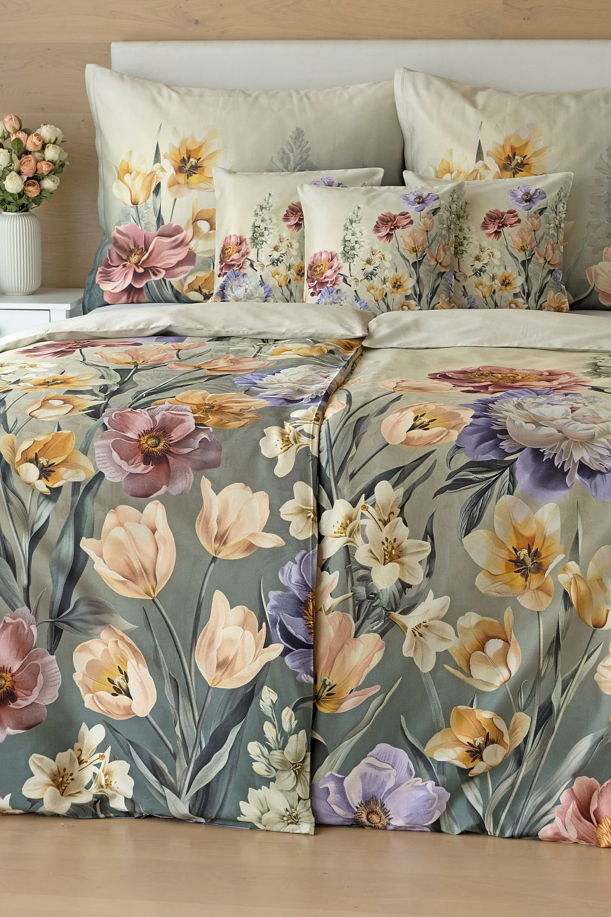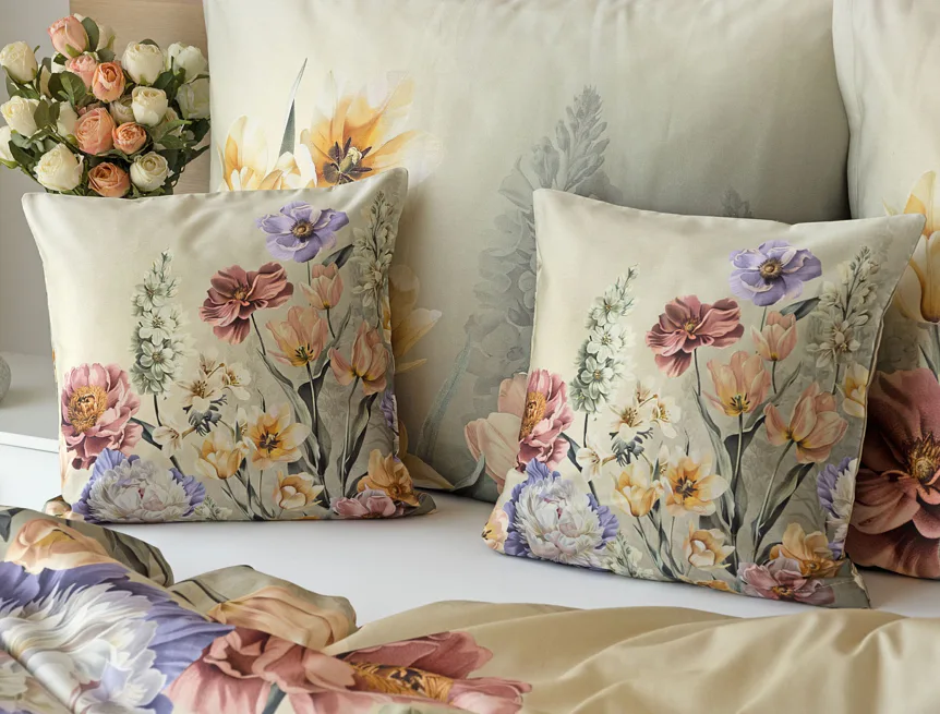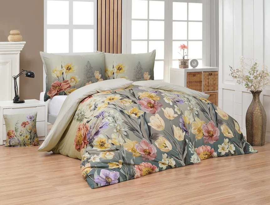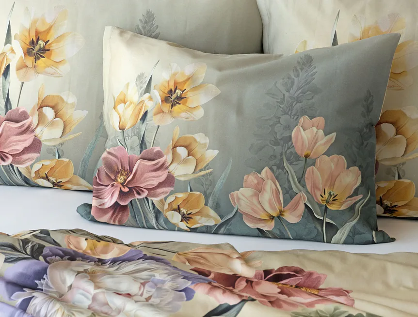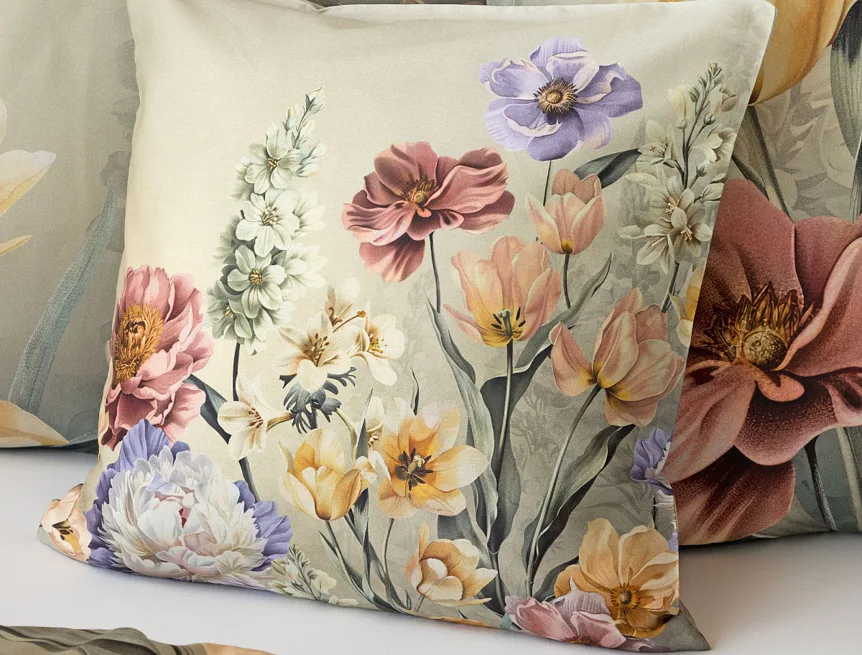 Se saténovým povlečením Elara vaše ložnice rozkvete do krásy. Barevné květy vlčích máků vynikají na modrozeleném podkladu, který přechází v horní části povlečení do tlumeného zelenošedého tónu. Díky nejmodernějšímu digitálnímu tisku vyniká květinový vzor v precizním detailu.