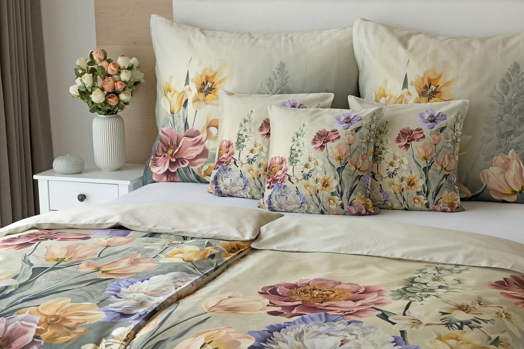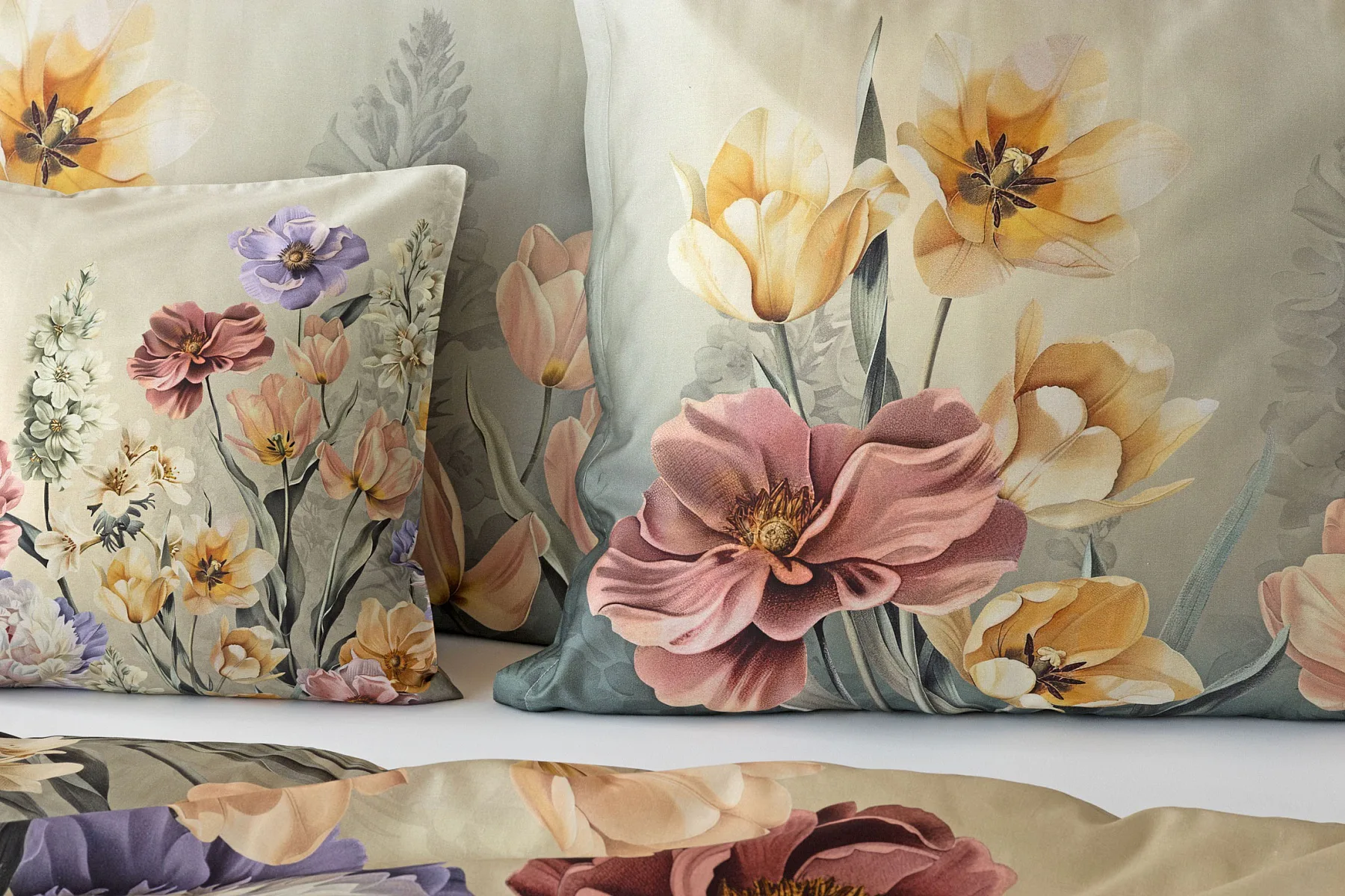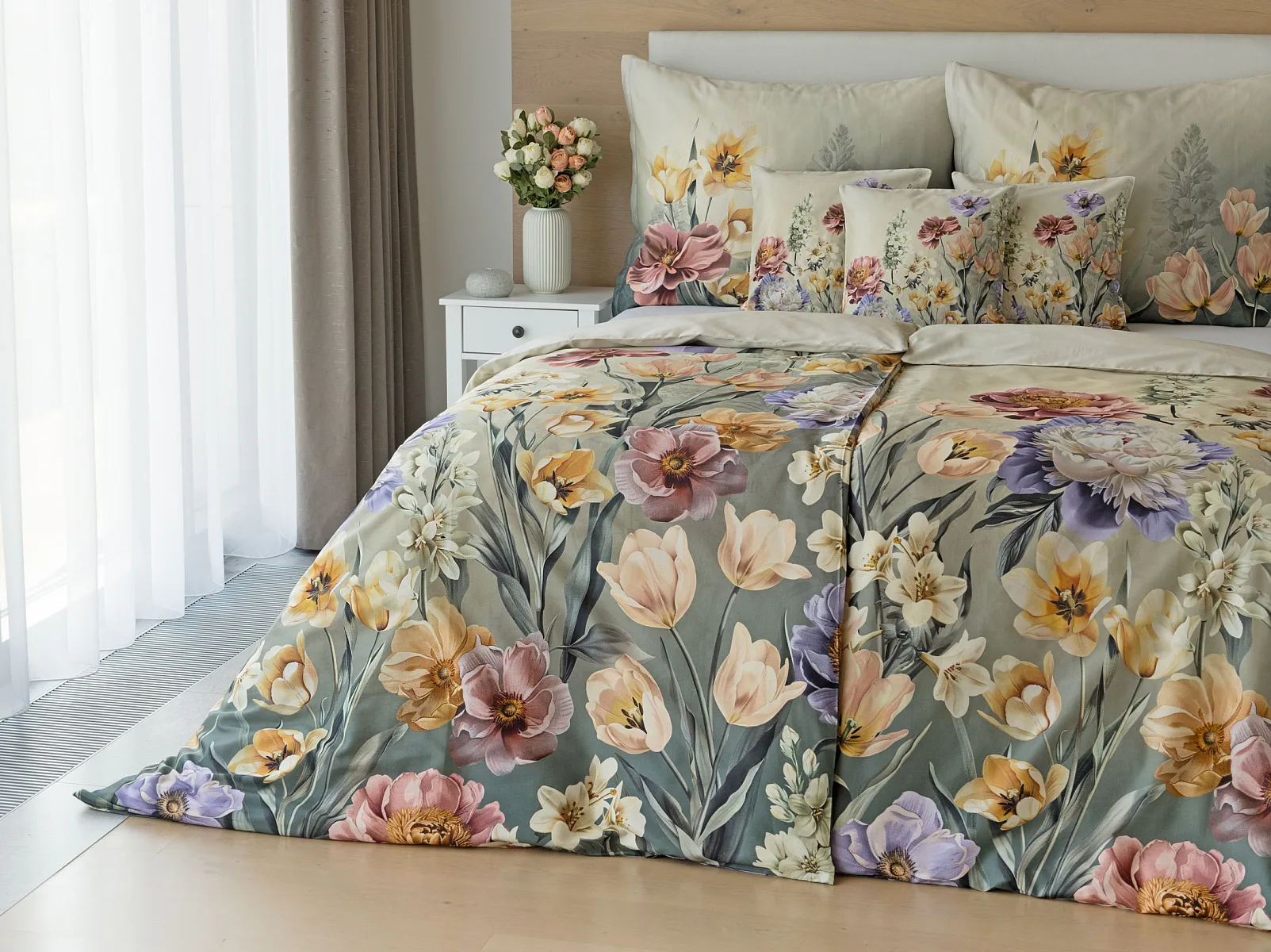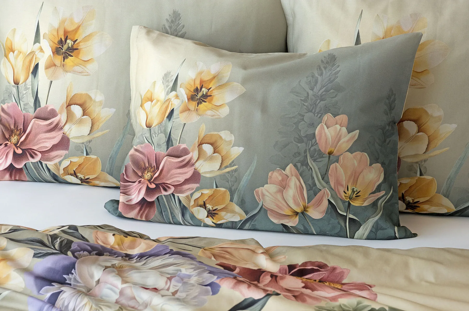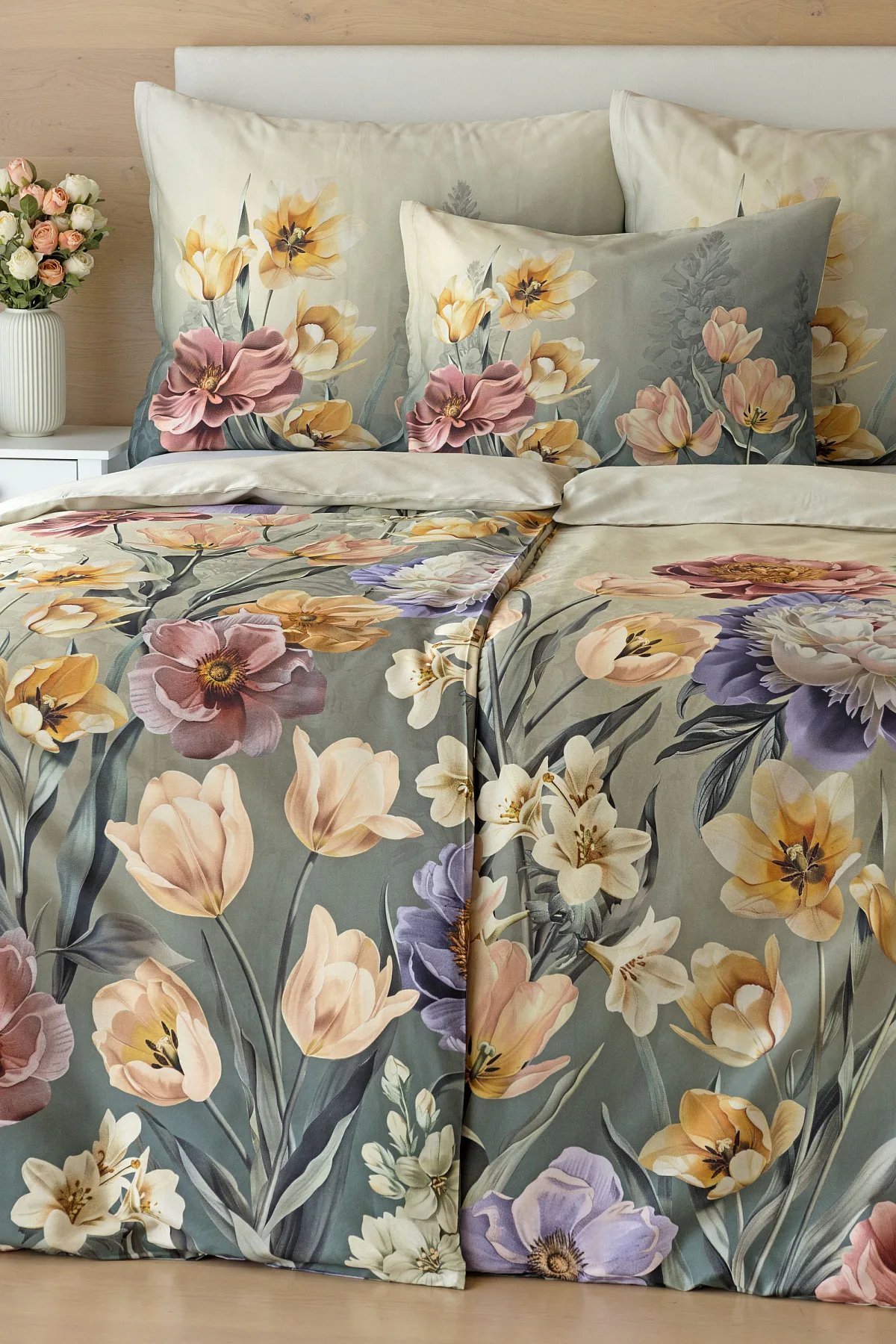Se saténovým povlečením Elara vaše ložnice rozkvete do krásy. Barevné květy vlčích máků vynikají na modrozeleném podkladu, který přechází v horní části povlečení do tlumeného zelenošedého tónu. Díky nejmodernějšímu digitálnímu tisku vyniká květinový vzor v precizním detailu.