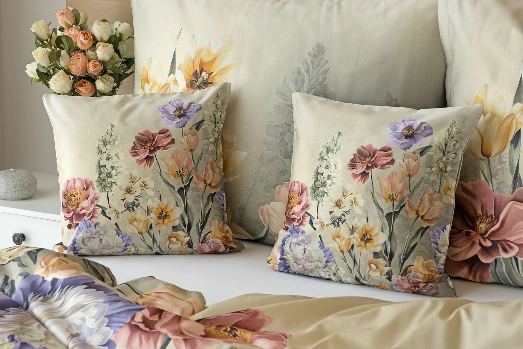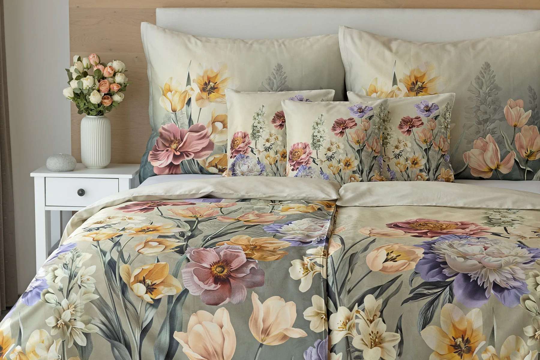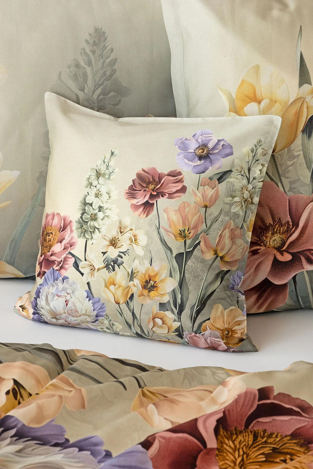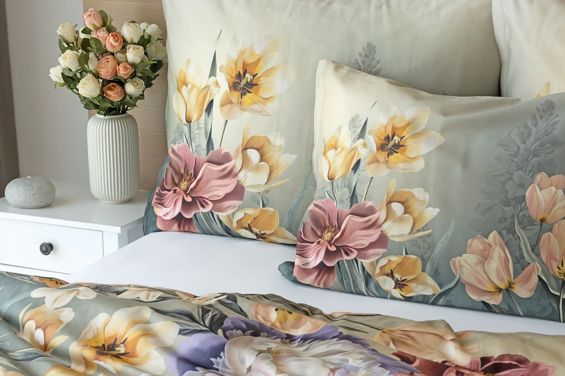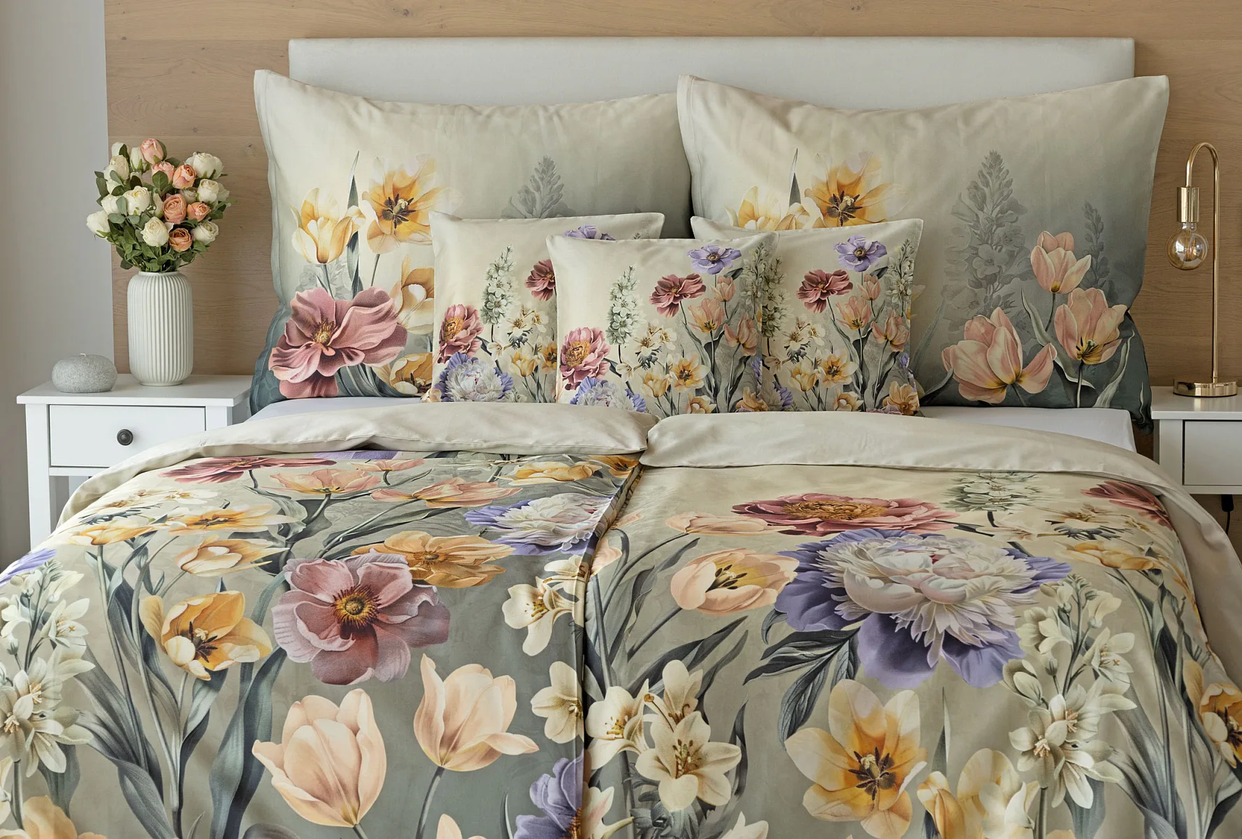 Se saténovým povlečením Elara vaše ložnice rozkvete do krásy. Barevné květy vlčích máků vynikají na modrozeleném podkladu, který přechází v horní části povlečení do tlumeného zelenošedého tónu. Díky nejmodernějšímu digitálnímu tisku vyniká květinový vzor v precizním detailu.