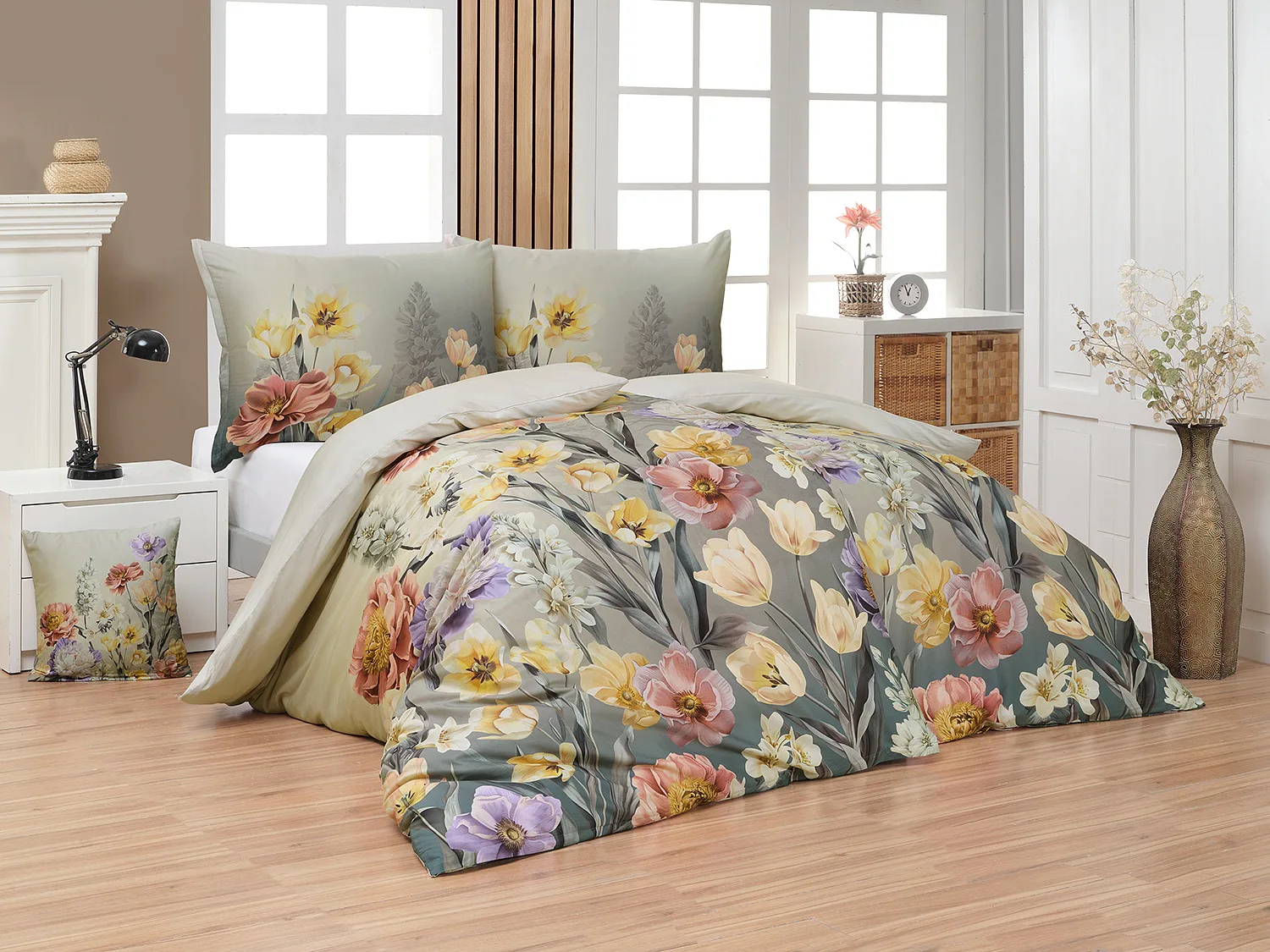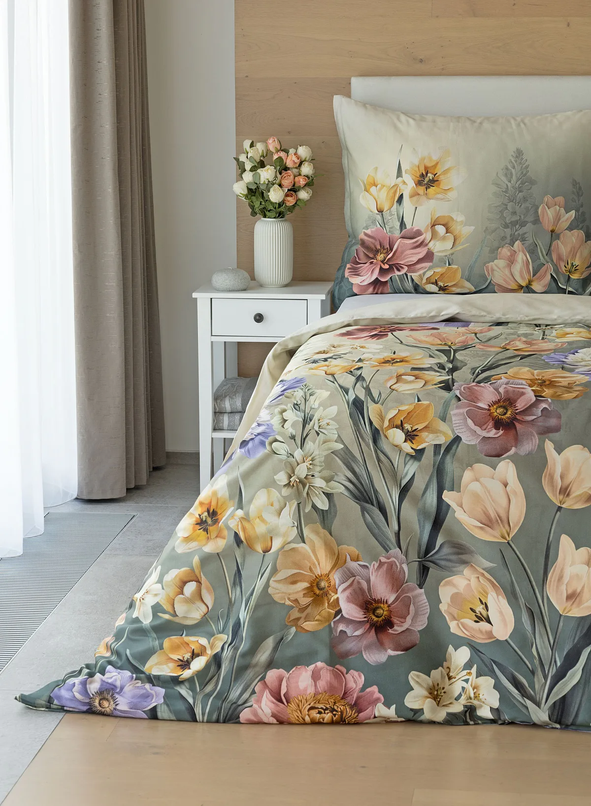 Se saténovým povlečením Elara vaše ložnice rozkvete do krásy. Barevné květy vlčích máků vynikají na modrozeleném podkladu, který přechází v horní části povlečení do tlumeného zelenošedého tónu. Díky...